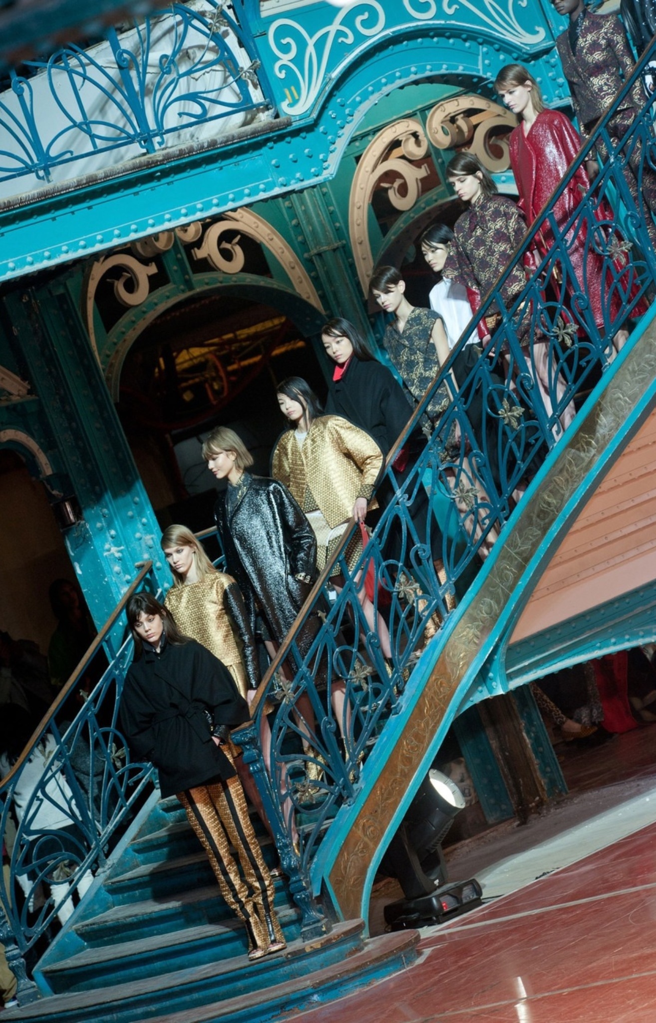 A destroyed theatre, with smashed windows and peeling walls, was filled with scruffy, pre-war chairs where the guest would seat. Something is going to happen. Then something amazing happens, that even Rihanna and Natalia Vodianova gasp with excitement. From under the dark curtain thats hanging above the scene, a 3-D installation of metallic skyscrapers and blue sky are coming out. And it’s of course all in Grand Palais!