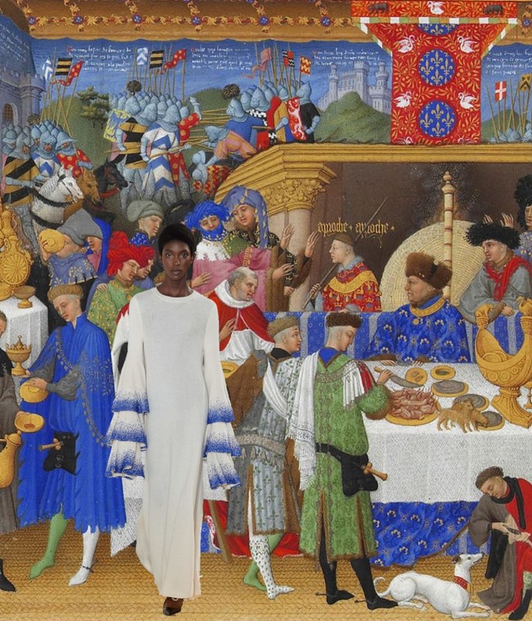 “Dressing to impress—I think that’s an exciting thing,” Jonathan Anderson declared backstage of his latest Loewe show. “Looking at building new types of silhouettes that can work in an abstract way. Trying to take a risk, maybe in my own self.” Taking risks is a trouble for many designers in Paris, so it’s great to see at least someone addressing that. What he began with – the volumized “entrance-making” shapes he showed in his JW Anderson collection in London – was followed through with inspirational conviction at Loewe. The collection at some points looked odd, but in a good, refreshing way. This line-up wasn’t obvious. What were these brocade dresses, gathered by Takuro Kuwata’s ceramic works? How to capture the shoulder-extending device from which caped-back sleeves were suspended? Anderson said he didn’t quite know exactly how he’d arrived at those ideas. “But sometimes it’s nice to feel vulnerable when you’re doing a collection – that you don’t know what the outcome is going to be before you start.” In pushing across the frontiers of the norm, Anderson relies partly on spontaneous curation. “Exaggerating by illusion” is one way he described the process. Yet the thing about Anderson is that his creative push is also part of his incredibly prescient long-term strategy to turn Loewe into what he’s called “a cultural brand” (he’s reconstructed it into a fashion home for the art-owning and gallery-going international clientele). This as well gets reflected in Jonathan’s fashion. Echoes of 17th century Spanish art – especially Zurburan and Velasquez – come in the subtle Spanish semiotics Anderson embeded in the collection. Maybe there was a hint of flamenco in the raw-edge tiers in a gray flannel coat and the triple-fluted sparkle-dusted sleeves of a ribbed-knit dress. But then, some of the dresses had volumes that made you think of medieval-wear we know from miniature illustrations.