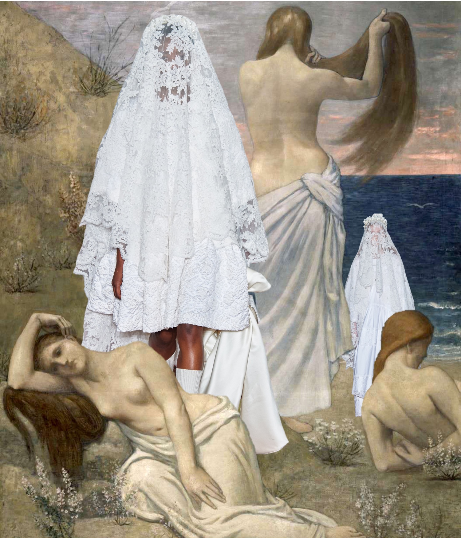 There was something beautifully sacred and mystical about Rocha’s collection. Ribbons and ties, fisherman’s nets, white lace and baptism-like cotton cloths, pearl details from head to toes… and of course the Aran knits. “Procession, baptism; birth, life, and loss,” began the designer. “It’s about the Aran Islands, the life there, and J.M. Synge’s play about it, ‘Riders to the Sea’.” The cream wool Aran pattern is the centerpiece of Rocha’s collection – the Irish stitch is world-famous, even though if originates from a tiny sprinkle of islands off Connemara on the country’s west coast. “It’s the color of the unbleached wool from the sheep there,”Rocha explained. An what about the slightly nautical feeling? In the past, people on the remote islands lived only on sheep and the proceeds of battling with the sea – Synge’s drama is about the tragedy and the resilience of a woman who has lost her husband and sons to drowning. Rocha is never afraid of the less optymistic themes for her shows. But somehow, they never appear heavy or dull. After the virgin-white looks, something darker began to flow in. Women in mourning, church rituals, priests, legends, and the Virgin Mary all became wound into this one. Rocha never had a religious upbringing from her parents at home in Dublin, “so I never made my first Communion, so I never got to dress up in the white frocks, though all the girls around me at school did. Maybe that’s why I’m obsessed, making up for it,” she said with a laugh. “Of course, you can’t look at Ireland and not be influenced a little bit by Catholicism.” As always with Rocha, I’m completely in love.