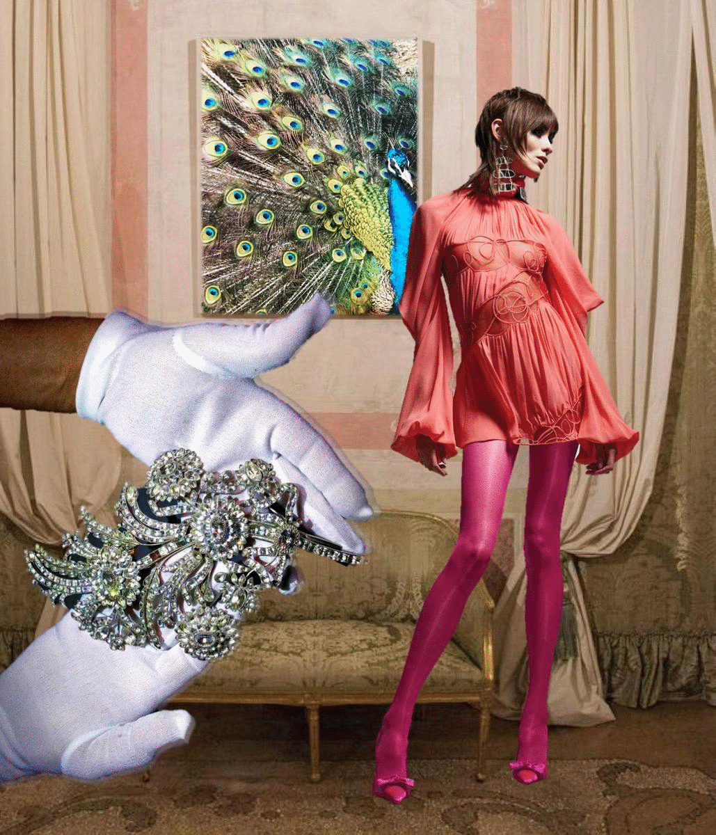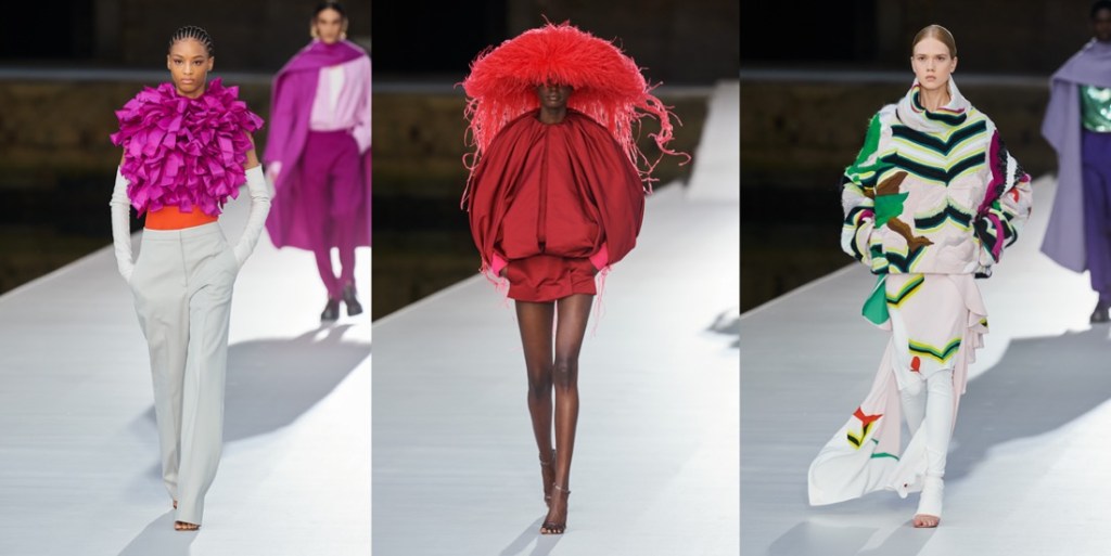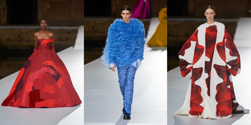 There were 84 looks in the show, and each one was a different proposition, from puffball micro minis, (shaded with Philip Treacy’s giant trembling ostrich frond hats that moved like jellyfish), to trapeze silhouettes, skirts that hit the mid-calf or hovered above the ankle, and slinks of satin and crepe cut to spiral round the body like affectionate serpents. From ball gown to micro mini the effect was one of commanding elegance. The fashion history sleuth will find echoes here of Madame Grès, of Cardin, and Capucci, as well as note taking from Mr. Valentino’s own magnificent oeuvre, but Piccioli takes these iconic moments of design history and makes them uniquely and persuasively his own. Also unique were the artist collaborations, curated by Gianluigi Ricuperati, who assembled a roster of 17 painters, including Jamie Nares, Luca Coser, Francis Offman, Andrea Respino, and Wu Rui. Art and fashion have often united in symbiosis – think of Warhol and Sprouse, or Schiaparelli and Dalí – but here the effect was a celebration of creativity, the hand, and of the nonpareil Valentino workrooms whose talented artisans evoked the source artworks through various cunning means. There were elaborate collages of textiles, for instance 46 in all for Look 6, Kerstin Brätsch’s The If, 2010, (as the Valentino show program notes helpfully noted, alongside the names of the craftspeople in the ateliers who have made them). Meanwhile, the five pieces by Patricia Treib, combined in the ballgown of Look 68, called for 140 meters and 88 different textiles, and took 680 hours to complete. On close inspection even the fine lines of Benni Bosetto’s pencil strokes (Untitled, 2020), that appeared to have been drawn directly onto the pale satin of Look 46, turned out to have been suggested by subtle hand-stitching (a stunning 880 hours of work, if you are counting). The ball gown and cape that closed the show, Look 84, were scrolled with motifs drawn respectively from Jamie Nares’s It’s Raining in Naples, 2003 and Blues in Red, 2004, requiring 700 hours of work, 107 meters of fabric, and custom screens for the hand-printing as it had to be done on such a large scale. The effect was appropriately magisterial. Summing up: total magnificience.
