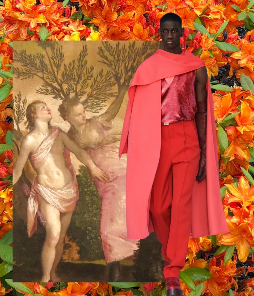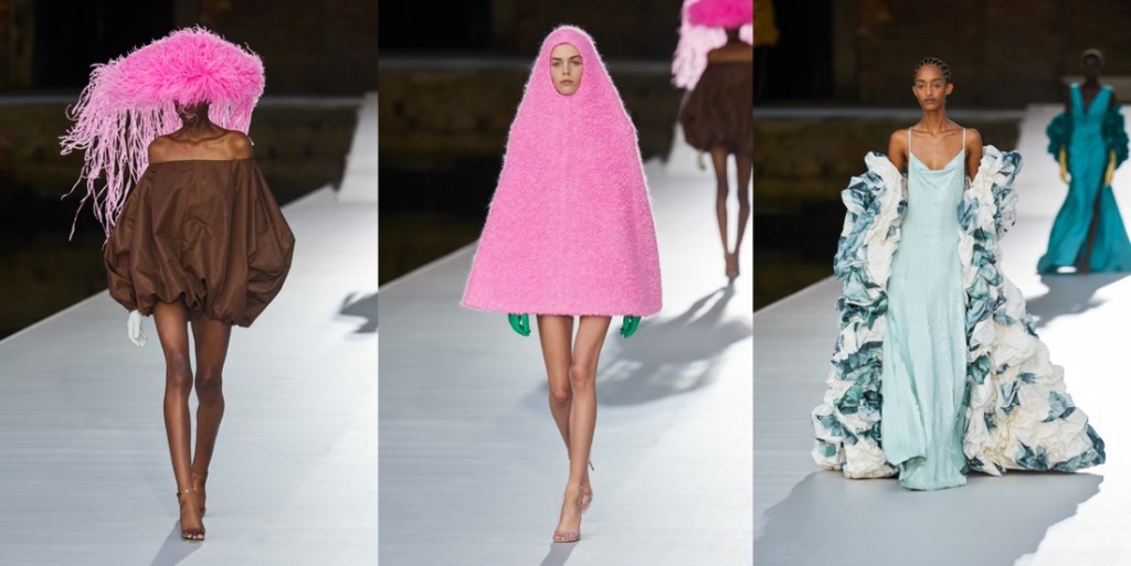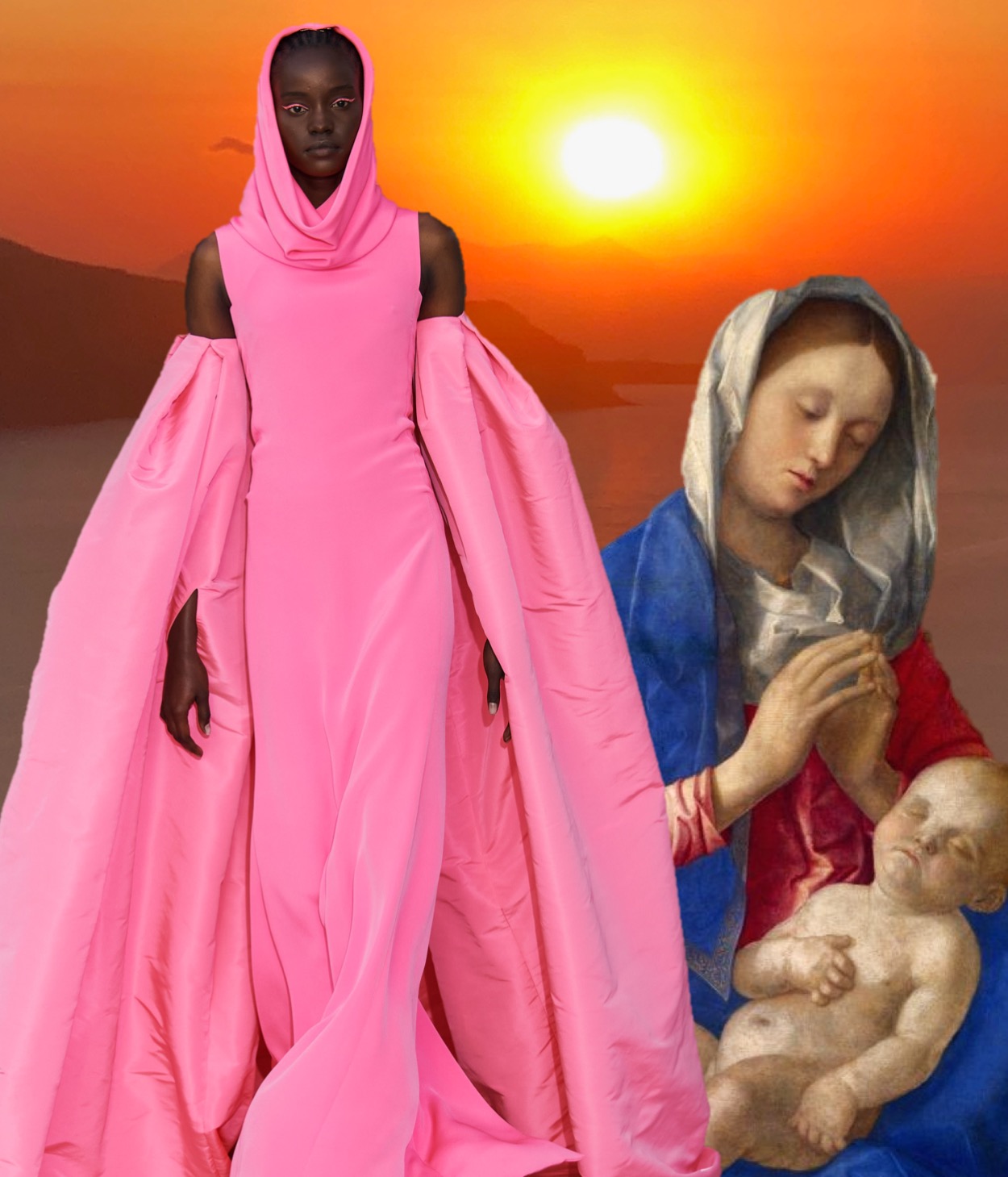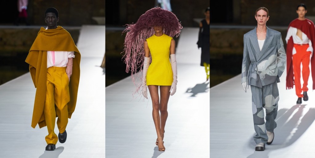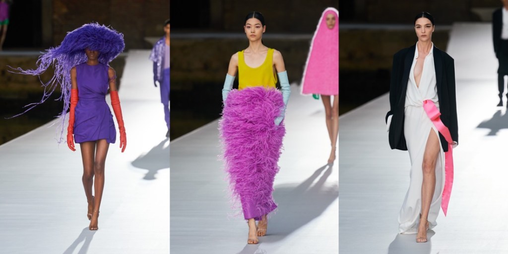 What a show. What a feeling. What a symphony. Celebration of great beauty. Valentino’s creative director Pierpaolo Piccioli set his sublime couture collection in the Gaggiandre, or ship building yard, of Venice. He was drawn to the place’s haunting beauty which he likened to a De Chirico painting with its arches and robust columns. In Renaissance times this place represented the hub of the city’s trading machine, a sophisticated production line that was said to churn out a boat a day. This being Venice and the Renaissance, of course the place – now part of the Arsenale where the city’s art and architecture Biennales are showcased – is as beautiful as it was once productive, having been built (between 1568 and 1573) by Jacopo Sansovino, one of Venice’s most revered architects of the period. Piccioli set his snaking runway under Sansovino’s soaring arches where the ships were once sheltered to be repaired, so that it appeared to float over the water. Guests were bidden to wear white. Luckily everyone did as they were told, and the effect, as the golden light of early evening streaked the water, the stone, tile, and brick, was undeniably poetic. To add to the spine-tingling moment, the collection was serenaded by the British singer Cosima, whose plangent voice gave a powerful twist to Calling You from the 1987 movie Bagdad Cafe, that opened the show. Piccioli brings the ultimate level of gasping wonder to fashion’s color wheel, setting flamingo pink, chartreuse, violet, cocoa, and mallard green ball gowns one after another, for instance. Or he might throw a raspberry double-face balmacaan over darker pink pants and an orchid pink crepe shirt, or a lilac cashmere cape over violet pants, frog green sequin t-shirt, and pea green gloves, and then ground the look with eggplant shoes with the heft of Dr. Martens. These last two ensembles, by the way, are part of the menswear offerings in the collection, in case you were wondering, and very persuasive they were too.