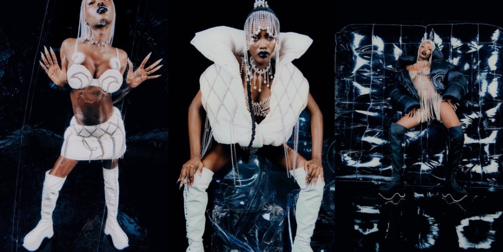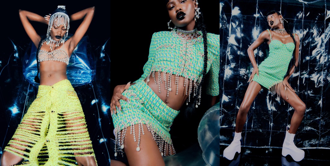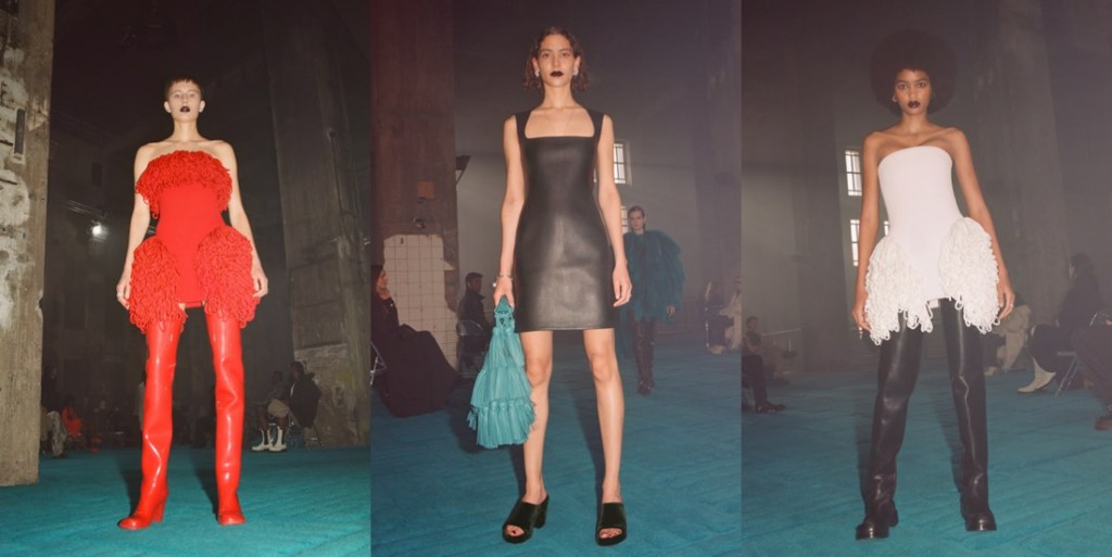 Area’s Piotrek Panszczyk and Beckett Fogg continue to push the envelope with their made-to-wear glamour. Since launching the brand in 2013, the designers have done so much introspection and recalibration that it’s hard to know if it’s the go-to brand for haute space bitches, haunting Dadaist ghouls, pop star glamazons, or former first ladies. Ask Panszczyk and he’ll answer that the label has always been for everyone but the clothes didn’t always show it, seasonally skewing in favor of one audience while cutting out the rest. Panszczyk and Fogg took 2020 to recenter themselves and their brand, choosing to show in season and to make salability and creativity equal parts of their process. Not either/or but both. As Panszczyk explained over a Zoom call, their shoppers have just as much desire for a couture-grade crystal pantie as they do a pair of crystal-studded jeans. To meet their needs, Area presented its own kind of solution dressing this season, injecting glamour into normcore and normalcy into high-gloss glamorama. Jeans enter the picture in a medium-wash straight-leg style adorned with crystals and paired with a bitchy little bustier. Tweed suiting is cropped and shrunken, with rhinestone fringe falling from hems. A classic LBD comes in vinyl, and the brand’s famous pale pink lamé returns in the form of iridescent minidresses, corsets, and skirts. Knitwear is growing too, with pink and lime pieces dotted with tiny crystal bows. This new Area wardrobe captures the vixenish nature of the label without compromising on wearability; exactly the branding exercise a company needs to push it from emerging to established. But Panszczyk and Fogg are smart to not let their good business sense totally overshadow the weirdness that makes Area special. During the pandemic they connected with Chinese designer Dingyun Zhang, whose enormous puffer jackets have also caught the eye of Kanye West and his Yeezy team. After a couple DMs, the trio decided to collaborate, cropping Zhang’s puffers into cloudlike vests, bralettes, and skirts, and then tamping them down with Area’s crystal harnesses. The results are delightfully kooky, heavenly, and sensual all at once. Area’s year of questioning has yielded some good answers.