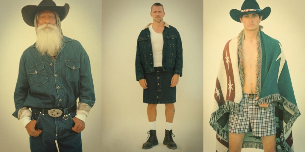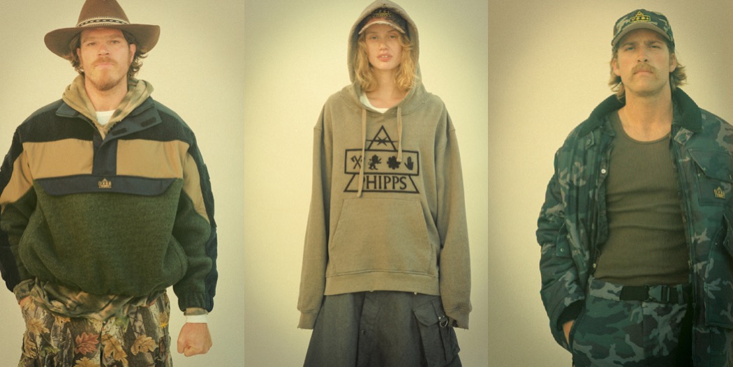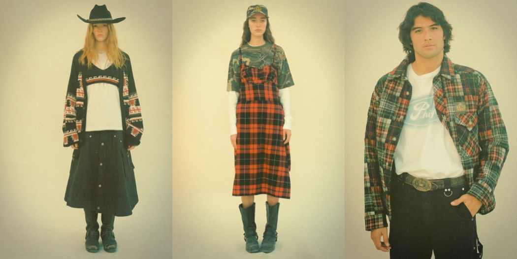 Phipps’s work is grounded in reality; he extracts elements of American subcultures—western, grunge, punk – and reimagines them through a contemporary lens modeled on a diverse cast of characters including real cowboys, bikers, and one multi-hyphenate jiu jitsu black belt-magician-guitarist. The designer ties the brand divisions together through cohesive design and layered styling. For the new season, the influence of Richard Avedon’s American West series came across in blanket capes and chap jeans crafted from upcycled leather scraps and vintage denim, whereas grommets and d-rings spoke to the influence of the ’50s teens in Karlheinz Weinberger’s photography. Standout pieces from the new womenswear included long, straight, slouchy jeans and a deadstock pullover anorak paired with a camouflage midi skirt. On the men’s side, there were “butch florals” in the form of camouflage patterns and subtle hieroglyphs representative of the four archetypes of masculinity – the king, warrior, magician, and lover. “We’ve always been doing our own thing and will continue to do so,” he said. “Our voice stood out in the Paris landscape and I believe the same will happen here, but with a bigger community.”