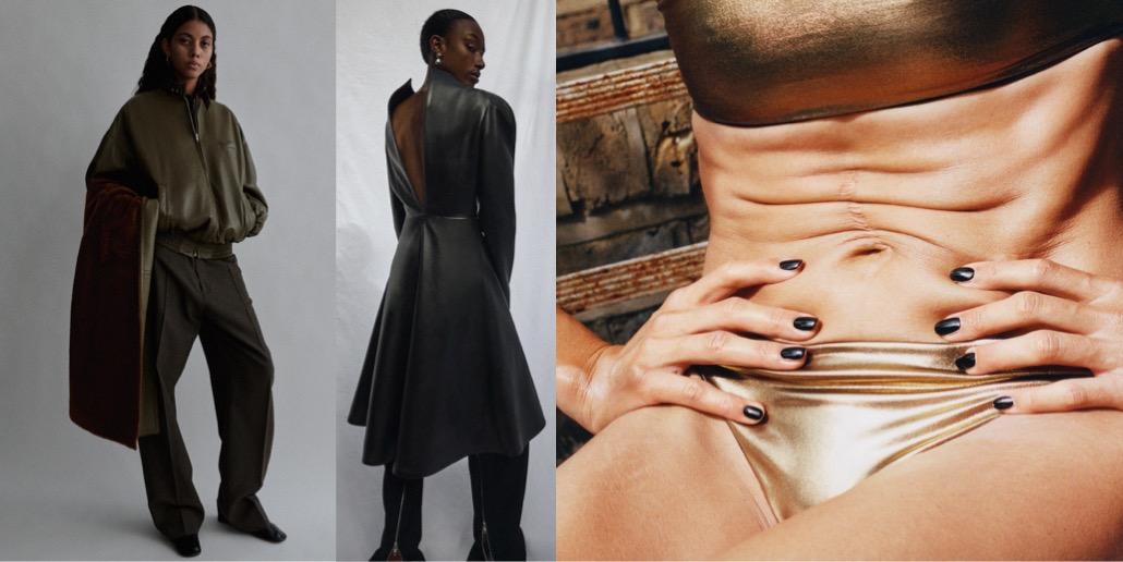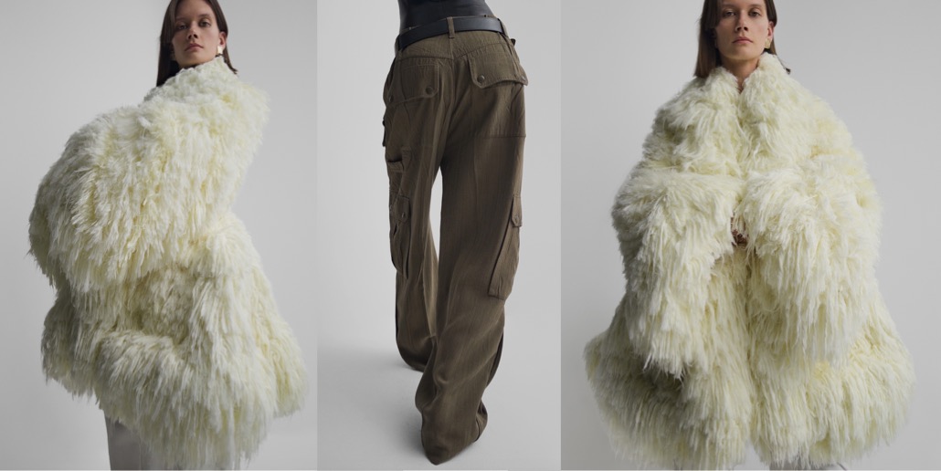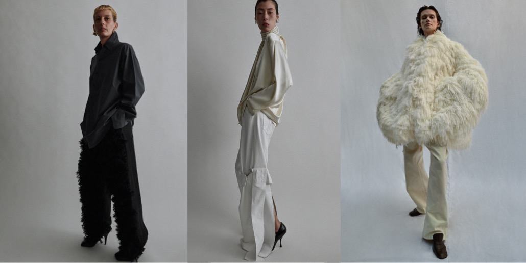 While other designers in New York get nostalgic about the 1990s, 70s, or 20s, Piotrek Panszczyk looked back a couple of thousand years, BC, for his latest Area ready-to-wear and couture collection. He’d been “thinking about prehistoric times and how pelts and bones were kind of the first things humans had to build an identity around. It started with this idea of the primal instinct that through the centuries morphed into desire, and then eventually a kind of excess and the life cycle of luxury.” The unsettling ambience of the fashion show, plus the inventive, at points bizarre “bone-y” silhouettes, eventually delivered one of the strongest and intriguing collections coming from the label in the last seasons. The idea was cleverly developed: there were “fur pelt” coats made from fur-printed denim in a variety of colors that delivered runway drama, fur-print, low-slung jeans, and a mini dress with bulbous little godets that spoke to Panszczyk’s commitment to offering real-world alternatives to fantasy. The collection’s highlight: models in big-shouldered jackets or slinky jersey pieces punctuated by beastly rips, the gold-embellished bones of their attackers still elegantly attached to their clothes.