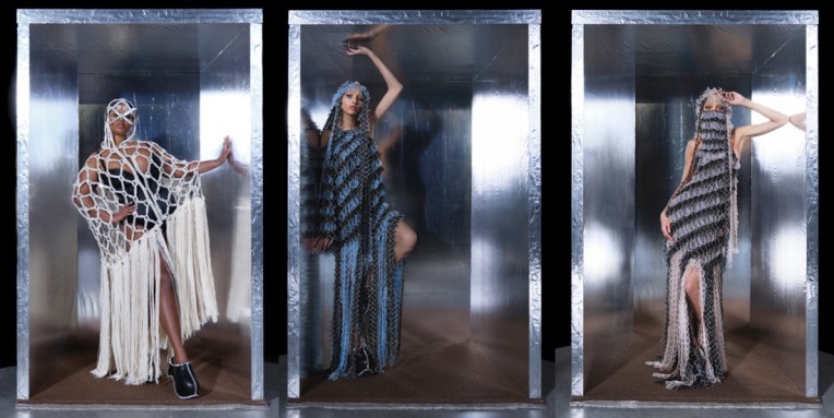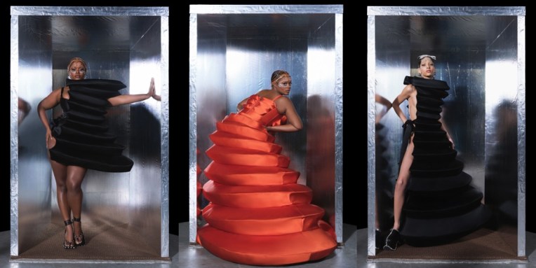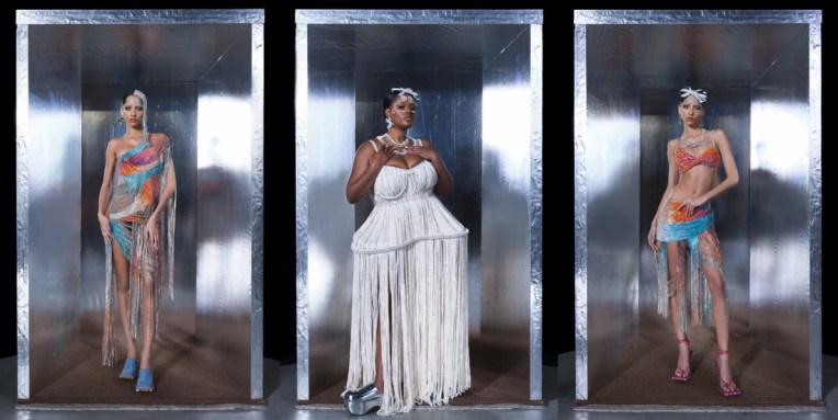 The eternal flora and fauna theme were Piotrek Panszczyk’s most obvious starting point for pre-fall 2022, taking hot pink duchesse satin and creating static floral poufs that could be sized up or down to create a crop top and mini skirt or an entrancing dress. Flowers also appear as spiked crystal tops and pasties, as sunglasses, as earrings, and as crystal pants that wind up the legs. Since Area’s last collection, its showgirl potential has become more fully realized; these experiments in fluttering crystal seem destined for Beyoncé, Olivia Rodrigo, Precious Lee, or any of the other larger-than-life women that swear by the brand’s devilishly saccharine clothes. Careful to not give it all away in a pre-collection, Panszczyk has balanced it out with sharpened tailoring in black, white, and brown houndstooth boasting crystal trim, as well as an extended section of leopard print pouf skirts and teensy bustiers. The disparate harmony of a blazers-to-pasties collection is justified by the Area books. According to Panszczyk and Area’s co-founder Beckett Fogg, the customer wants a crystal-strewn tee as much as she wants a Vegas-worthy headpiece. For seasons, Area has been reckoning with these two poles, daily use versus drama, but it seems the brand is on its way to a single more unified vision of something “dainty, natural, sultry, and thorny.” Per Panszczyk, “sexiness is just a byproduct of wearing Area.”