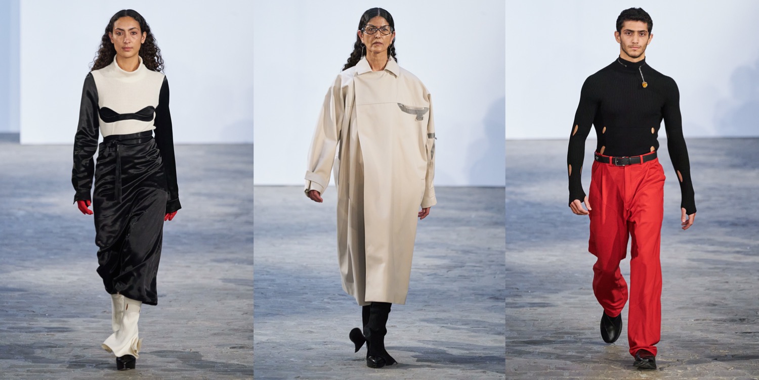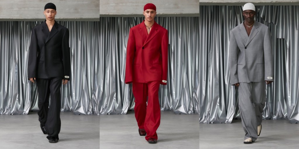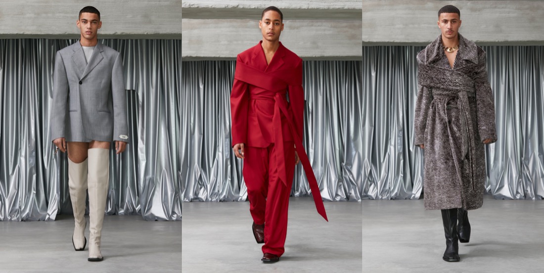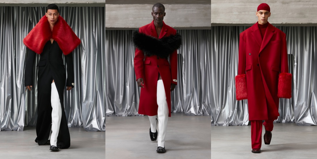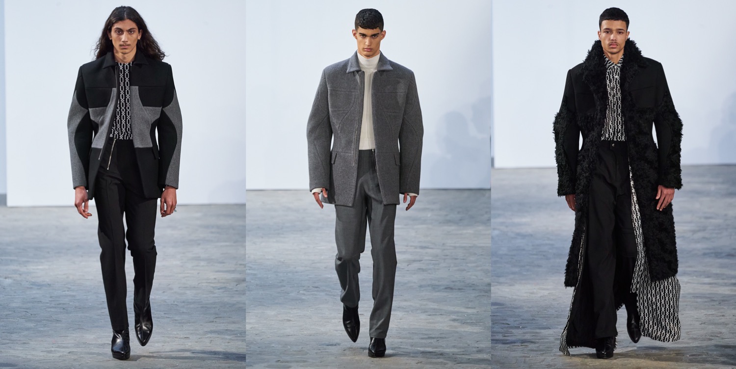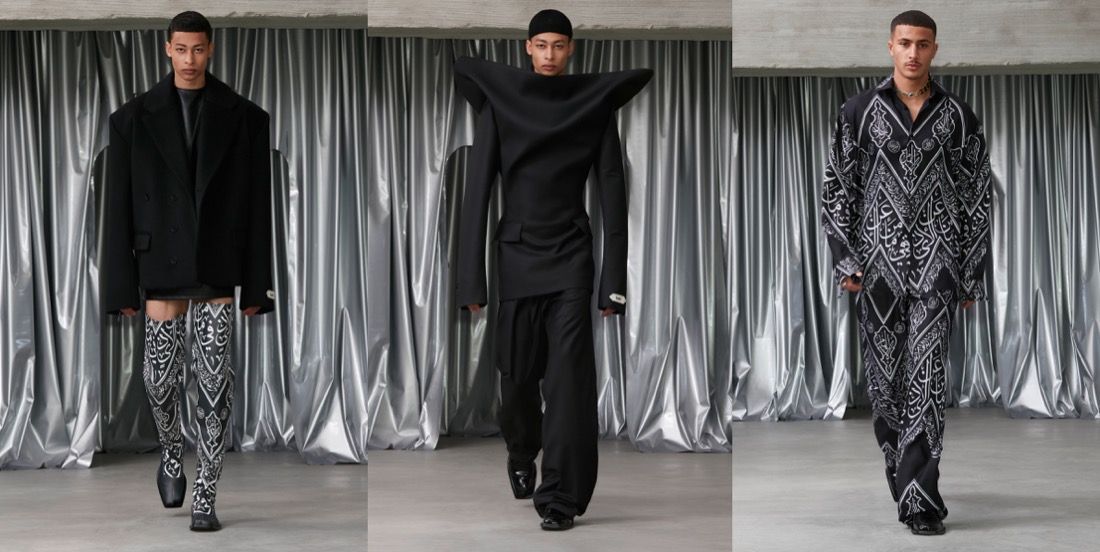 If Prada started the topic of statement outerwear for men this season, then GmbH joins the conversation with a major tailoring moment. Serhat Isik and Benjamin Huseby are perfecting the cuts of coats and blazers to a couture-level dimension. Take away the wonderful and brand-identifying regal strapping and fur and we are left with a soft 1.5 breasted jacket with a high lapel that fell loosely and beautifully down the body. When worn against the thigh-highs, these jackets’ skirting generated kink, but worn against pants they were differently but no less potently seductive. Let’s not forget about the extraterrestrial elements of the offering, like the disturbing alien shoulders and this sort of out-of-this-world drama conveyed by the garments (very “The Fifth Element“!). But the collection as well covers something much more personal to the Berlin-based designers. As Isik explained, it was the experienced tension between power and constraint in the atmosphere of their religious schooling as queer teenagers that prompted this season’s examination of wearable Islam-specific pieces such as the taqiya. The calligraphic Arabic was adapted from the talismanic exhortations, notes seeking protection that Ottoman soldiers would wear under their armor: Isik’s grandfather would write these out for the men of his village. “I think it’s all the codes we’ve been playing with since the start, just amplified. So you have the club kid, the flasher, the man who looks specifically Muslim. It’s the most formal collection we’ve ever done, but I feel it’s also the kinkiest and sleaziest in a strange way.” This collection definitely proves that Isik and Huseby’s first collection for Trussardi, which will be presented at Milan Fashion Week next month, is one to look forward to.