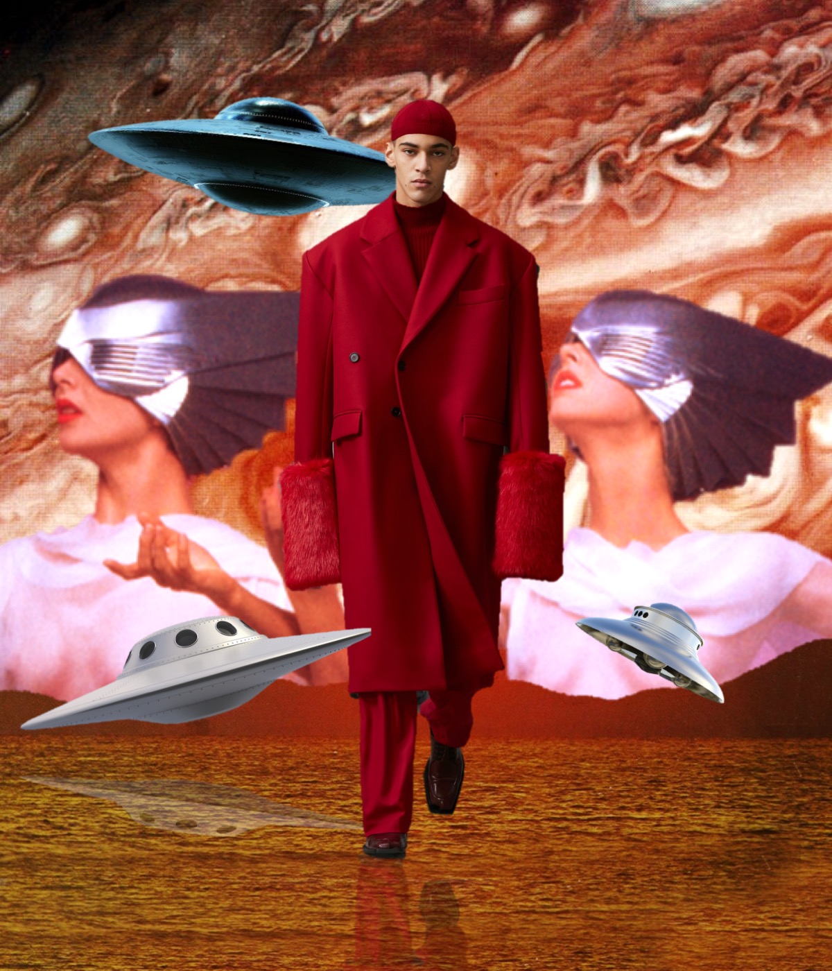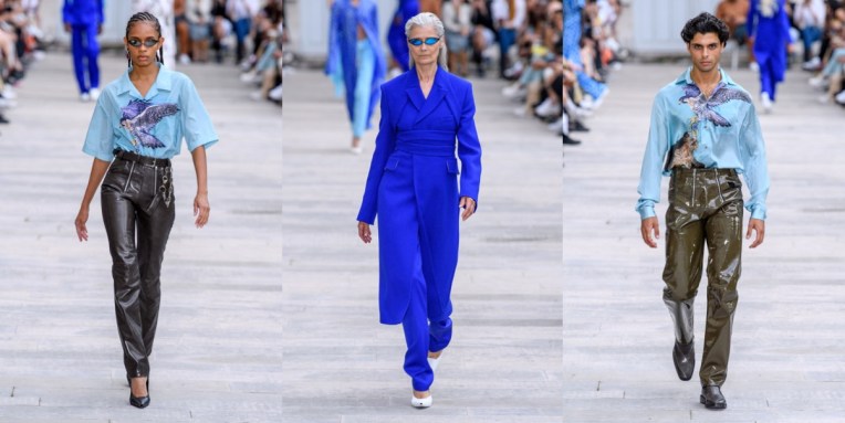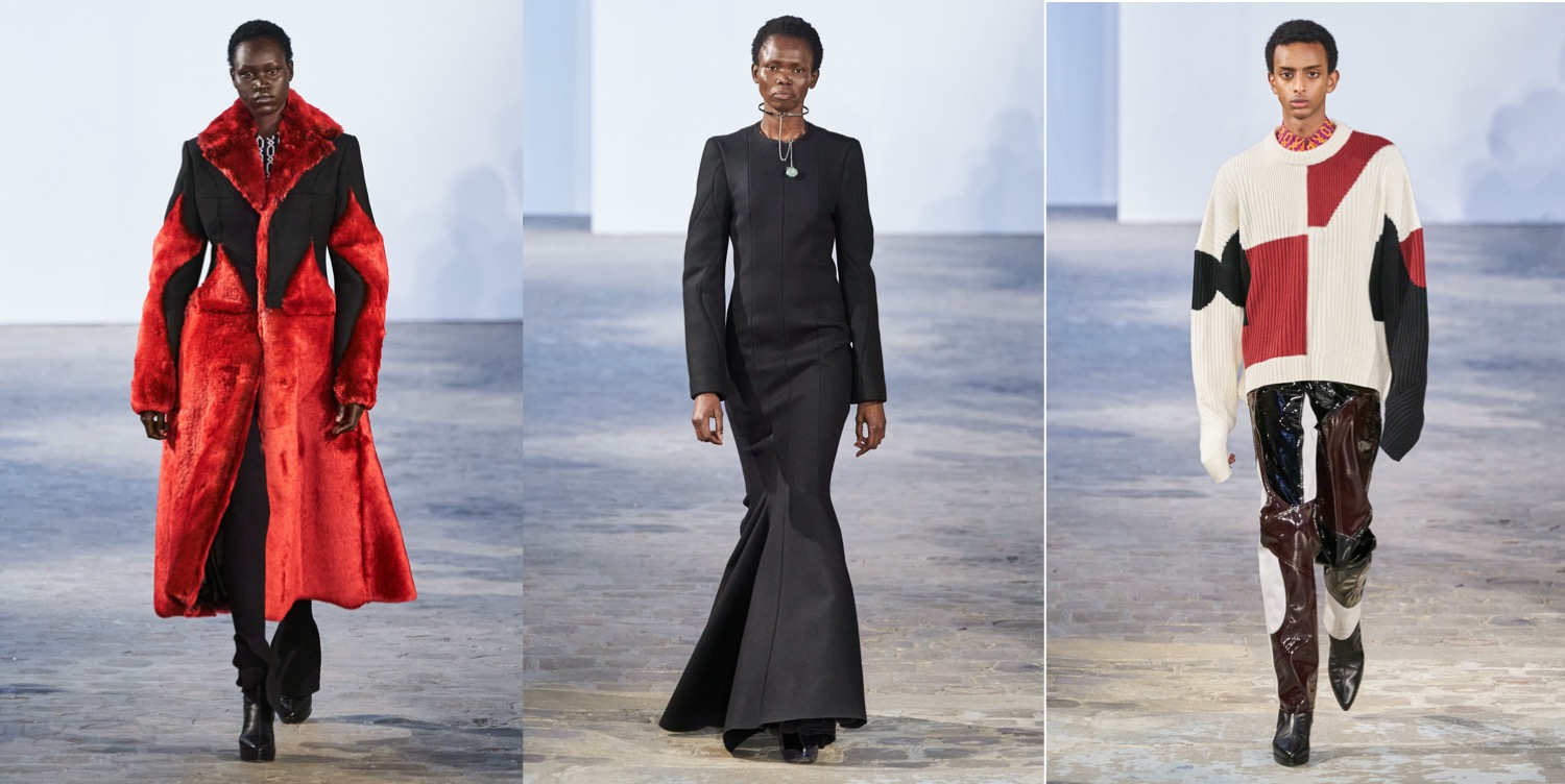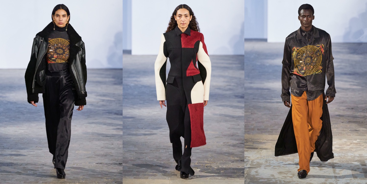 If Prada started the topic of statement outerwear for men this season, then GmbH joins the conversation with a major tailoring moment. Serhat Isik and Benjamin Huseby are perfecting the cuts of coats and blazers to a couture-level dimension. Take away the wonderful and brand-identifying regal strapping and fur and we are left with a soft 1.5 breasted jacket with a high lapel that fell loosely and beautifully down the body. When worn against the thigh-highs, these jackets’ skirting generated kink, but worn against pants they were differently but no less potently seductive. Let’s not forget about the extraterrestrial elements of the offering, like the disturbing alien shoulders and this sort of out-of-this-world drama conveyed by the garments (very “The Fifth Element“!). But the collection as well covers something much more personal to the Berlin-based designers. As Isik explained, it was the experienced tension between power and constraint in the atmosphere of their religious schooling as queer teenagers that prompted this season’s examination of wearable Islam-specific pieces such as the taqiya. The calligraphic Arabic was adapted from the talismanic exhortations, notes seeking protection that Ottoman soldiers would wear under their armor: Isik’s grandfather would write these out for the men of his village. “I think it’s all the codes we’ve been playing with since the start, just amplified. So you have the club kid, the flasher, the man who looks specifically Muslim. It’s the most formal collection we’ve ever done, but I feel it’s also the kinkiest and sleaziest in a strange way.” This collection definitely proves that Isik and Huseby’s first collection for Trussardi, which will be presented at Milan Fashion Week next month, is one to look forward to.