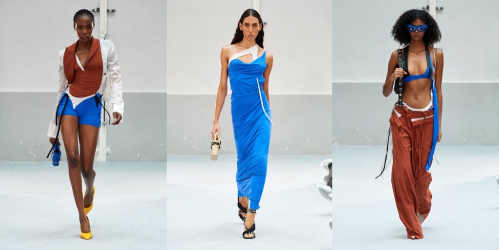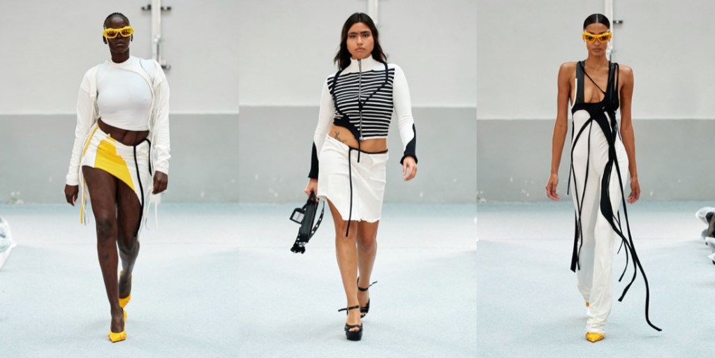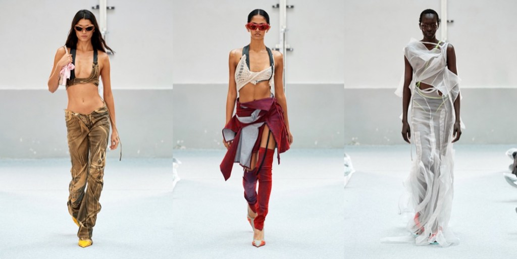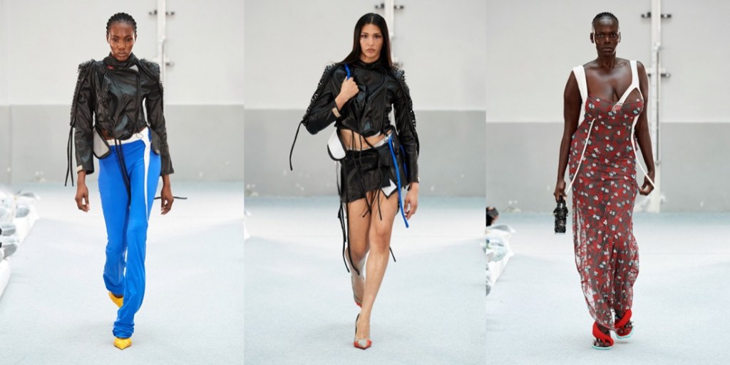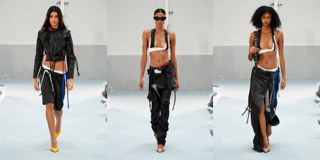 Ottolinger designers Christa Bösch and Cosima Gadient opened their spring-summer 2023 fashion show with a sharp look: a deconstructed belt–meets–bra top whose straps covered the nipples and little else, paired with low-slung leather-look trousers made from recycled polyester. Gen Z’s love of near nudity knows no bounds, and the fan base that lounged on the show venue’s mattress seats wearing skin-baring looks from the Berlin-based label would think nothing of wearing a crop top to talk shop. The designers recently launched a pre-collection that they said had allowed them to tackle more conceptual ideas in their runway shows. No longer beholden to showing denim and mesh dresses, which are their big commercial hits, this freed them up to present deconstructed biker jackets and skintight bodysuits. Ironically, though, the strongest pieces were arguably the most commercial, especially the dresses that draped and hugged the body with some rubbery-looking embellishments. Dipping items in rubber is a trait that reads recognizably Ottolinger: The punked-up court shoes, which saw a classic pump wrapped in a futuristic rubber-like casing, were as covetable as the diamanté jewelry dipped in brightly colored rubber that currently sells well on the label’s website. They’d do well to continue hammering home those codes as the Y2K trend keeps rolling and numerous other labels look to replicate their success with the sexy and the skintight.