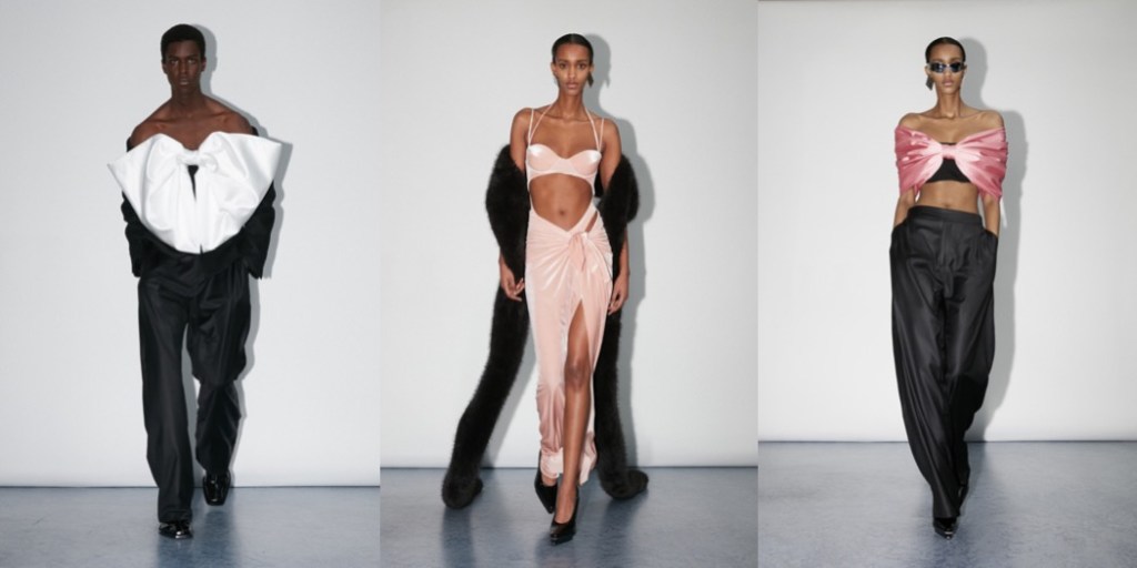 For autumn-winter 2023, Huseby andIşık tried something new at their label. Nothing says couture more than an oversize bow, and there was more than one of them – as well as stoles and streamers – in the GmbH collection, which might be described as a study in atonal glamour. The lookbook pictures are a world away from the smoky, dark setting of the performance the designers staged in Paris with the help of friends from their hometown. Dancers from its city ballet performed to the live music of Labour, using gestures to convey elegance through different lenses. Their glitch-like movements referenced both the hauteur of ’50s couture and its reclamation by marginal communities in the ballroom (vogueing) and drag cultures. At GmbH changing the focus from personal history and trauma to fashion history was, noted Huseby, “a way of finding freedom with fashion for us.” Added Isik: “I also think we are really interested in challenging ourselves with taking on full-on glamour because it’s not something that we’re necessarily associated with, or even so comfortable with.” No jitters were revealed in this confident collection, which the designers said included references to Yves Saint Laurent and Azzedine Alaïa. Many signature silhouettes were back, such as the short coat dress, but it was transformed – and transformable – with streamers that could be tied tight to bound the corset or fly free, with a train-like sweep. The off-the-shoulder bow tops in velvet or with big bows were especially unexpected takes on menswear. Huseby and Isik have been recontextualizing womenswear tropes in menswear since the beginning, but it hit different within the “couture” framework of this collection.