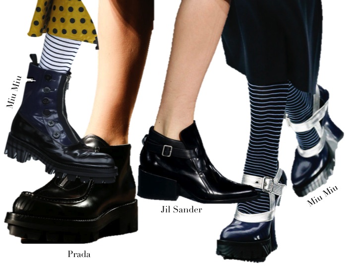 This season is definetly theirs. Nothing will stop them this Winter, even Tom Ford’s fairy-tale thigh high boots with hand made embroideries. Well, Tom Ford would throw up if he would heard that the famous club footed giant clobs with rubber soles would be gesting his runway. But still the inner beauty soul of mine still loves Tom’s creation… but this is not the thing. Fashion giants like Prada, Stella McCartney and Jil Sander together with a plague of young british designers are just crazy about them. Masculine inspired shoes, so called boots nowadays have lots of not too kind nicknames- mammonthly elevatedm tractor tread shoes. But why do women love them. Easy answear- they are simply ugly. Sounds strange, but yes dear female readers, there is now a new fashion era of ugliness- from wearing furkenstocks on feet to mixing prints and colours, that in the past would not even make it in the cheapest pubs. But now they are the ones that are most photographed on street styles and in magazine editorials! Boots are now the most WANTED on women’s wishlist. The next point of their amazingness is their comfortable state (no heels, wedges, mid heels, killer heels, strange ropes etc.) and practically! Now you shall were it everywhere! Even on a MET Gala during the Punk trend. Yes. Punk. Punk also made boots for women more popular. Punk was a controversy. Punks wore boots everywhere. “Normal” people in times of Punk massive attack were saying that it’s so disgusting… And now it’s the most worn shoe for almost ten seasons.