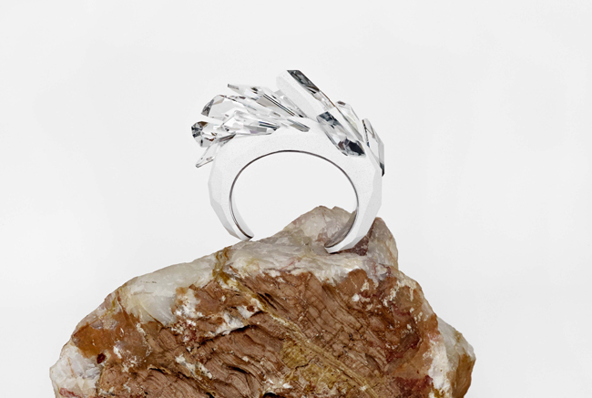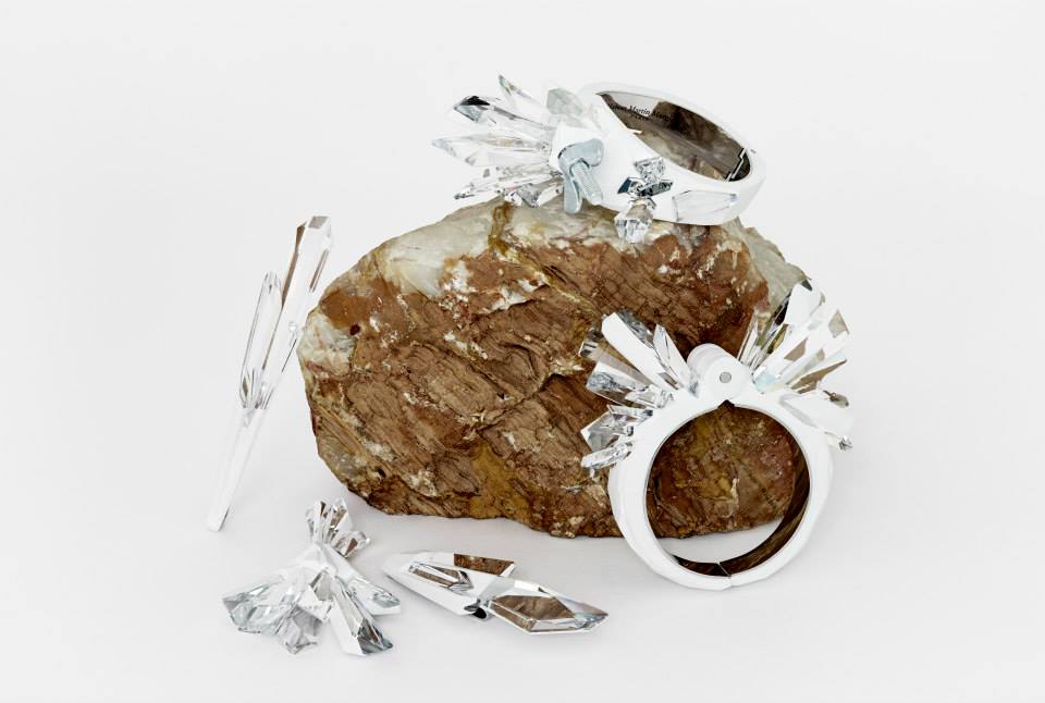 At the Maison Martin Margiela X Swarovski collaboration during the MMM couture show, I was shocked how much phisics and science can change fashion. These crystal elements attached to the latex boots and bracelets are not simply sticked with glue- no, on this occasion, Maison Martin Margiela did in fact debut something completely new. They worked with Swarovski and their new Crystalactite technology to create pieces of jewellery that glinted at you on the catwalk as cuffs clasped around shiny riding boots. The new innovation in the fact that it’s the first time Swarovski have fused crystal and white resin together without the use of glue creating a hybrid material that looks like it might have naturally grown that way over time. Margiela was the first ever house invited to such experiment and used inspiration from stalactites formations (hence the hybrid name) grown in caves. NOW AVAILABLE at COLETTE