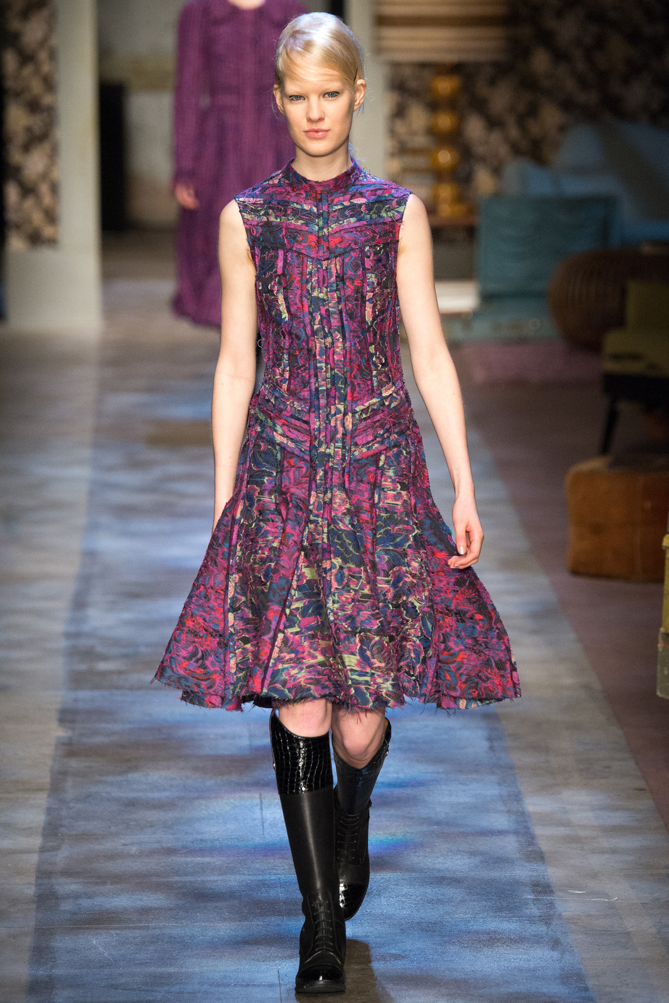 Beautifully embroidered dresses styled with horse-riding boots? Definitely yes. That’s a cool masculine touch in a very feminine area. And it really makes the whole look great and not so banal. This season, the British “Valentino-aspiring” designer, Erdem Moralioglu, brings British aristocrat’s daughter to the world of hunting and romance, giving her not only fancy floral dresses, but croco-patent boots. She shows a bit of nipples, she exposes her shoulders. The new character of Erdem’s woman is curious and intriguing… and she’s not scared of covering a magnificently embroidered skirt with a burgundy turtleneck.