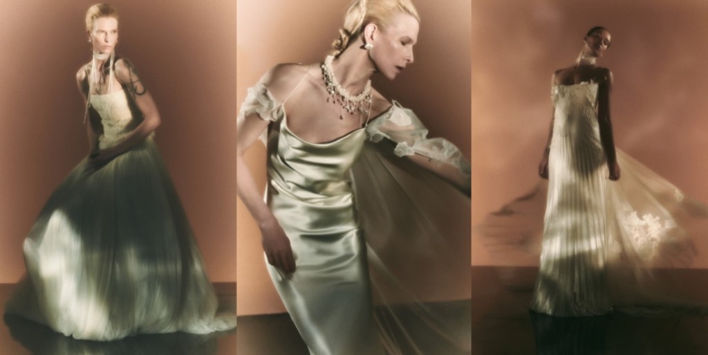 Take the micro-pleated dress that swishes and swirls around the body, like flowing water. Except this isn’t a styling trick; the micro-pleats in the dress are actually hundreds of micro-bones holding the shape. Then, there’s the hand-painted silk chiffon made in collaboration with a French artist who moved in to Frankel’s New York atelier for a few weeks and created a breath-taking, impressionistic floral gown in dark green as well as the hand-painted organza cocoon worn by Kristen McMenamy in the lookbook.
