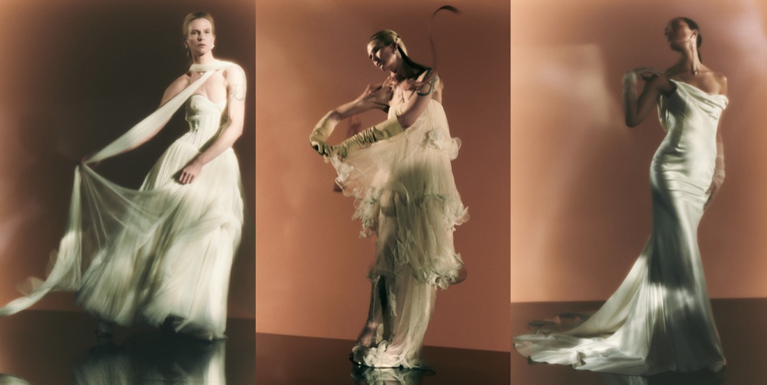 Take the micro-pleated dress that swishes and swirls around the body, like flowing water. Except this isn’t a styling trick; the micro-pleats in the dress are actually hundreds of micro-bones holding the shape. Then, there’s the hand-painted silk chiffon made in collaboration with a French artist who moved in to Frankel’s New York atelier for a few weeks and created a breath-taking, impressionistic floral gown in dark green as well as the hand-painted organza cocoon worn by Kristen McMenamy in the lookbook.