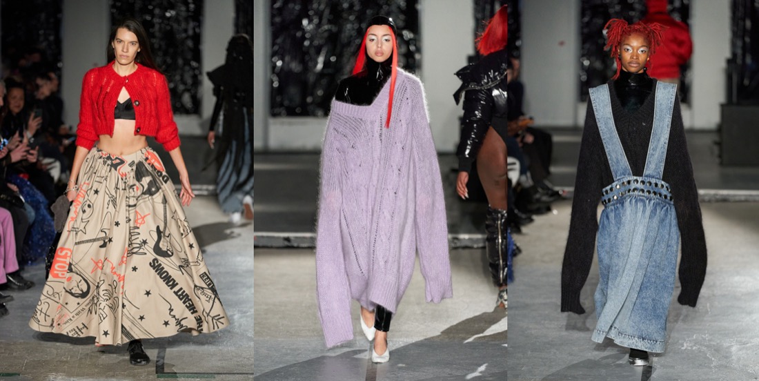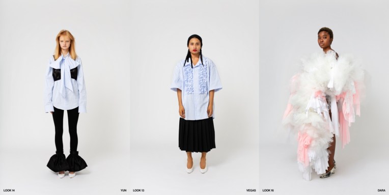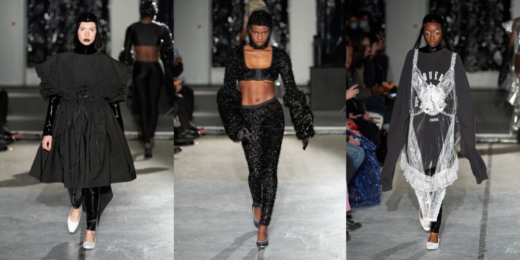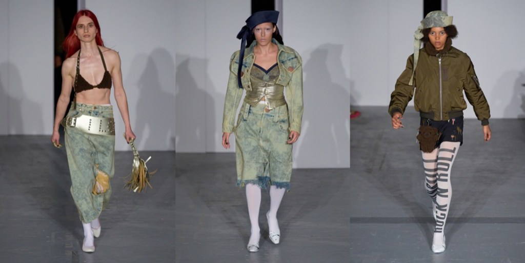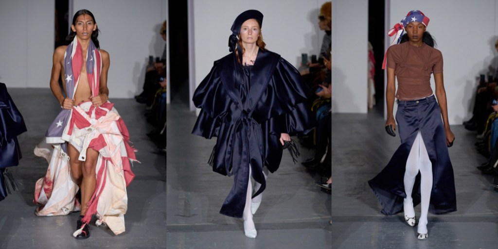 Five years ago, with bold attitude and confidence, Vaquera started out in New York and quickly became the most-talked about and hard to classify emerging brand in town. In 2022, the brand opens Paris Fashion Week and is backed by Dover Street Market, and yet it’s still difficult to put a finger on it. Patric DiCaprio and Bryn Taubensee aren’t doing conventional, mainstream fashion, but somehow manage to keep their avantgarde-ness commercially attainable: think great, over-sized jackets and too-cool-to-be-true denim. “We’ve really been pushing toward having more commercial clothing and that is still really important to us,” Taubensee said backstage of the spring-summer 2023 fashion show. “But it’s also important to remain true to what we did this for, which is expressing ourselves.” Enter American flag dress, made from faded flags that were stolen by DiCaprio’s friends from houses on Fire Island, its construction more ambitious than the one from their debut. A deconstructed wedding dress – safety-pinned at the bodice, spliced down the middle, and worn over pink stretch satin athleisure and denim cut-offs – once belonged to DiCaprio’s mom. They aren’t likely to put these pieces into production, but they are representative of the Vaquera spirit, which is irreverently anti-establishment. That irreverence came across in metallic “polo” shirts stitched with a lassoing cowboy instead of a mallet wielding polo player. Meanwhile, the acid wash denim’s faint yellow cast came from what Taubensee described as soy stain; “we actually use soy sauce,” she explained.