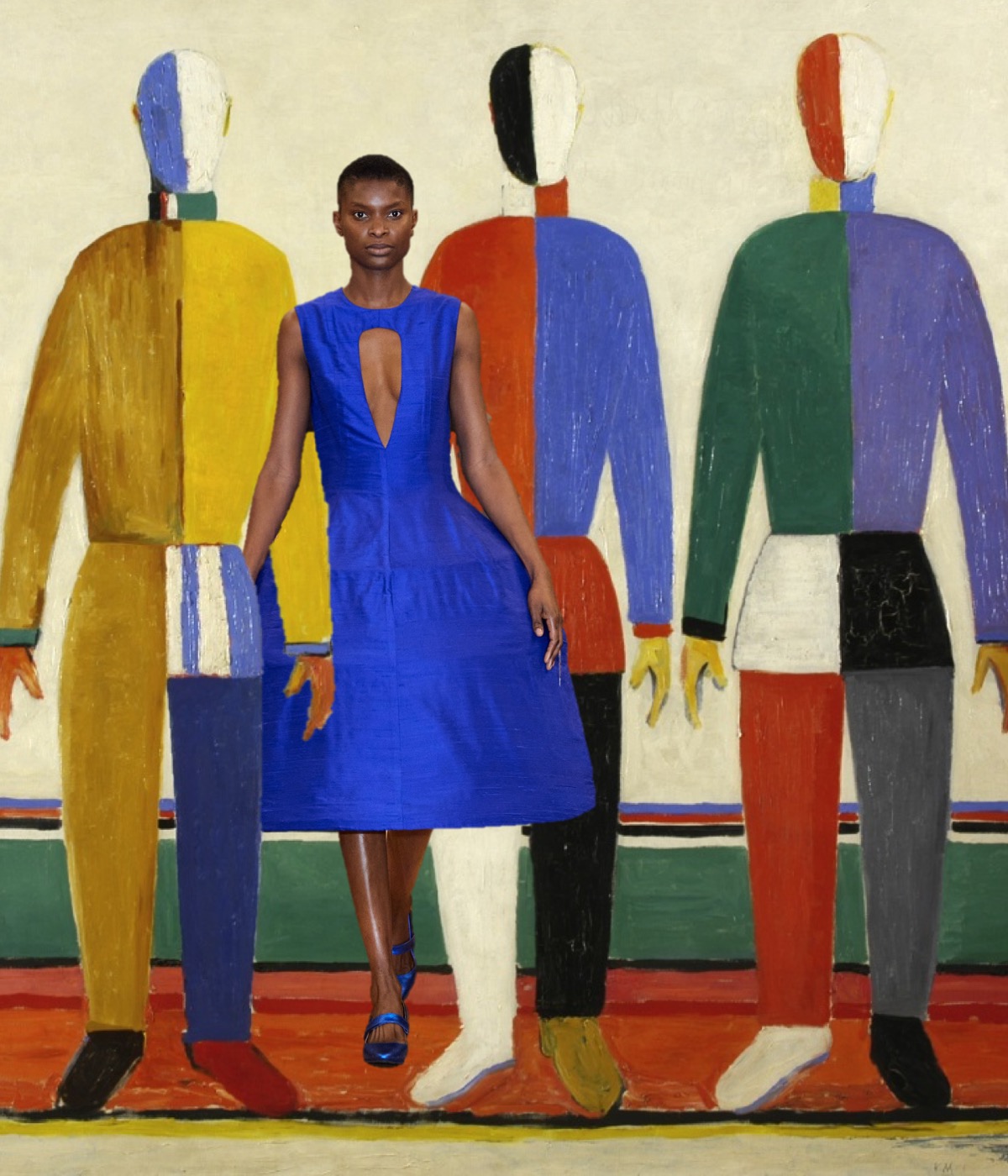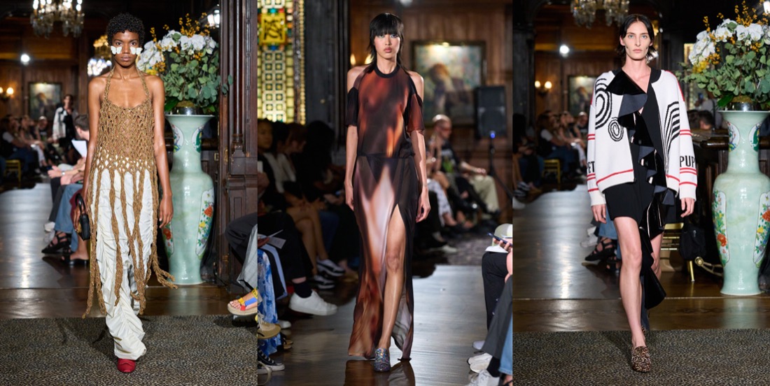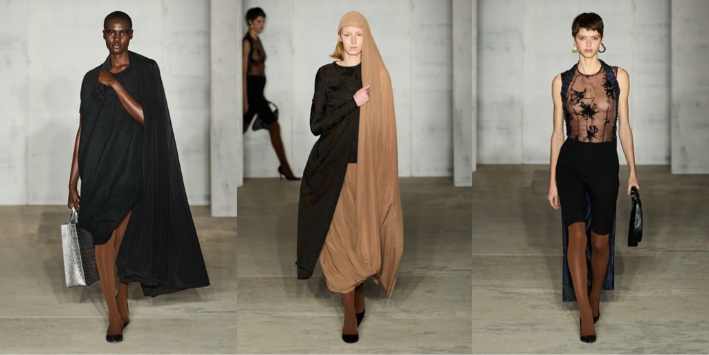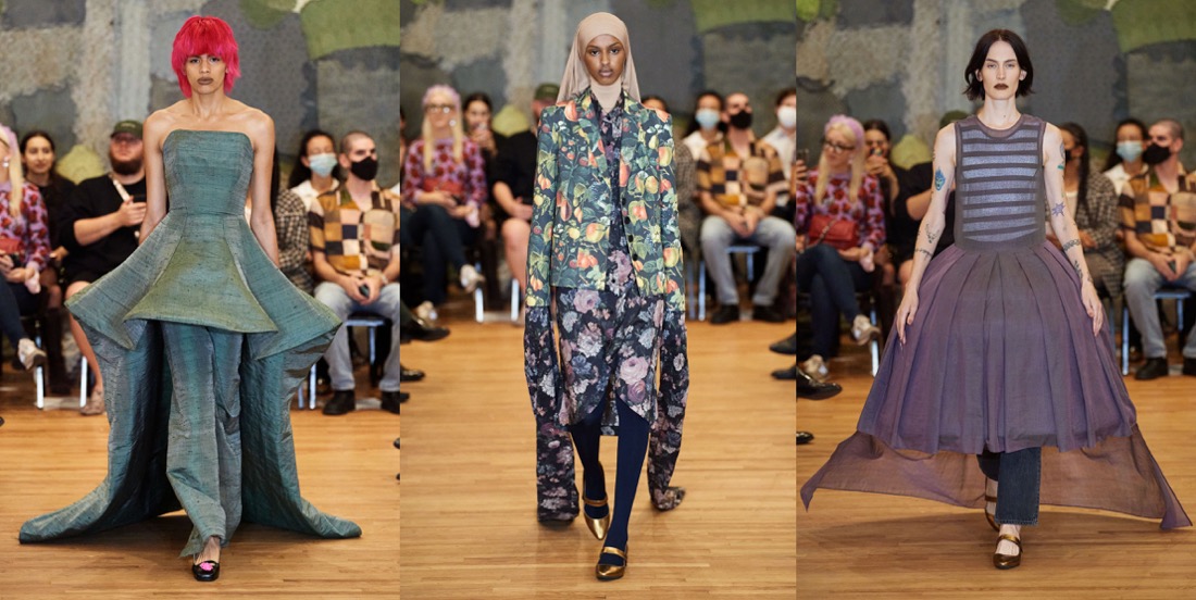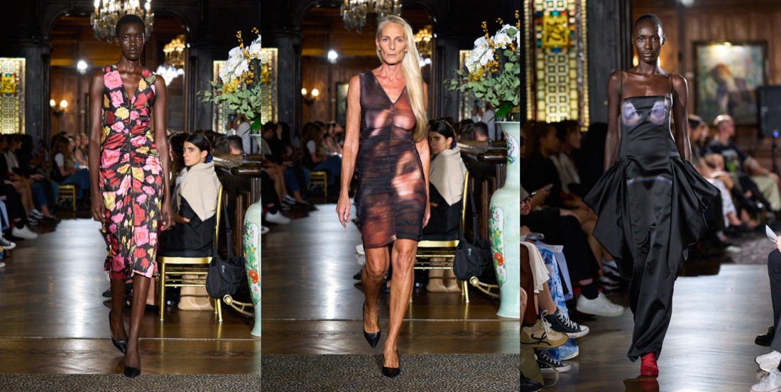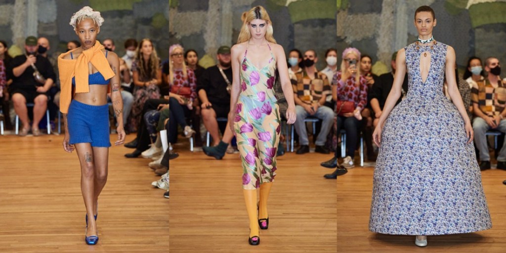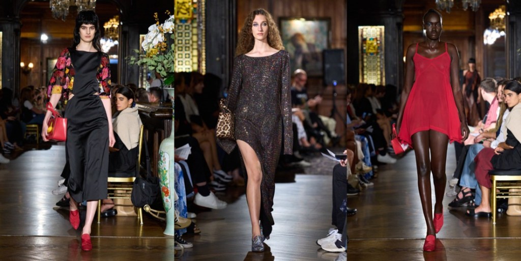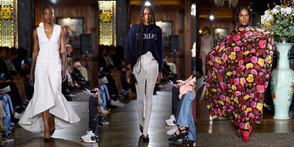 Rather than think of a fashion presentation solely as a forum for presenting new designs, she sought to evaluate its merit as a conceptual and artistic medium. Her decision to present what she called “a styled show rather than a fashion show” was an exercise in distancing herself from a sense of obligation to create producible garments. Working alongside stylist Taylor Thoroski, looks leaned into Mark’s familiar style vernacular, drawing upon her own dress habits. “Something I’ve learned over the years is that the things that I put down the runway are stronger, in my opinion, when they’re in line with me,” she said. “I’ve been very into not having pants on in the past. So we were like, ‘OK, let’s keep going there.’ And I’ve been wearing really simple jeans,” she says, pointing down to a slim-fit H&M pair she was wearing. And that’s so refreshing to hear in 2024.