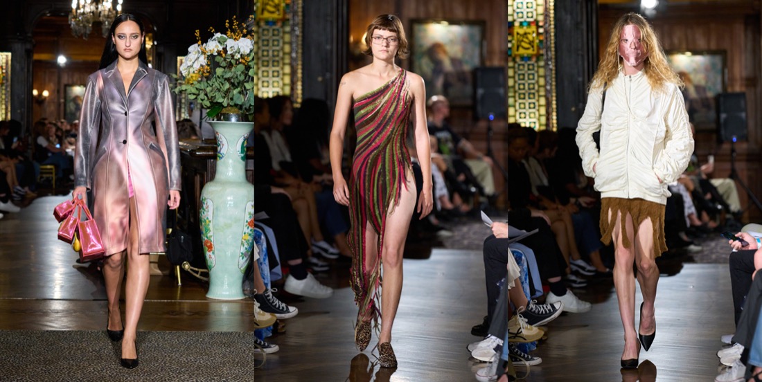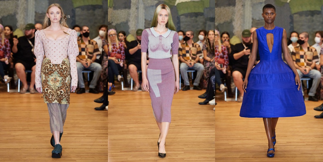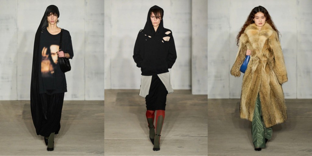 Puppets & Puppets‘ Carly Mark left New York – a rather hostile city for emerging brands – for London, a place that’s resilient and way more supporting for creatives that think outside the box. There’s also an element of strangeness about Mark’s fashion (and accessories). The feeling of unexpectedness was delivered by the deliberately blunt clothes that were just… clothes. Boxy t-shirts, navy crewneck sweaters, skinny black jeans, plain lingerie sets and faux-fur trimmed hoodies. All that was styled with indie-sleazy fedoras (very girlfriend of an Arctic Monkeys member in the late 2000s), big sunglasses and gloves. Was Mark’s intention here an elaborate trolling exercise? Not quite.