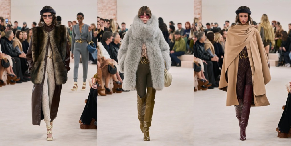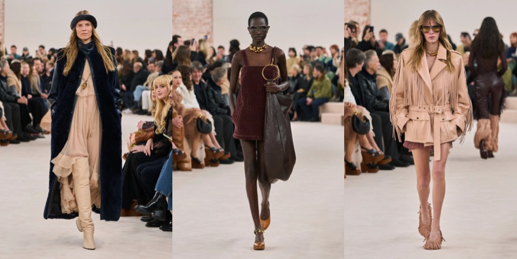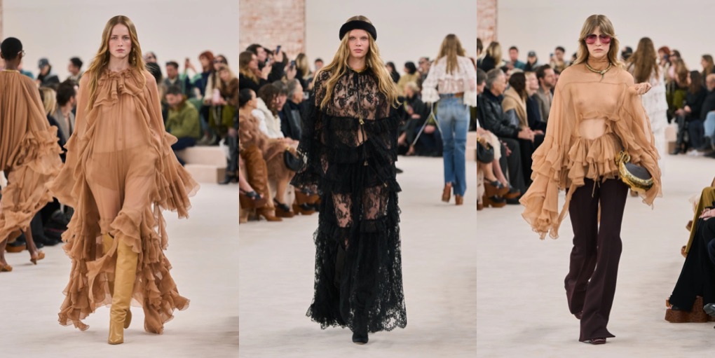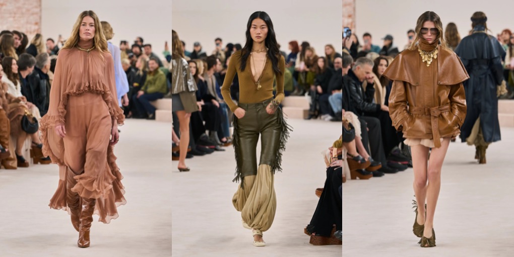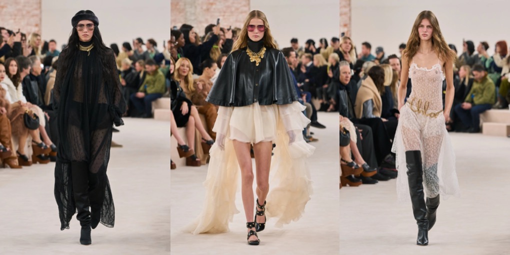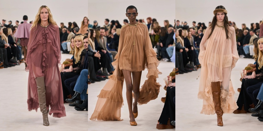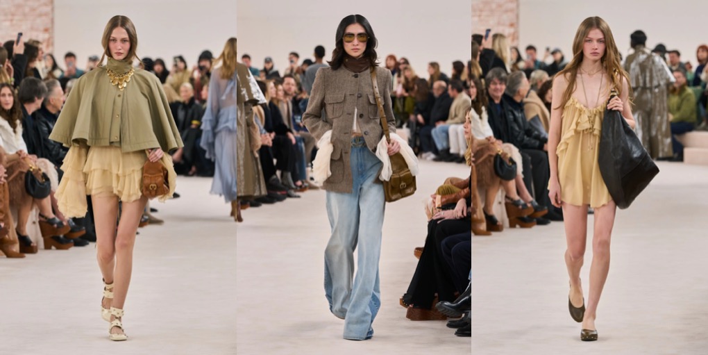 Resort 2025 is the third collection we see from Chemena Kamali at Chloé, and so far we know for a fact that she really has a knack for revisiting and refreshing the maison‘s codes, from Gaby Aghion’s liberating femininity to Stella McCartney and Phoebe Philo’s early 2000s frivolity. For spring, Kamali is taking a closer look at bourgeois chic from Karl Lagerfeld’s era. “There are all these stories to explore that haven’t really been told yet that are part of our history,” she said. This time her mood-board was covered with images of “the Art Deco years of Karl in the 1970s. He furnished the entire apartment he lived in, in Saint Germain, as this Deco masterpiece – everything was in black and gold, and white, cream and gold, and he used to lend it to Vogue and others for shoots. Guy Bourdin, Helmut Newton, David Bailey, and Deborah Turbeville all shot there.” The billowing, floating volumes, off-the shoulder dresses, balloon-sleeved blouses, and square-necked smocks in diaphanous coin-dot lamé and swirling, pleated metallic florals swiftly teleport you to these days. But there’s also a breath of contemporary air. The boxer-ballet shoe hybrid wedged sneakers Chloé is launching this season (similar walked in a couple of Hannah McGibbon’s runways). “I wanted something that was soft, feminine, comfortable,” Kamali summed up. “And they had to be real. All the women in the office have been test-wearing them.” Collaged from a myriad soft pastel colors in hi-top and low versions, they look like a Chloé hit in the making. Also worth noting: the reissuing of Square Camera handbag with chain handle from Philo’s winter 2003 collection. Whoever still has it in their wardrobe, lucky you!