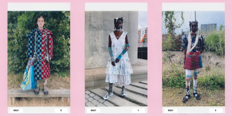 Seeing all the favourite, relatively small, unique brands in the London Fashion Week digital schedule this season is truly heart-warming. And with less pressure of being noticed in the presentations and showrooms marathons the editors and buyers usually have, look-books seem to let that tension off. I’m following Chopova Lowena since its start about two years ago, and I must say I’m impressed how this label evolves with such confidence and thought, simultaneously staying true to its style. Emma Chopova and Laura Lowena took a gathering of their collaborators and interns outside their studio in the postindustrial docks area of Deptford to shoot their spring-summer 2021 look book. “We did it ourselves on our iPhones,” they said, on a Zoom call with Vogue as they shared the pictures. “Everyone we collaborated with is in the look book, except for a Bulgarian woman, who we found on Facebook, who made loom-beaded pieces for us.” So here are their friends, standing on concrete and cobblestones under an overpass, with a washed-up wooden riverboat in one direction, a red commuter train shooting overhead, and the vivid green shoots of untended nature springing up beneath their feet. As a glimpse of a little-seen corner of the Thames shore, the backdrop is a perfect metaphor for the designers’ youthful energy – their uplifting knack of finding beauty and romance in overlooked places, and their ingeniously pragmatic ways of re-crafting fragments of the past into ideas that young women find irresistibly wearable. Some of the Chopova Lowena girl gang pictured are Faye, a painter who contributed designs for their burgeoning line of printed jeans; Jewel, a makeup artist; Ami, who made prints based on cut-up Bulgarian postcards of dogs, roses, and Easter eggs for T-shirts; and jewelry designer Georgia, who made charms. The label is focused on building up signatures, like their accordion-pleated kilts suspended on steel climbing hooks clipped to leather belts, and developing their penchant for dresses in checks and tartans made from deadstock fabrics. All of this continues with even more exuberance and multiple-check action here. Explaining the narratives of how they source and make in Bulgaria, which is Chopova’s family home, is also important to the designers. There are lots more vintage materials from her home country in this collection. “My mum helped me clean and recondition antique wall hangings. People traditionally used to hang them in their kitchens over stoves or above their sofas or beds,” Chopova relates. Bulgarian people are willing to part with them, she says, because they don’t use them anymore. “The fabrics have a lot of baggage. They remind them of communism and folklore, which don’t have favorable connotations.” Look 1, a lovely white drop-waisted linen dress with two deep flounces, is remade from kitchen hangings embroidered with line drawings of folk tales. There’s a top made from lace doilies too. The designers now feel they want to deepen the connection with tradition and with showing the authenticity of how their things are made and by whom. “I think in the pandemic, everyone in fashion has been thinking, What is our brand’s purpose in all of this?” They learned how much their audience likes seeing stuff being made when they ran a video of artisans in Turkey marbling white denim for their new line of jeans. In tough times, their priority is to keep supporting the Bulgarian women who work on the clothes – those with the skills to produce, for instance, the deep accordion pleats that are “made with the one remaining mold in the factory, which was always used to pleat traditional costumes.” Amazing.