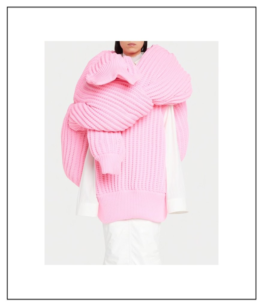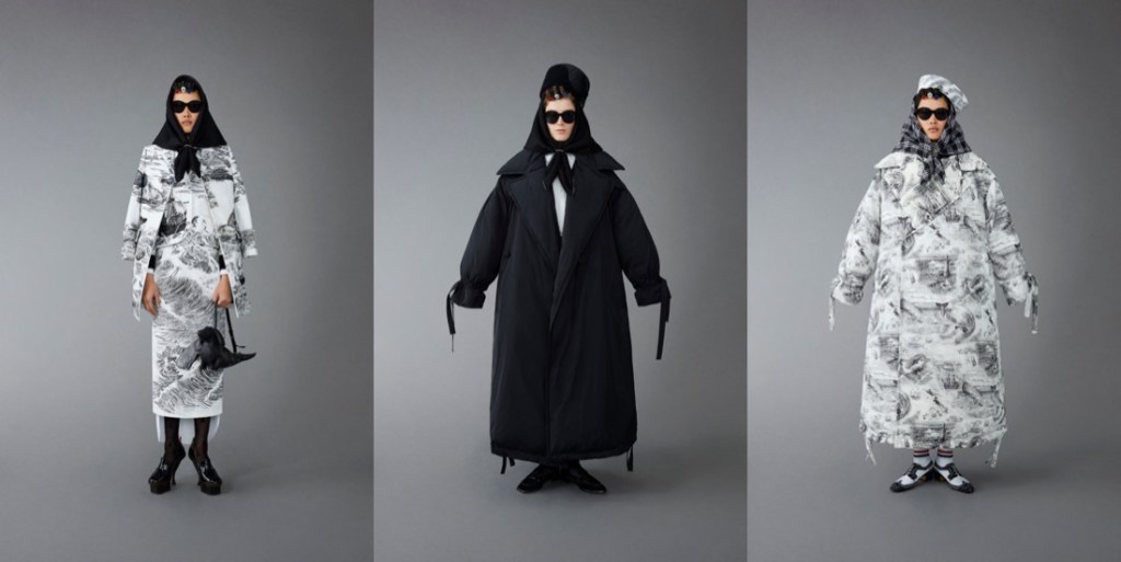 At first glance, Thom Browne‘s pre-fall 2023 collection has a much more sober spirit than spring, with its shades of navy and gray, and its more typically Browneian silhouettes. But Thom’s clothes typically reward close inspection – and you’ll find humor in them too. See the intarsia’d double-breasted coat in which a lifeboat full of sailors is dwarfed by the giant sperm whale, or the tailored skirt suit in a wallpaper print depicting the final battle at sea between Captain Ahab and Moby Dick. On the accessories front, Hector the bag has made some new friends in the form of not just the victorious whale, but also the Pequod, the doomed ship. About this season’s silhouettes. Though there’s a’60s-short shift or two, Browne’s instinct was to cut his tailoring lean and long, often layering pants underneath skirt shapes to extend the line. Accessorizing the tweed separates with tweed tights created a similar elongating effect. Remarkable.