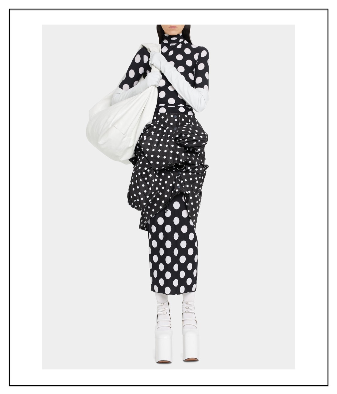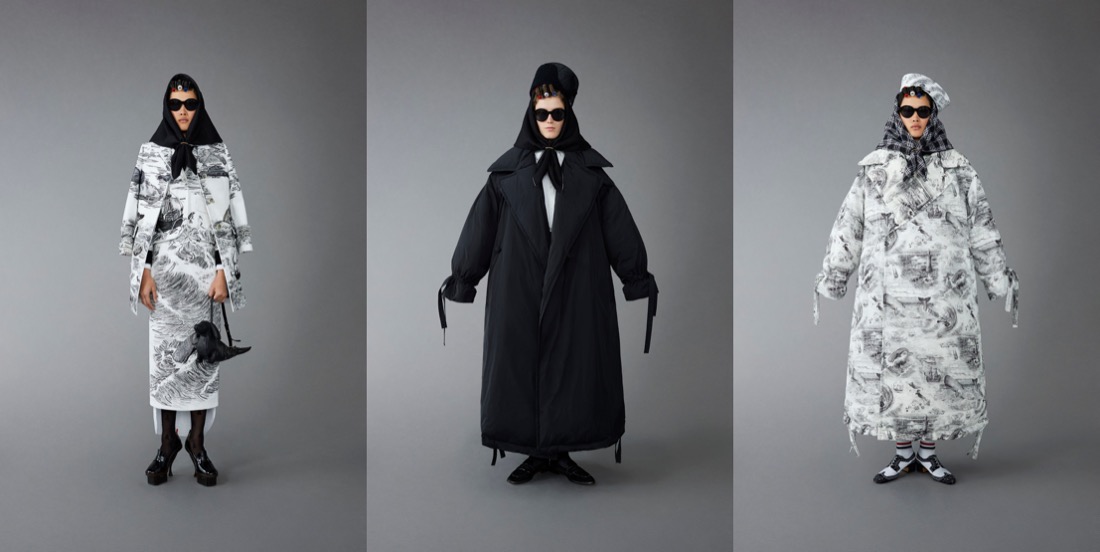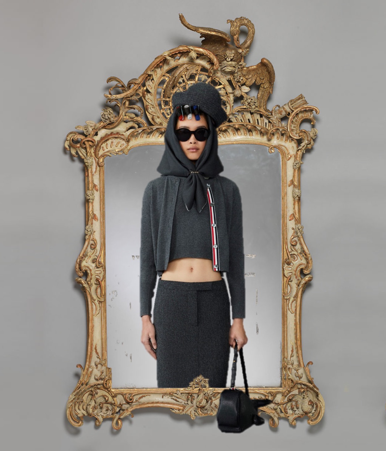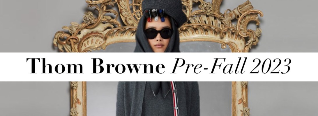 At first glance, Thom Browne‘s pre-fall 2023 collection has a much more sober spirit than spring, with its shades of navy and gray, and its more typically Browneian silhouettes. But Thom’s clothes typically reward close inspection – and you’ll find humor in them too. See the intarsia’d double-breasted coat in which a lifeboat full of sailors is dwarfed by the giant sperm whale, or the tailored skirt suit in a wallpaper print depicting the final battle at sea between Captain Ahab and Moby Dick. On the accessories front, Hector the bag has made some new friends in the form of not just the victorious whale, but also the Pequod, the doomed ship. About this season’s silhouettes. Though there’s a’60s-short shift or two, Browne’s instinct was to cut his tailoring lean and long, often layering pants underneath skirt shapes to extend the line. Accessorizing the tweed separates with tweed tights created a similar elongating effect. Remarkable.