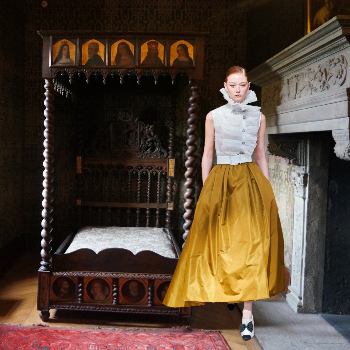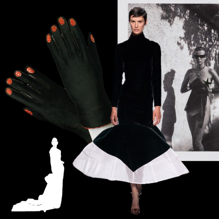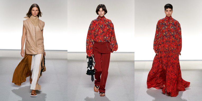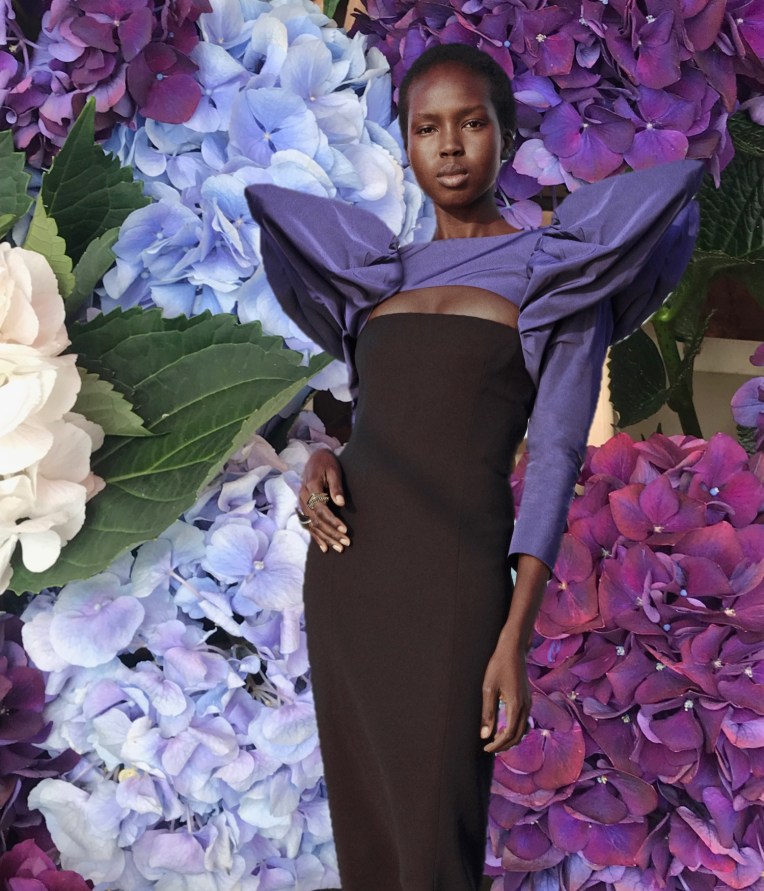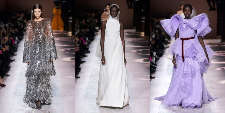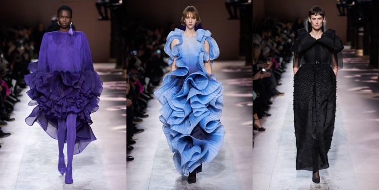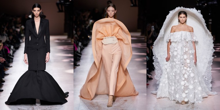 Clare Waight Keller’s spring-summer 2020 haute couture collection for Givenchy was rooted in her memories of visiting the garden rooms planted at Sissinghurst Castle by Vita Sackville-West and by reading the passionate love letters between Sackville-West and Virginia Woolf. “It’s one of the most romantic places in England,” Waight Keller said. “I’m quite obsessed by the place.” Famously it was Woolf’s involvement with Sackville-West and dreaming through the Elizabethan history of the Sackville-West family house that inspired Woolf to write her time- and gender-traversing novel Orlando. Coming back to the collection: Waight Keller once again proved her strengths in tailoring. But what truly stunned the audience were the summer-garden colors and swirling 3D-petal forms of dresses. For the designer, it was “my own love letter to Hubert de Givenchy because I went into the archive for this collection and looked into the history of the house from the very beginning.” Photographs of the pristine flower-lace gowns he made in the era he designed for Audrey Hepburn were pinned to her inspiration board. Givenchy, as it happens, was dedicated to garden design too. The outside edges of the jacket of a neat black pantsuit were implanted with a halo of gypsophila embroidery – this one looked incredible. There was a bit of “couture” casual: multilayered tulle petal-pink skirt overlaid with Chantilly lace was worn with a sheer black T-shirt. Waight Keller finished up her show by sending out Kaia Gerber as the ultimate fantasy bride in an off-the-shoulder cut-lace white chemise and umbrella hat that swooped back over the shoulders, amplifying the volume of the entire look.