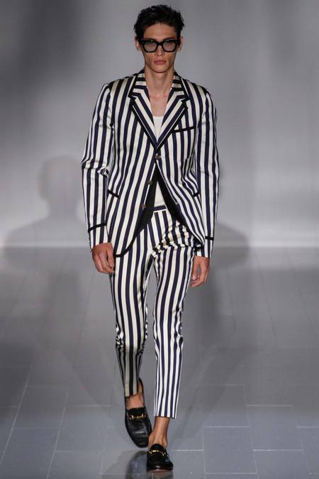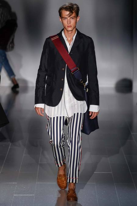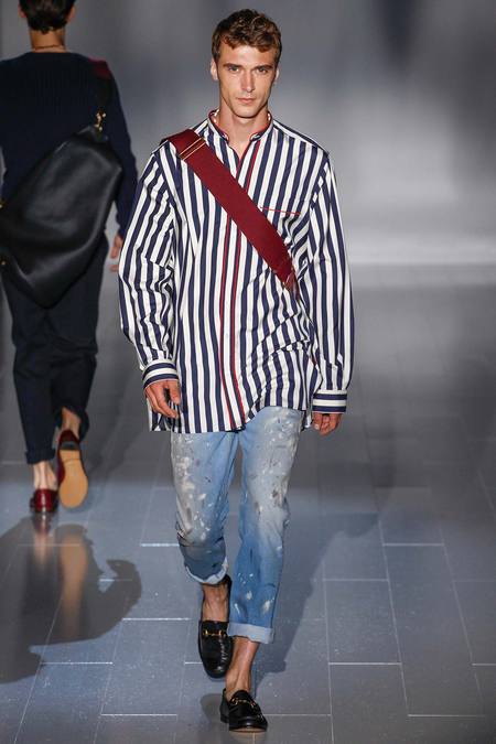This look above is the outfit that killed all the others for SS15. Clement Chabernaud wears a over-sized, striped pajama like shirt, paint marked boyfriend jeans and the classical, Gucci loafers. What to need more for summer? This gorgeous collection delivered by Frida Gianini for us yesterday is one of the best Gucci men ever had! Ticking all the nautical boxes and yet deftly managing to rise above costume party clichés, the tailoring-led collection featured boating jackets – contrast piping adorning collars and sleeves – gold anchor-stamped buttons and pristine white ankle grazers. Bravo!