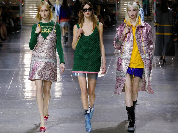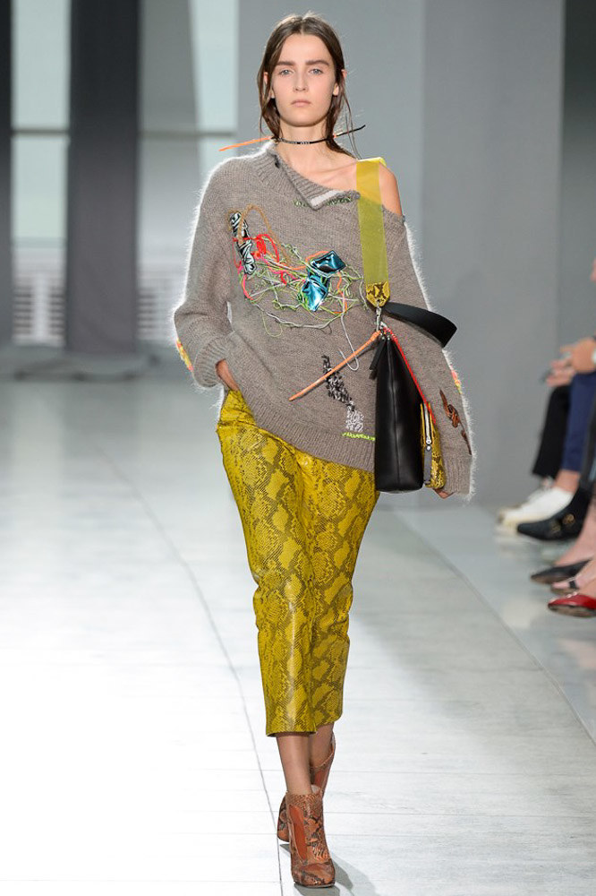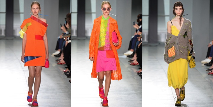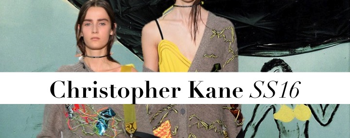 Christopher Kane moves to the rythm of SS16 with a return to neon brights and patchwork dressing – python skins combined with plastic? Yes, I’m totally into that electric combination. What about the abstractly panneled cocktail dresses with straw-fringes? Acid-spilt lace skirts are back, too – but in a much more futuristic edition. The designer behind London’s fastest growing label happily let his creativity take over the reigns, and that is visible by the amount of uncommerical pieces presented during the show. Also, hand-made stuff fans, here is one for you – if you wish to do some DIY for next season, try out Christopher’s jewellery. You can find those plastic thingies in every Castorama or Ikea around your place!