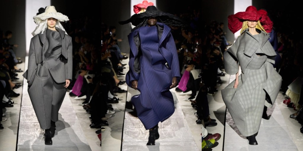 Comme Des Garçons was an important moment. Rei Kawakubo’s wearable shapes and constructions were slightly (just slightly) getting daunting in the past few seasons with their amorphism and assamblage-ness, but for autumn-winter 2025, the designer went back to making clothes – or rather, concepts of clothes. Not that they were in any way normative. But you could see substantial ideas behind multiple cocktail dresses topping a black tutu base, or in the massive velvet crinolines. There were many layers of pink, red, and watermelon duchess satin bodices and skirts, smashed and clashed together, looking like some kind of couture godzilla. Meanwhile, on the soundtrack, the recording of the Bulgarian singers – as Adrian Joffe, Rei’s husband, shared – was of “workers in the fields, harvest, families, getting things done together.” This holds symbolism for Rei Kawakubo and for Joffe about the independence of Comme des Garçons and Dover Street Market – the two rare, assertive, yet thriving enterprises in an increasingly mega-corporation-dominated world.