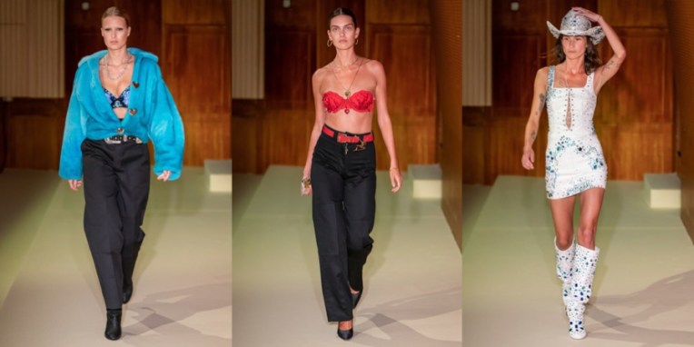 Saks Potts‘ faux-fur coats in various shades of neon might have stolen Cardi B’s and Rosalia’s heart. But the designers behind the brand aren’t resting on laurels. For spring-summer 2020, Barbara Potts and Catherine Saks introduced a different view on their ready-to-wear, only showing a single brown pleather version of their best-selling ‘Foxy’ coat. Titled “Latina Gala,” their new collection for summer was essentially a bow down to Selena Quintanilla-Pérez, the Mexican-American singer who was tragically killed by her manager in 1995. Expect drama. A rodeo-ready bedazzled white leather minidress with matching cowboy boots and hat worn by local model and Saks Potts muse Emma Leth was the star of the show. If hot girl summer was a fashion collection, then it’s this one from Saks Potts.