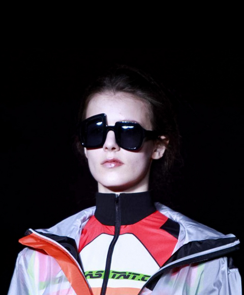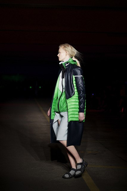 A destroyed theatre, with smashed windows and peeling walls, was filled with scruffy, pre-war chairs where the guest would seat. Something is going to happen. Then something amazing happens, that even Rihanna and Natalia Vodianova gasp with excitement. From under the dark curtain thats hanging above the scene, a 3-D installation of metallic skyscrapers and blue sky are coming out. And it’s of course all in Grand Palais!