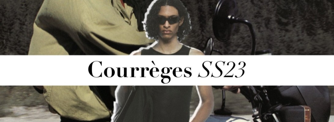 The energy of the concise, item-driven modernity Nicolas di Felice brings to Courrèges is all over the spring-summer 2023 collection. “You know, back in the day, Andre [Courrèges] was speaking to the young generation. I knew from my first week that it was part of the house,” said Di Felice. “So I really want young people to be able to afford the clothes; to make it, let’s say, more accessible.” He grabbed a vintage zip-up scuba-fabric jacket which Courrèges had designed for men in the 1970s as an introduction to how he got started. “I found this in the archive, and thought, ‘This shape is amazing,’ but there’s no point in doing it again. So I wanted to mix this silhouette with a biker vibe, because I had a motorbike when I was young. I thought about how it feels to drive to the beach, or to a festival in the summer, or something,” he laughed. “I’ve been at the house for two years now, so I feel more comfortable to explore a bit more of who I am.” One thing about Di Felice is his knack for filtering lived experience into his minimal-seductive design. His collection captures all the features of young masculine body-con display that’s taken off this summer: tight-to-the torso leather jackets, twisted, cutaway T-shirts, slick moto pants in the house’s heritage-look black vinyl, gabardine polyester trousers and denims with a hint of bootcut flare. It’s his addition of the faux leather bondage straps across the front of jackets that adds a clever utilitarian twist. He demonstrated: “So what you can do is take off your jacket or poncho and hang them off your shoulder by the strap, like this. It came to me simply when I was one more time in a party, and it’s hot and there are not enough cloakrooms. I was like, ‘OK, um, so when I go in on Monday – I’m going do that in the collection!’” The lookbook shows the device in action – clothes gradually becoming cool-looking drapes toted from shoulders, until the last guy ends up naked, carrying all of his clothes. “Like he’s just come out of the water on the beach,” Di Felice grinned.