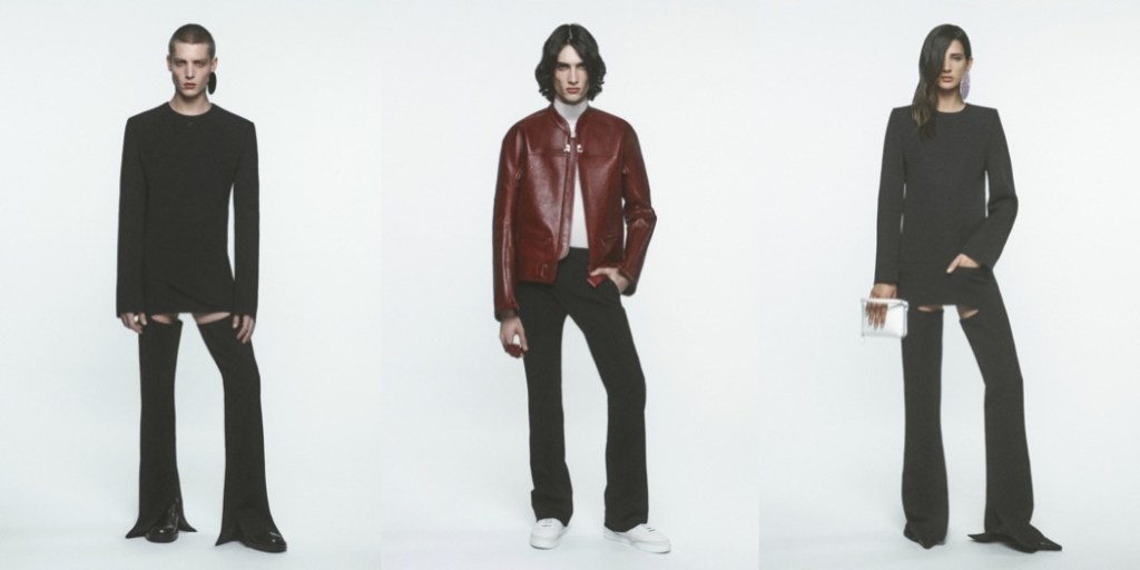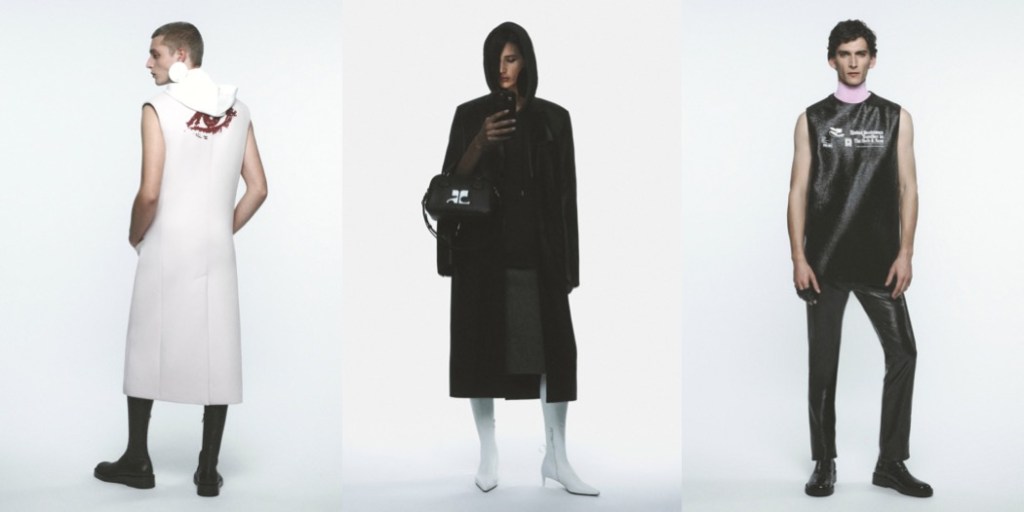 Courrèges is gradually becoming a brand with a contemporary feel that offers some truly desirable clothes. All that thanks to Nicolas Di Felice, who with every season redefines what this French label is to a modern-day audience. The most important aspect the designer orbits around is the functionality of clothes seen through the lens of social observation. In the men’s autumn-winter 2023 (and women’s pre-fall) line-up, his thought process was triggered by watching the phenomenon of people hunching over their phones. “I’m really working on kind of a new silhouette that is really, like, bending,” he said. “It really seems like nothing, but actually it’s something, this reflection of us on our phones.” Somehow, that idea bloomed into a sexy and cool wardrobe. Technically, Felice’s inspiration of the staring-at-screens impact on human posture brought about a slight forward-tilt of the shoulder line – and the ingenious idea of inserting an invisible zipper extending to the elbow on the inside of tailored sleeves, “so you don’t have to ruin you clothes!” The lines of Courrèges are sharp, mostly dark, and cleverly sliced by Di Felice to adapt the original space-age minimalism of the founder for the new generation. That’s another of his talents: witness what he’s named “mini-skirt pants.” It looks like a plain black long-sleeved tunic, but there’s a narrow gap, high up on the thigh; a flash of flesh where the hem meets the pants. An incendiary item he proposes for all genders. Très cool.