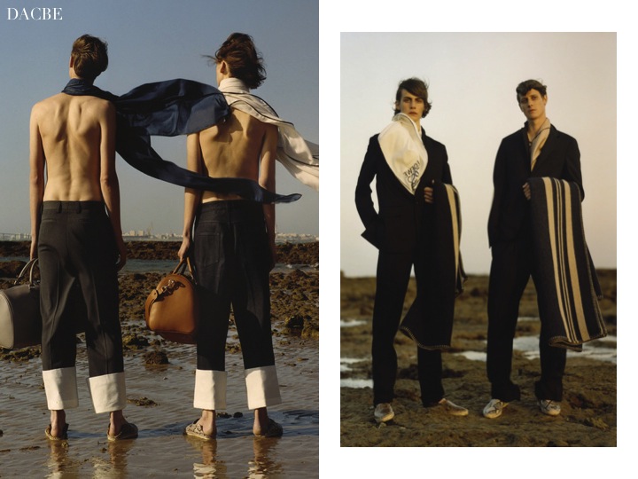 For few days before the presentation, the new Loewe ads were sent all around the Parisian billboards, presenting vintage Steven Meisel photographs curated by Jonathan Anderson. Jonathan, designer of J.W. Anderson and the new creative director of Spanish luxury fashion house, Loewe, debuted with a menswear SS15 look-book yesterday: full of warmth and youth, the clothes are modern, but keep up with the legacy of the house. The leather Amazona bags, the cozy sweaters with new M/M logos, the origami sharp cotton t-shirts and foulard like tops look fresh and innovative! It was also quite obvious how much of Anderson himself there was in the new Loewe. He played with Meccano blocks in his childhood, and the Meccano references in the new collection were, he said, representative of “a naive approach to rebuilding a brand” and the small leather goods. They led to a Pop-y, primary-colored touch. And, the naive aside, there was a jolt of Andersonian ambiguity in a piece as frankly feminine as the two striped silk scarves sewn together to create a top. I am really curious how will Anderson continue his journey at Loewe- because it starts really good!