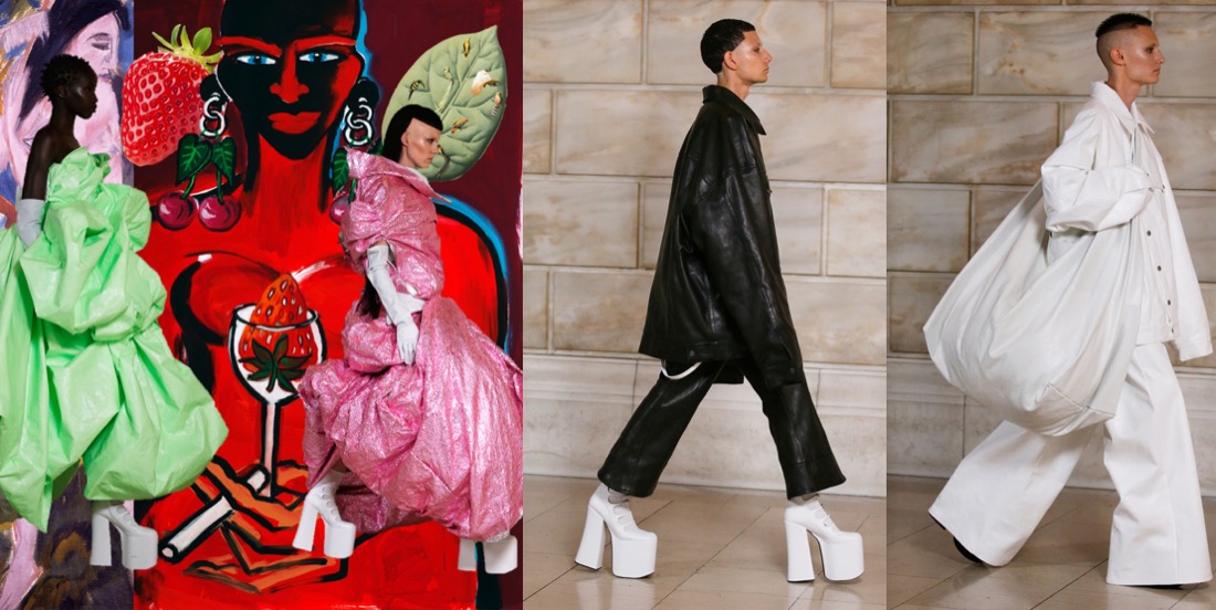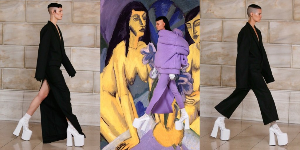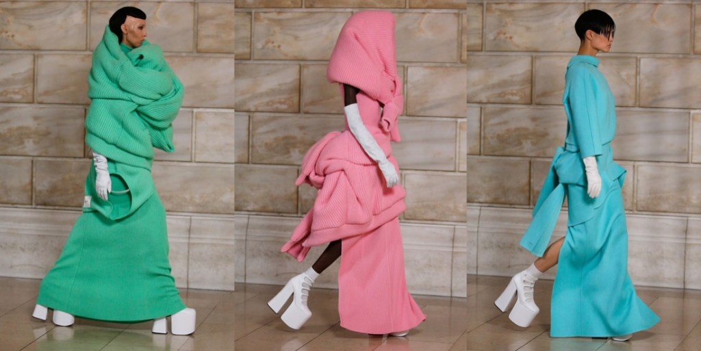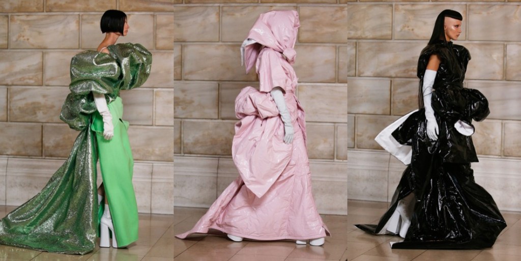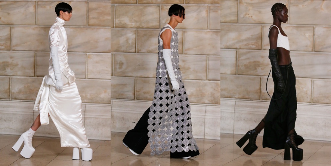 “We have art not to die of the truth.” Marc Jacobs quoted Friedrich Nietzsche in his show notes. Confronted with a rogue Supreme Court determined to strip women of their reproductive rights, with Clarence Thomas threatening to attack gay marriage next and even to make contraception illegal, fury may give way to despair. But that’s not where Jacobs is at. “Creativity is essential to living,” his statement read. A year ago, most of us were looking ahead to a brighter 2022. Last June, Jacobs channeled that energy into a dynamic collection. That brighter future hasn’t really materialized, as we’re all too aware. Covid keeps coming back in successive waves, Russia continues its atrocious invasion in Ukraine, and in America the will of the majority has been hijacked by the minority. Nevertheless, Jacobs persists. Supersizing jeans and jean jackets, or treating denim to surface treatments that made the all-American classic look more like French couture. Adding so much stuffing to ribbed knit sweaters they could double as pillows. Toying with Gilded Age bustles – evoking them by wrapping jackets around the waist. And cutting ball gowns of exuberant volume in unexpected, even strange fabrics. His materials list included, but wasn’t limited to, foil, glass, paper, plaster, plastic, rubber, and vinyl. Interspersed with that excess, however, there was spareness. Jacobs lowered the waistlines of column skirts and cropped flares to bumster levels and accessorized them with barely-there bejeweled bikinis or the sparest of bustier tops. A pair of suited looks in black weren’t quite minimal, but they came close, a reminder of his talents as a tailor. As for the three matching looks at the beginning of the show in gray, hospital green, and lavender – were they Jacobs’s version of scrubs? Given the recent moves by the Supreme Court, it was hard to think otherwise. Adding to the dystopian vibe: the models’ hairdos, which were “shaved” on the sides with bumper bangs in a style that called to mind Sean Young’s Blade Runner replicant. And yet. All this was paraded out in the Public Library with opera gloves and sky-high white or black mary jane platforms. Dressed up in spite of the circumstances. Or maybe because of them? Definitely because of them. Marc Jacobs is a fighter, whose medium happens to be fashion. Knock-out F-A-S-H-I-O-N.