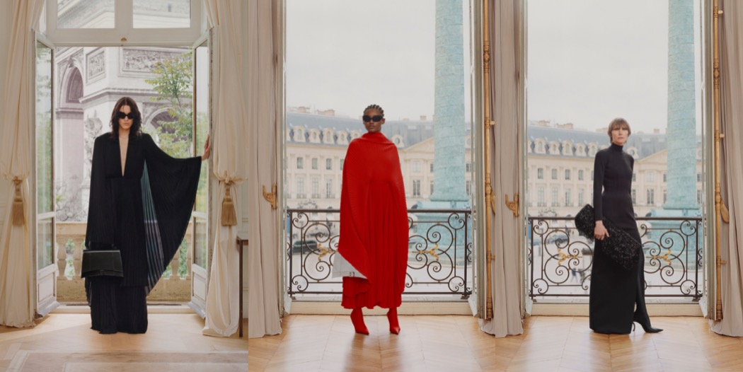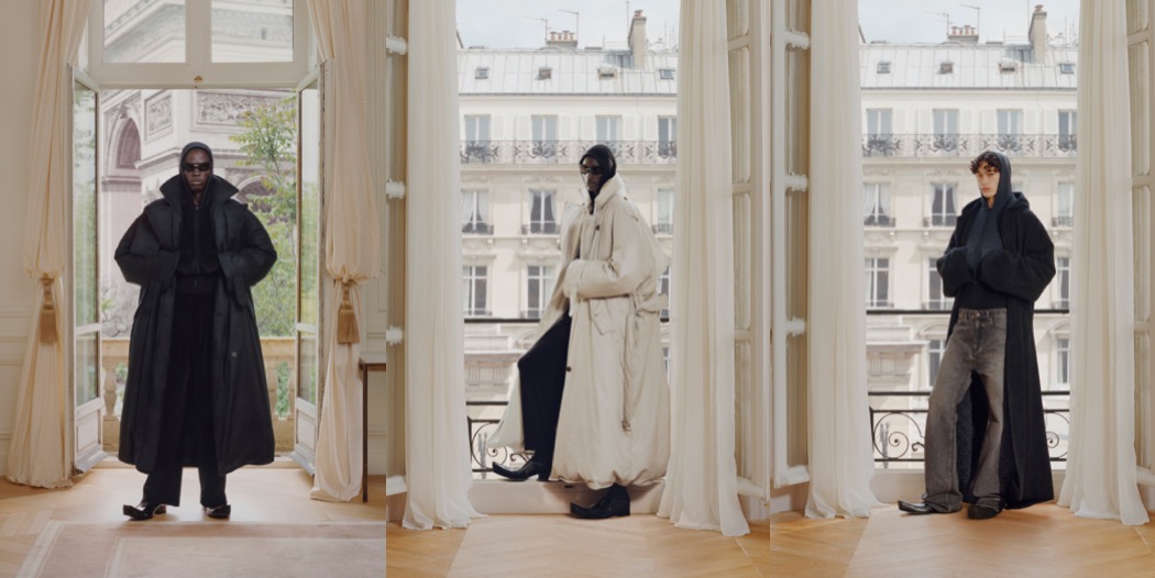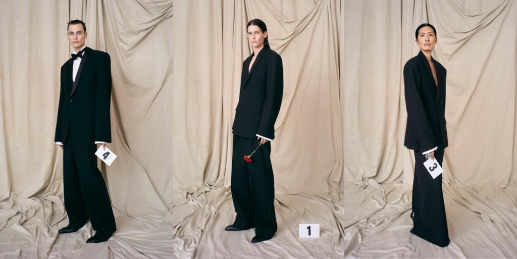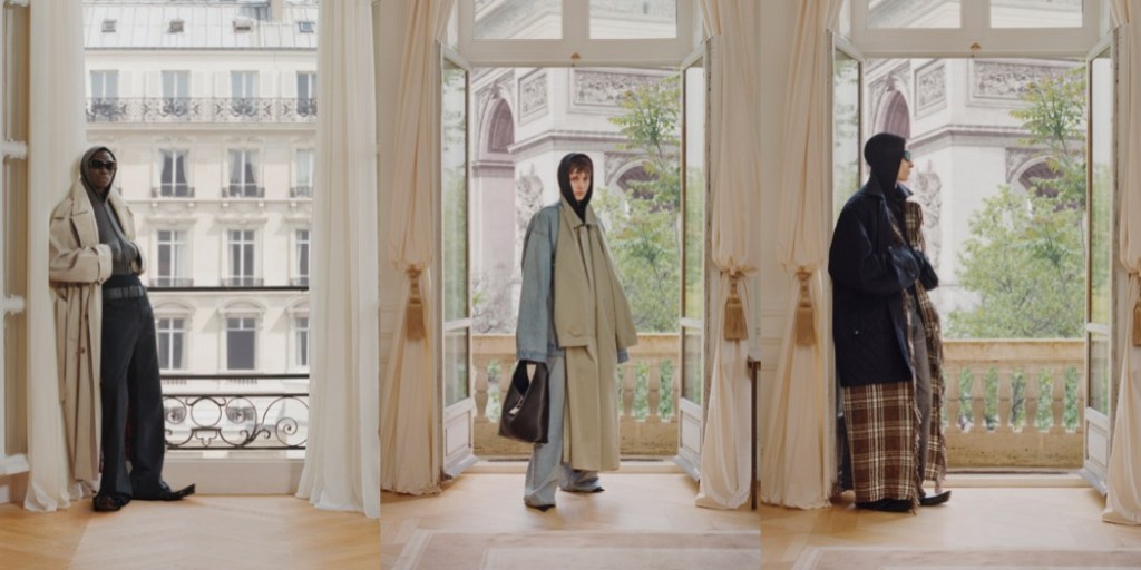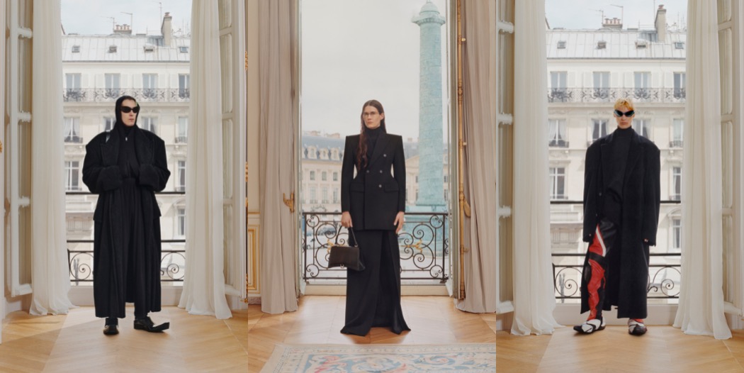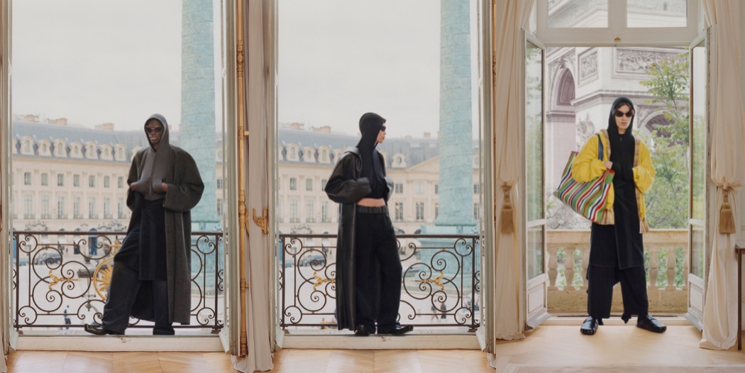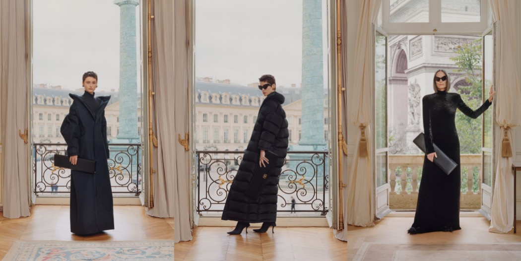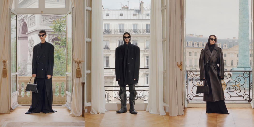 Ever since Demna‘s beginnings in fashion, honest and straightforward observation of how people dress on the street and for various occupations has always been a dynamic behind his design. The scenario playing out in his new Balenciaga resort 2024 video is very much that way, except that this time the street is the Avenue Georges V. The time-lapse slice-of-life captures people busily going in and out of the Balenciaga maison at number 10, or passing by. Whether they’re denim-clad teens, a motorcycle delivery person, a bourgeois dog walker, a skateboarder, or the retinues of black-clad hoodie-up fashion people going about their business – this is how the whole world would look if everyone dressed in Balenciaga. Underlining the fact that Demna is steering the brand narrative back to Paris, and to the house, he punningly named the collection Capital B. His second take on the collection is by way of a lookbook, apparently shot in grand rooms that variously overlook the Place Vendome and the Arc de Triomphe. Here, his perma-silhouettes are clearly in view: the oversized suiting, enveloping trapezoid coats and puffed-up trenches, the hoodies, and the bug-eyed shades with almost everything. As a pre-collection it encompasses every Balenciaga category, womenswear and menswear, formal black tailoring to denim, motorcycle leathers and sweatpants. Interspersed are also pieces from the high-luxe “Garde-Robe” collection, which are an annual release, such as the silver-fringed embroidered dress at the end. And of course the Cristobal Balenciaga-inspired ecclesiastical gowns and chasuble coats: the ultimate highlights of this very well-executed collection, which is about good dose of drama (in the clothes, not in anything around it!).