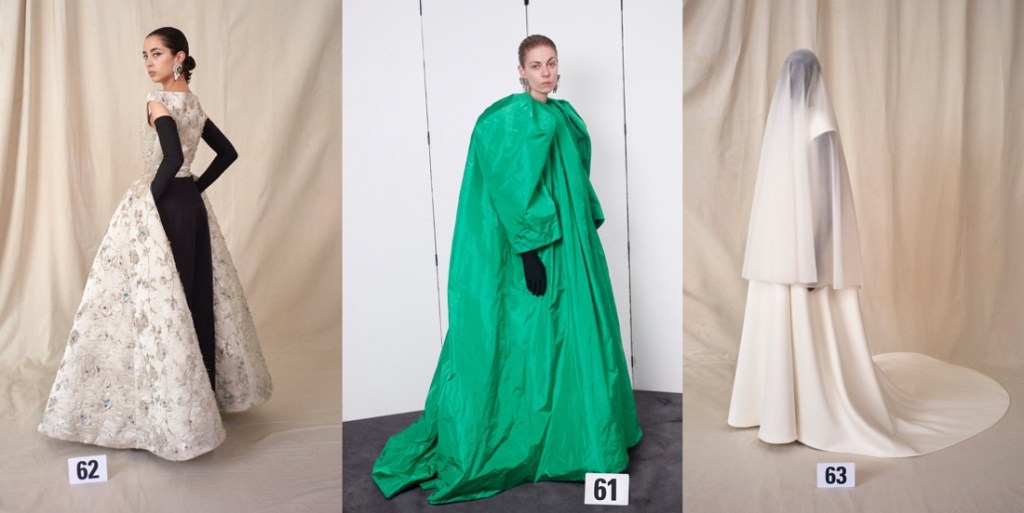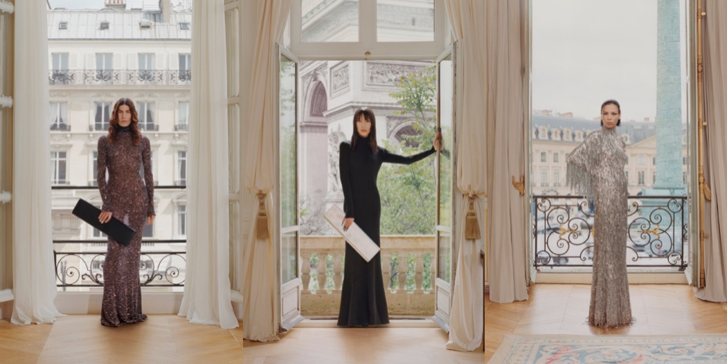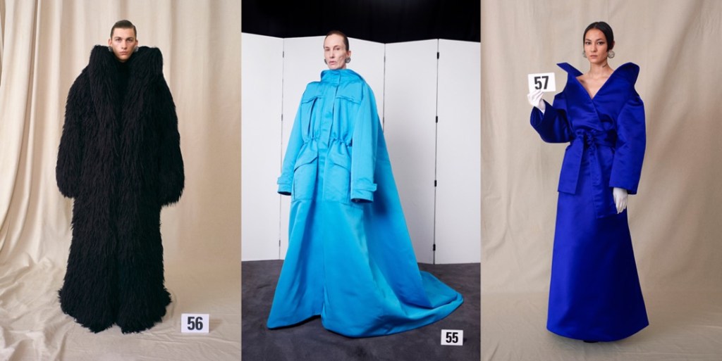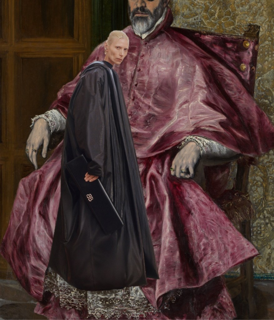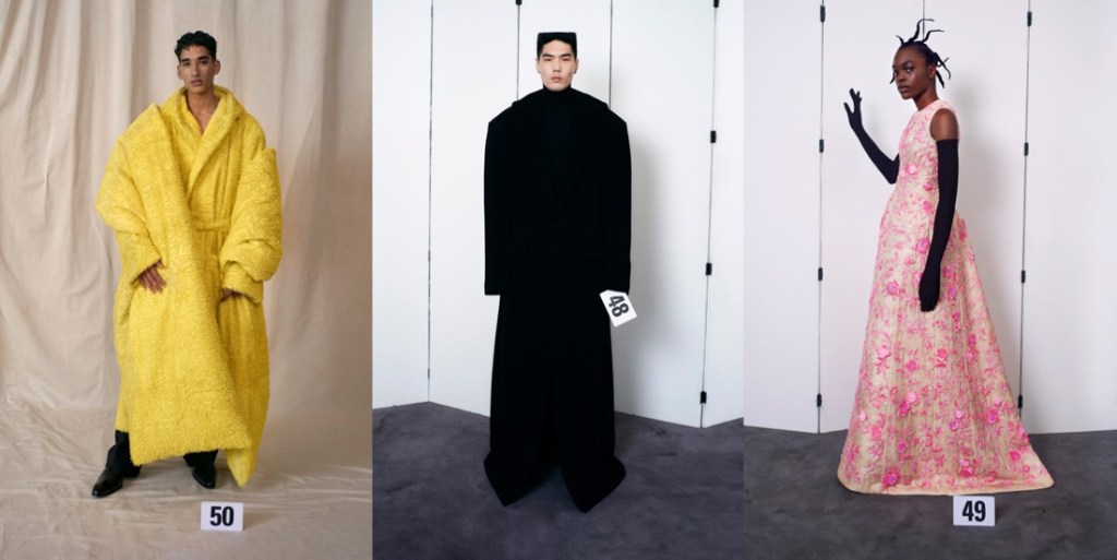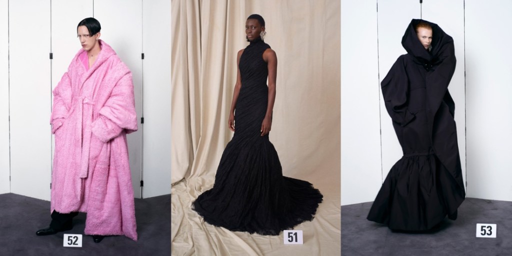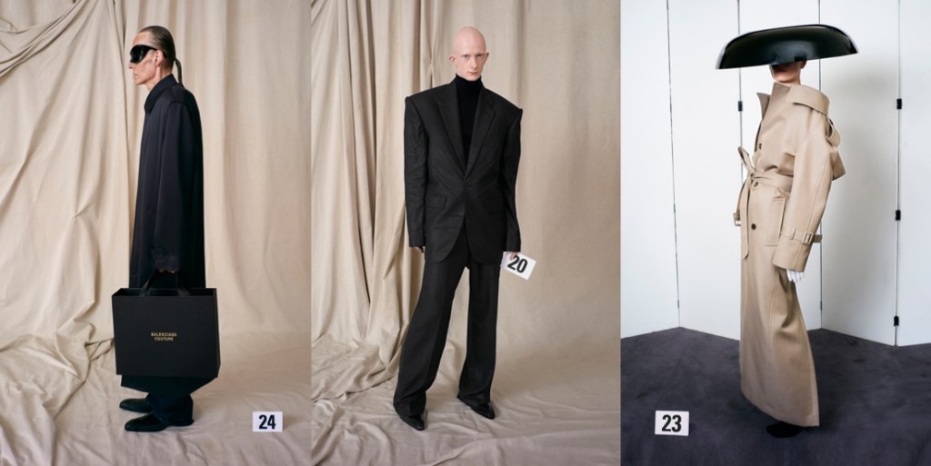Ever since Demna‘s beginnings in fashion, honest and straightforward observation of how people dress on the street and for various occupations has always been a dynamic behind his design. The scenario playing out in his new Balenciaga resort 2024 video is very much that way, except that this time the street is the Avenue Georges V. The time-lapse slice-of-life captures people busily going in and out of the Balenciaga maison at number 10, or passing by. Whether they’re denim-clad teens, a motorcycle delivery person, a bourgeois dog walker, a skateboarder, or the retinues of black-clad hoodie-up fashion people going about their business – this is how the whole world would look if everyone dressed in Balenciaga. Underlining the fact that Demna is steering the brand narrative back to Paris, and to the house, he punningly named the collection Capital B. His second take on the collection is by way of a lookbook, apparently shot in grand rooms that variously overlook the Place Vendome and the Arc de Triomphe. Here, his perma-silhouettes are clearly in view: the oversized suiting, enveloping trapezoid coats and puffed-up trenches, the hoodies, and the bug-eyed shades with almost everything. As a pre-collection it encompasses every Balenciaga category, womenswear and menswear, formal black tailoring to denim, motorcycle leathers and sweatpants. Interspersed are also pieces from the high-luxe “Garde-Robe” collection, which are an annual release, such as the silver-fringed embroidered dress at the end. And of course the Cristobal Balenciaga-inspired ecclesiastical gowns and chasuble coats: the ultimate highlights of this very well-executed collection, which is about good dose of drama (in the clothes, not in anything around it!).
