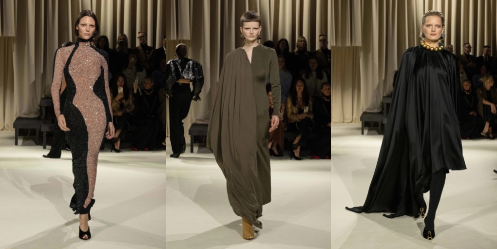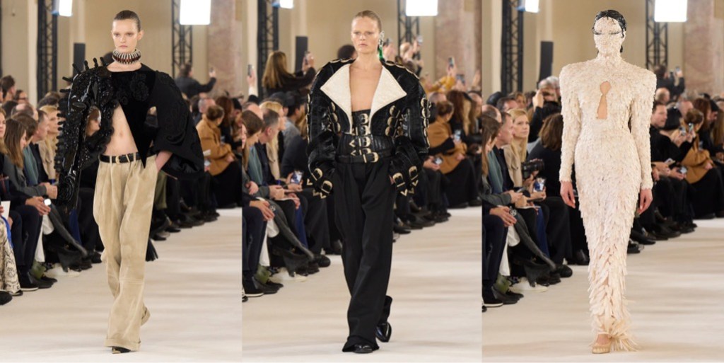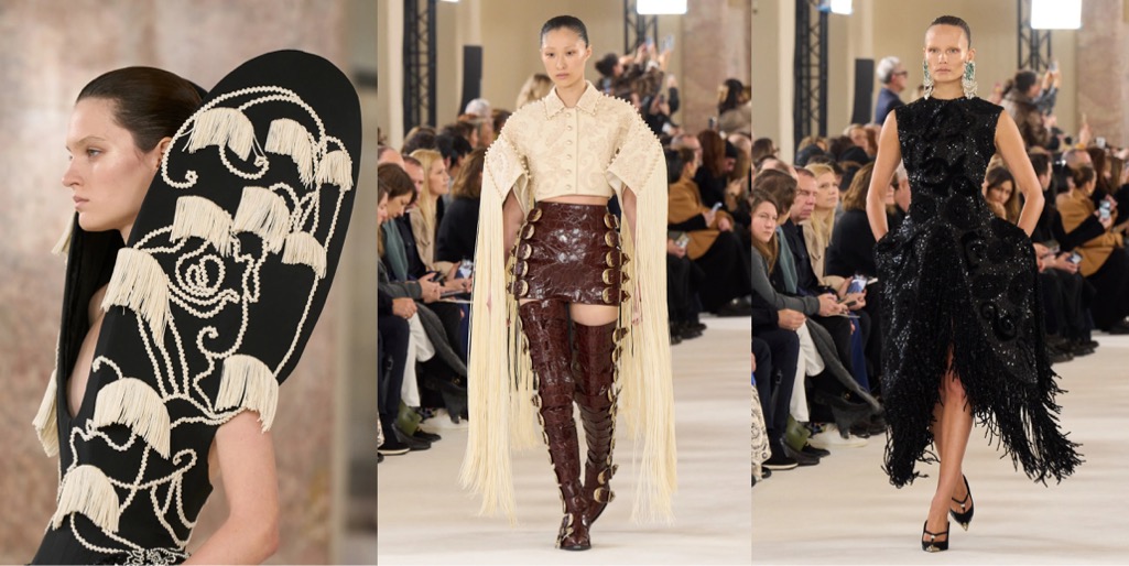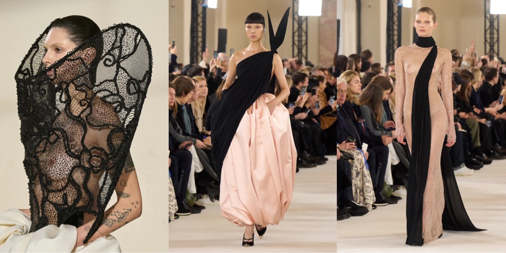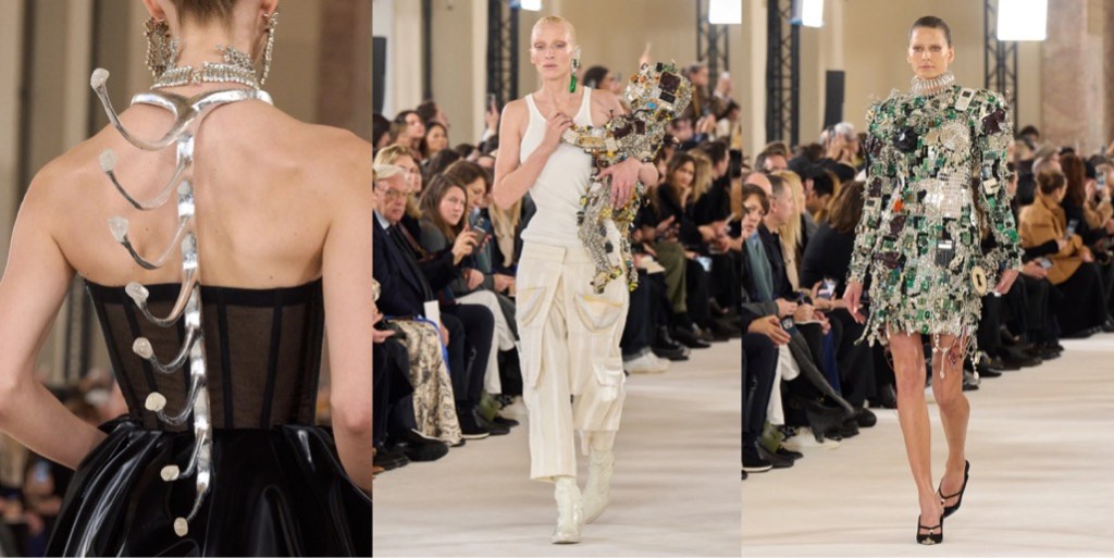 Sparking a shock effect is obvious as day for Daniel Roseberry and his vision of Schiaparelli; ultimately, it was Elsa who coined Shocking Pink. Yet there was nothing pink about the autumn-winter 2025 haute couture show. Roseberry continues to examine radical restraint – of the woman’s body, rather than the discipline of dress-making or tailoring – and this collection felt darker than usual. It referred to Schiaparelli’s late 1930s collections, which were peak surrealist – but also carried a sense of growing melancholy and unrest, as if they foresaw the upcoming tragedies of Second World War. There are many indicators that the world we know today is off to a burning, unstoppable crisis, so it’s no wonder why Roseberry is in a gloomier mood. But then there’s the shocker that lets the mind escape for moment: amidst the corseted matador suits, body-morphing padding, hourglass shapes and heavily embellished gowns, a red corseted satin dress constructed with a fake torso and breasts in the back, with a pulsating (as in for real, not trompe l’oeil) red rhinestone heart necklace hanging just below the nape of the model’s neck. The sight was both sinister and highly body horror, somewhere between “The Substance“, “Death Becomes Her” and “Suspiria“. But it also screamed: madame couture has arrived.