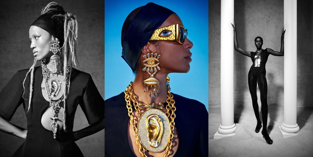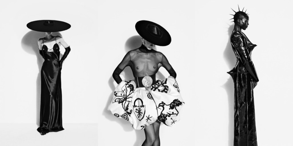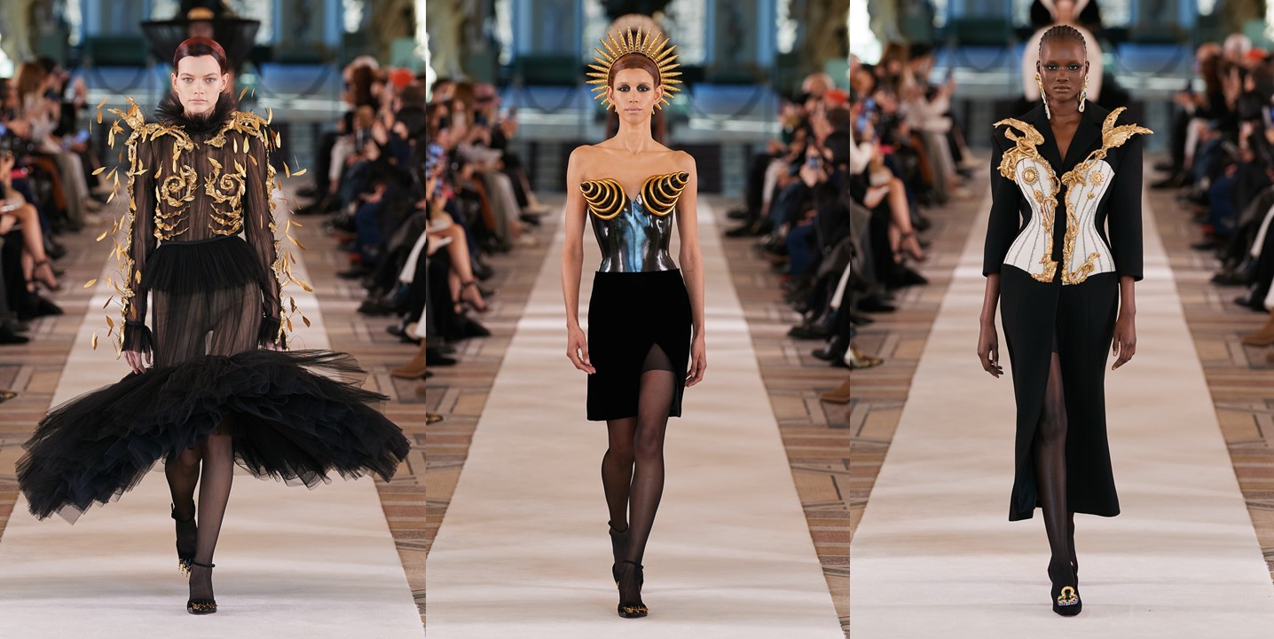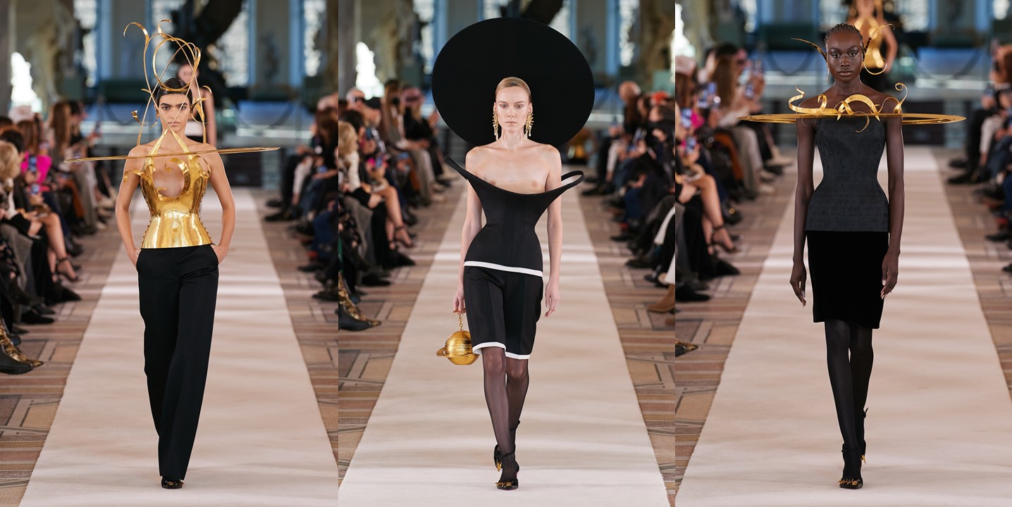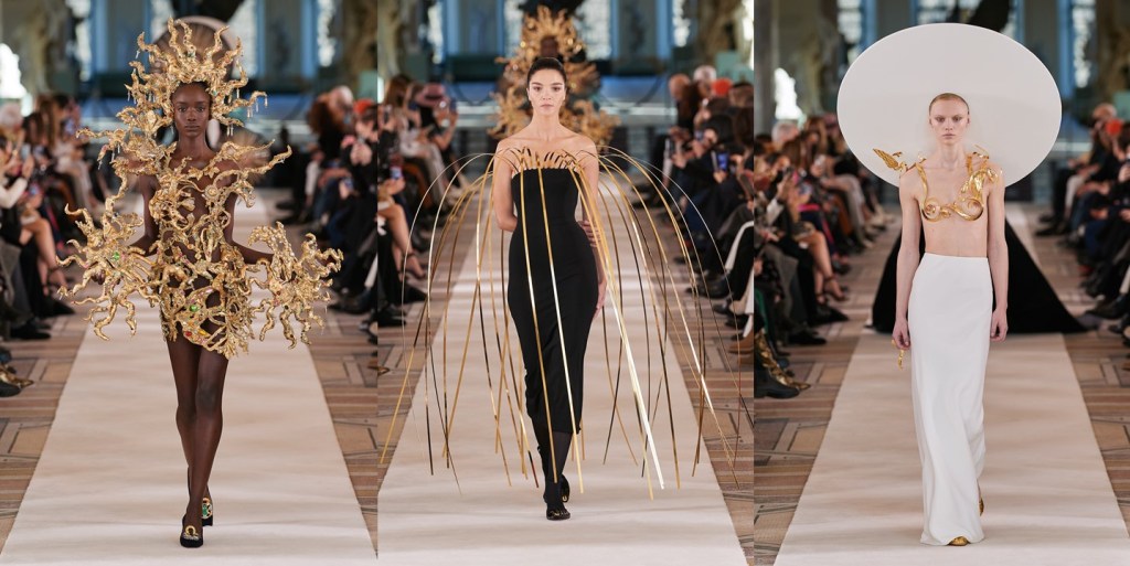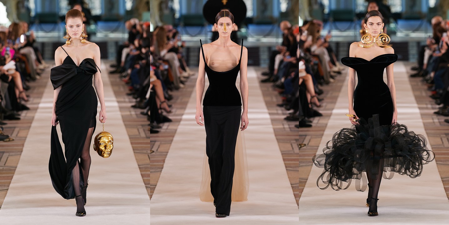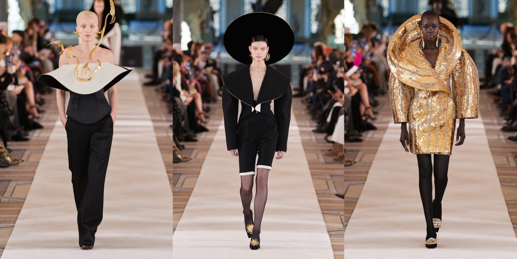 “Shocking! The Surreal World of Elsa Schiaparelli,” the high-impact exhibition opening this week at the Musée des Arts Décoratifs, includes pieces that fellow designers – among them Yves Saint Laurent, Jean Paul Gaultier, Azzedine Alaïa, and Christian Lacroix – created in homage to the house’s founding genius. For this season’s Schiaparelli haute couture collection, Daniel Roseberry, the house’s artistic director, took this idea of “being in conversation with the people who had been so inspired by her.” Earlier this year Roseberry had an in-person conversation with Lacroix himself, “which was really inspiring,” as Roseberry noted during final fittings on the eve of his show. “We talked about color, we talked about volume. We talked about Arles, and for him it meant black bulls, white horses, and the gold of the sun, which just kept ringing in my ear. It was probably, for him, a passing conversation, but for me it felt like someone plugged me into the wall a little bit, and I wanted to make a collection that brought me back to the kind of fashion that I fell in love with and that period of fashion that feels, in retrospect, very naive in a way.” And so Roseberry evoked the euphoria of Christian Lacroix’s 1987 debut collection with its giddy pouf silhouette, bustles, gigot sleeves, coruscating toreador embroideries, and severe matador hats. For Roseberry, ’80s nostalgia is in the air. But the collection was also informed, as Roseberry confided, “by the way Elsa dressed herself,” which meant rigorous tailoring. That was exemplified by the coatdress worn by Carolyn Murphy with trompe l’oeil drawers for pockets – a detail that Salvador Dalí himself conceived for Schiap and now a piece that will go directly from the runway to the museum exhibition – and what Roseberry described as “this sort of sensual body-conscious and body-obsessed eveningwear, everything built around the bustier and the corset.” Some sprouted with floral displays inspired by Carolyne Roehm’s book A Passion for Flowers, a copy of which sat on Roseberry’s grandmother’s coffee table when he was an impressionable boy. Seen up close these were remarkable triumphs of embroidery – sunflowers and roses and lavender fronds crafted from hand-painted and sequined silk and even leather molded onto the back of spoons to create the petals. They instantly reminded me of Yves Saint Laurent’s spectacular spring-summer 1988 couture show, where jackets became tableau vivants of sunflowers and irises. A simple black velvet evening dress that looked like one of Roseberry’s dramatic fashion sketches come to life was brought into Schiaparelli’s madcap world thanks to a pair of earrings dripping bunches of golden grapes and so heavy that they had to be secured with a discreet tiara hair band. Meanwhile, Stephen Jones’s magnificent wide-brimmed hats bristled with what looked like fields of wheat that on close inspection turned out to have been simulated with glycerinated ostrich feathers. It was all, as Roseberry himself promised, a “mash-up between something that felt incredibly modern and then also wildly romantic.” Hopeful doves of peace (another YSL reference) brought some much-needed optimism to 2022’s disturbing state of things. All of it certainly left the audience on a high.