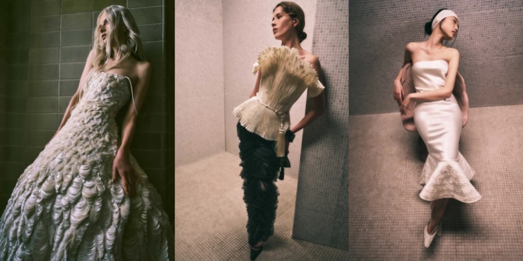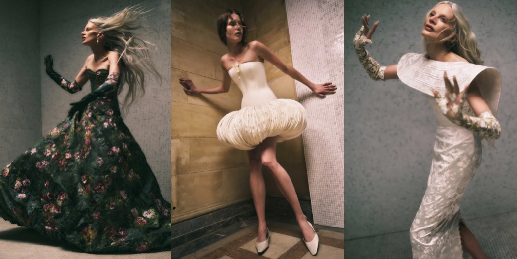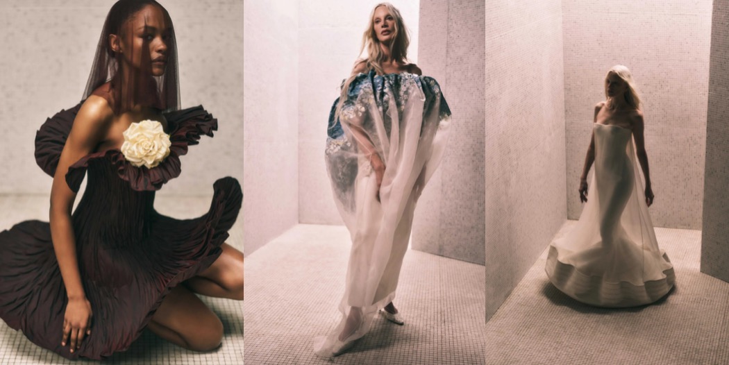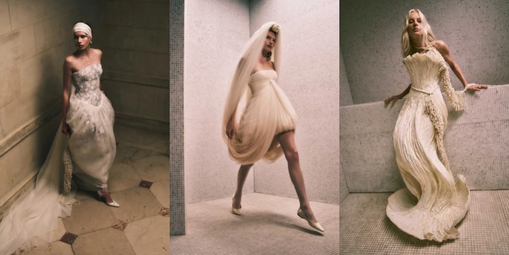 If there’s one designer that leads the bridalwear game today, then it’s definitely Danielle Frankel and her New York-based studio. However Danielle isn’t limiting her designs to weddings only; she describes her namesake brand as “a fashion label” whose “medium is bridal,” a minor yet important distinction that indeed manages to capture her stunning creative output. The latest collection, starring Italian beauty Mariacarla Boscono and styled by Vanessa Traina, is an in-depth study of texture, unique fabrications, and gesturally arranged flowers lead to a sort of accidental Impressionism. The brand’s signature interplay of hard and soft and its relaxed refinement join pointedly feminine details that are naturally mussed at the edges. Oil-on-canvas landscapes are interpreted by hand-painted petit-fleurs, watercolor prints, and sculpted blooms. Painterly brushstrokes adorn featherweight organza juxtaposed by castings of metal and clay blossoms created by artisans in Ukraine and South Africa. The introduction of silk jersey brings a goddess-like liquidity to the range, while the addition of Lyon lace elevates an exploration of sheerness and structure. Silk woven with metal fibers creates beautiful wrinkles that are meant to last rather than be pressed away; a sort of “perfect imperfection“. In a continued exploration of color for the aisle, alabaster is joined by patinaed rust, hibiscus, citrus, pale chrysanthemum (Frankel’s favorite) and various shades of ivory. Degradé-dyed and pearl-tipped organza fringes mimic grasses in the hand-brushed expanses that inspired them. This really isn’t your average bride-to-be wardrobe.