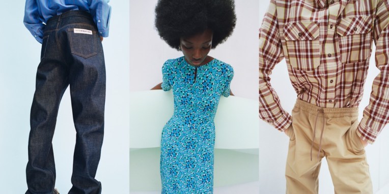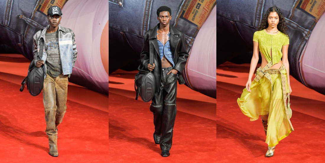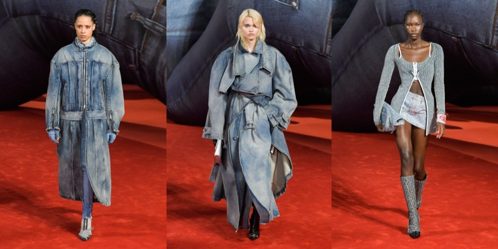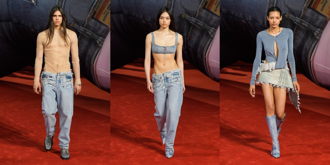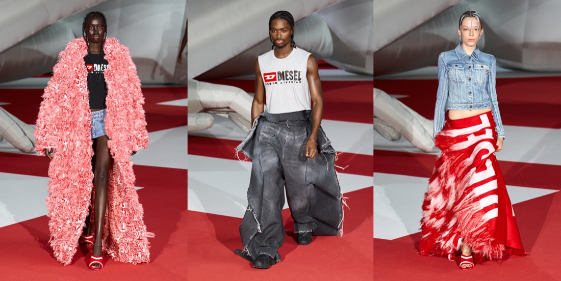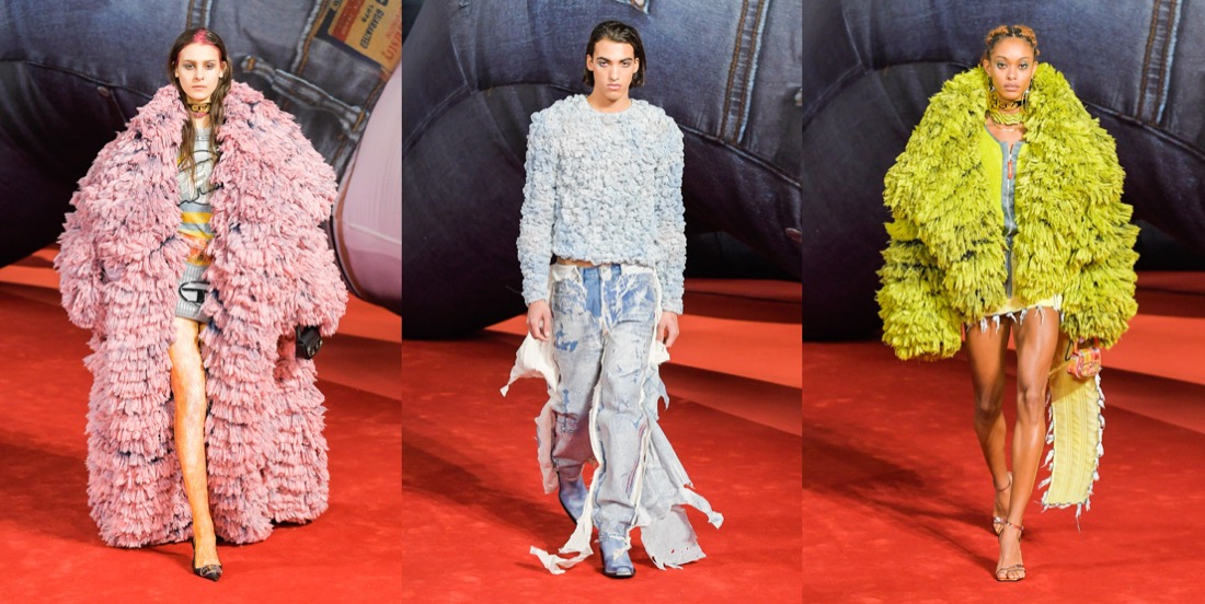 Martens said the collection was divided into four chapters: denim, utilitywear, “pop,” and “extravaganza.” He added: “This is my recipe for Diesel; the four ingredients that I insist upon. Because this is only my second show here, and I think we need to keep showing it.” He said one overlying characteristic of the collection was distress: “All of the pieces are ‘imperfect’ through treatment and design. This is something I like, but it also goes back to that democratic instinct. We know Diesel is a brand for anyone who wants to relate, whoever they are, however they feel; everyone is individual and no two people are the same. Plus the piece is supposed to look ‘broken’ so that you can live with it forever – it is unbreakable.” Diesel’s denim expertise was on full display in this offering. It came layered in tulle, interwoven with lace and organza, or spliced into corsetry. The washes and treatments were manifold: Encrusted with croc-print overlays, reverse-sun-faded, garment-dyed into multiple colors. There was denim jersey and knit denim and flocked denim and fringed denim. Utilitywear included a two-tone olive bomber-and-pants menswear look and a long washed cargo dress, plus a series of nomadically postindustrial ragtag jersey ensembles – streetwear for the postapocalypse. Pop delivered acid-toned racer-back or spaghetti-strap minidresses sometimes garlanded with florals and contrast-colored lace. There was a hilarious black leather moto ensemble that seemed like it had previously been made to fit two wearers at once – back to those conjoined figures – before the second wearer had cut himself free to escape. Martens’s Velcro-fastened strap miniskirt returned in silver, as risky as before. A frayed logo jersey tank top and boob tube – both logo-printed and worn over some trompe l’oeil double-bonded denim pieces in black – signaled the extravaganza. This included two exploded bouclé coats made from torn and tufted Diesel-print fabric and a final, triumphantly tattered house-logo-print skirt south of a trucker.