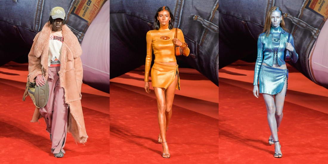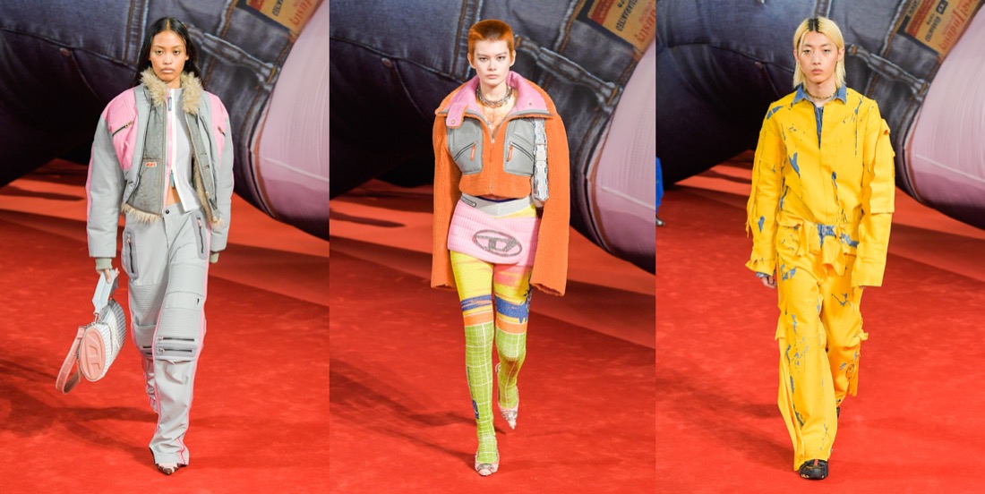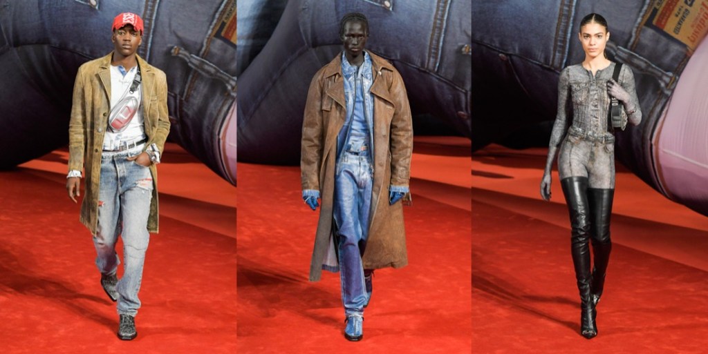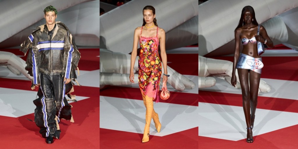The energy at Diesel‘s spring-summer 2023 fashion show was… big. The brand’s creative director, Glenn Martens, claimed that the four inflatable human figures that straddled both each other and the middle of the monumental runway had been certified by Guinness World Records as the largest ever recorded. It was difficult to get an overview, but from my angle they appeared erotically intertwined. That Martens’s invitation came for the second season in a row accompanied by a sex toy – this time a big glass butt plug – further stimulated suspicion that this was their position. Another big statement was the number of people who could attend the show: about 3,000 people had bagged their free tickets online, while a further 1,600 were reserved for students. Most of the 200-ish remaining were there to work or influence. Since his first season at Diesel, Martens has been charged with revitalizing and democratizing Diesel. Fittingly enough, this is partially driven by Renzo Rosso’s ambition to take his company public. Whatever the motivation, this stadium show was powerful evidence of Diesel’s new audience.