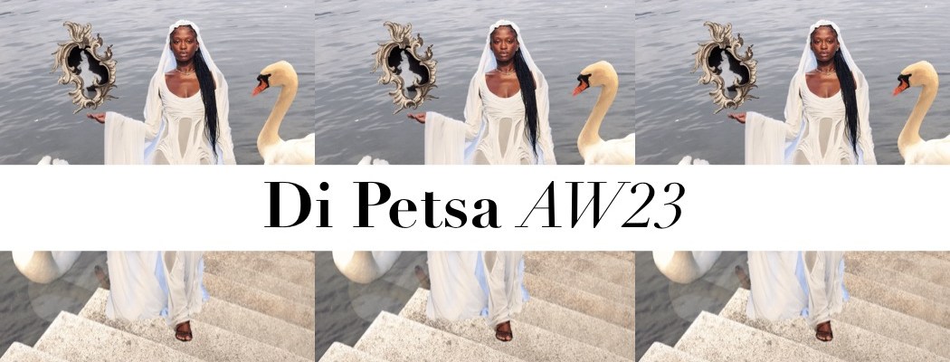 London Fashion Week started with a moving memorial service for Vivienne Westwood. The spirit of the Dame is in the air, and it just makes you reflect on how the late designer pushed London to being the place for emerging designers with off-kilter style to start their careers and evolve. Like Dimitra Petsa, who with every season makes the fashion industry fall harder in love with her ethereal world. Inspired by her Greek heritage and its ancient mythologies, Di Petsa‘s designer looked to the story of Persephone for autumn-winter 2023. For those unfamiliar: she was the daughter of the goddess Demeter, who was abducted by Hades, and then later became the queen of the underworld. With the collection, titled Breaking and Healing, the designer wanted to honor the growth and transformation that Persephone has experienced. Petsa was on her A-game with her latest offering, whether it was her popular wet-look illusion dresses, which have been elevated in Lycra and silks in dark hues, or the placements of healing crystals like clear quartz – to encourage “tenderness, and letting go” – as decorative features on dress straps and headdresses. Elsewhere, paneled leather and velvet were sensuously placed like mosaics on mesh dresses, a new technique for the brand. In a continuation from last season, Petsa developed new twists on maternity styles, only this time, certain pieces were designed for those who want to be “pregnant with themselves,” via corseted hand-embroidered bumps. Knitted denim separates with frayed panels inserted vertically also stood out as a strong moment. For the finale, she showed a cut-out silk chiffon dress that featured corset boning wings, a silhouette that elevated (quite literally) her otherworldly sensibilities.