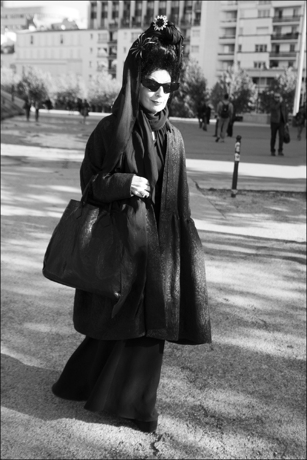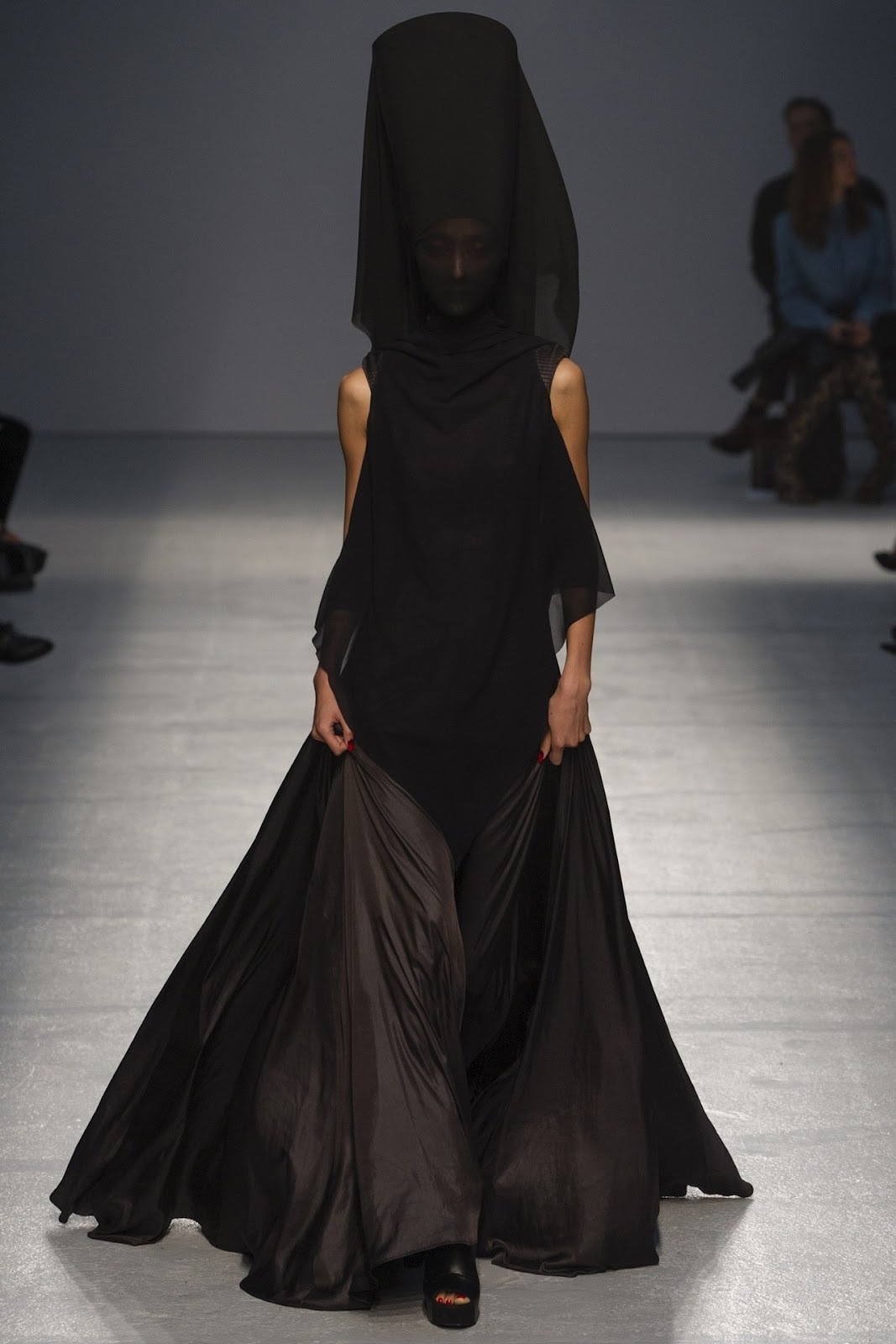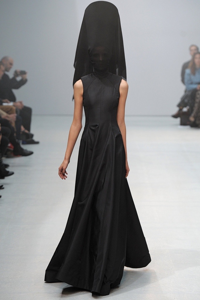As for the clothes, it’s all about the quintessence of Demna’s trademark style: humungous tailoring, oversize hoodies and jeans, sinister leather coats and military camouflage were represented. So were plissé evening gowns, floral prints, bathrobes, motorcycle leathers. Vintage trenches and bombers were cobbled together with four sleeves apiece. Multiple evening gowns were made from multiple old evening gowns—black velvet, fuchsia satin, glittery gold. Demna’s jokey accessories were everywhere: Balenciaga sneakers grown even more absurdly vast than ever; supermarket grocery totes reproduced in leather; marabou-trimmed men’s kitten-heeled boudoir slippers, and hand-carried shoes converted into clutch bags. With all his favourite people on the runway – starting from Cathy Horyn and Renata Litvinova and ending on Elizabeth Douglas and Amanda Lepore – it seemed that Demna was truly proud of the collection. “What I showed today was probably my most personal and my most favorite collection, because it was about me; it was about my story.”