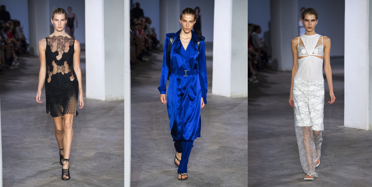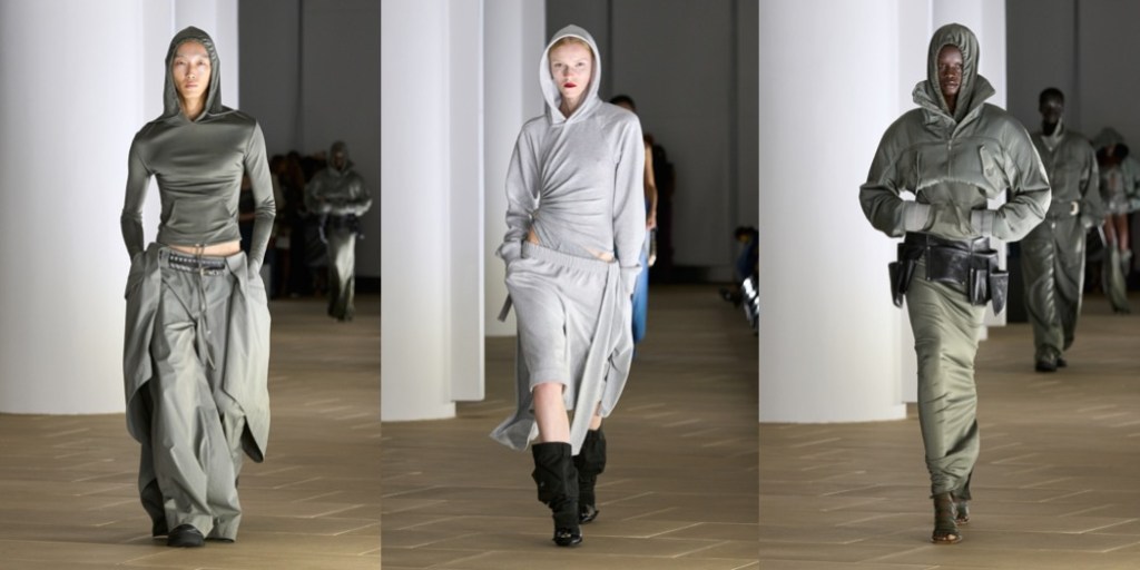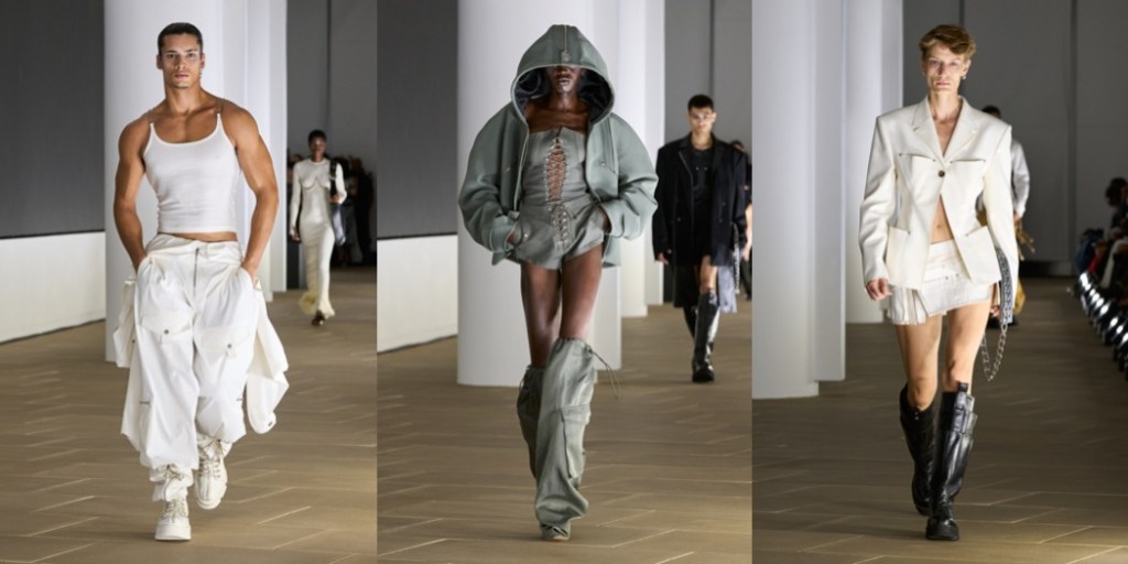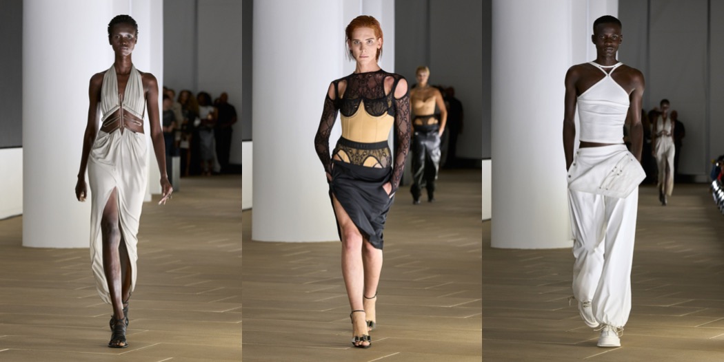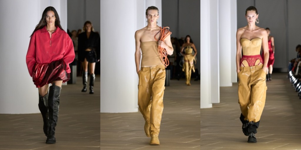 What I appreciate about Dion Lee‘s work is his consistency – a word that so many other New York Fashion Week designers should learn. His spring-summer 2024 is sexy and bold, and with wit. “This season was primarily about evolving the utility and construction language I’ve been playing with until now,” the designer said. What’s compelling about Lee as a designer is his ability to both fixate and expand on a specific theme while managing to keep his clothes distinctly true to his style. The Australian creative mentioned he started playing with power cords as a way to drape for his autumn offering, which carried over into this collection in the shape of shirring details by way of bungee cords. Particularly fun was a pair of trousers that had its back label replaced with an outlet; the model walked down the runway plugged in, carrying his coiled orange cord as a shoulder bag. Elsewhere, Lee laminated denim and introduced foiled leather for a sleek hint of texture. The latter was used in bubble-hem skirts and dresses, which added a welcome variation of shape. Also cool were his lace lingerie-like explorations; they felt freshest where they fell weightless around the body rather than constrict it.