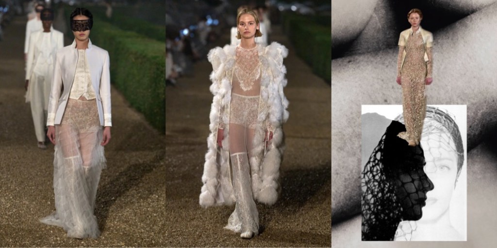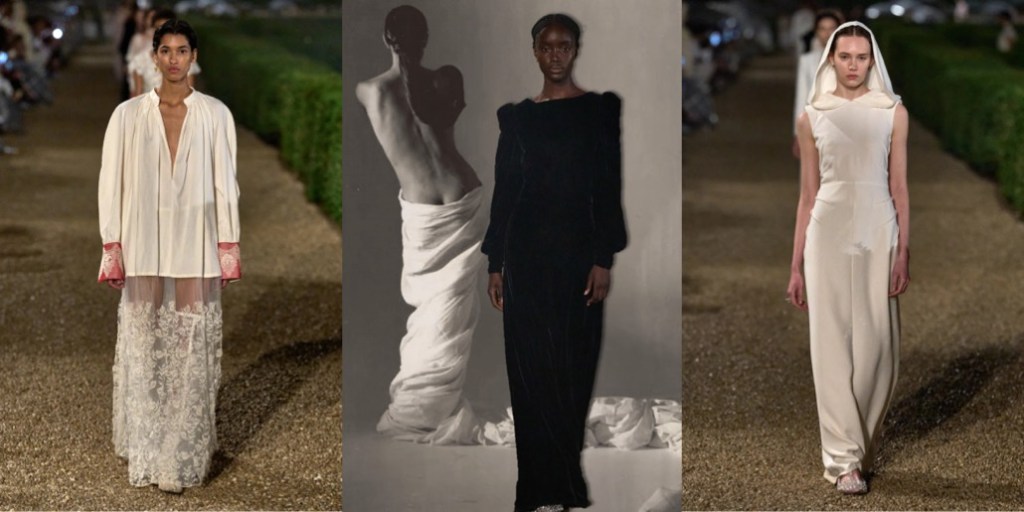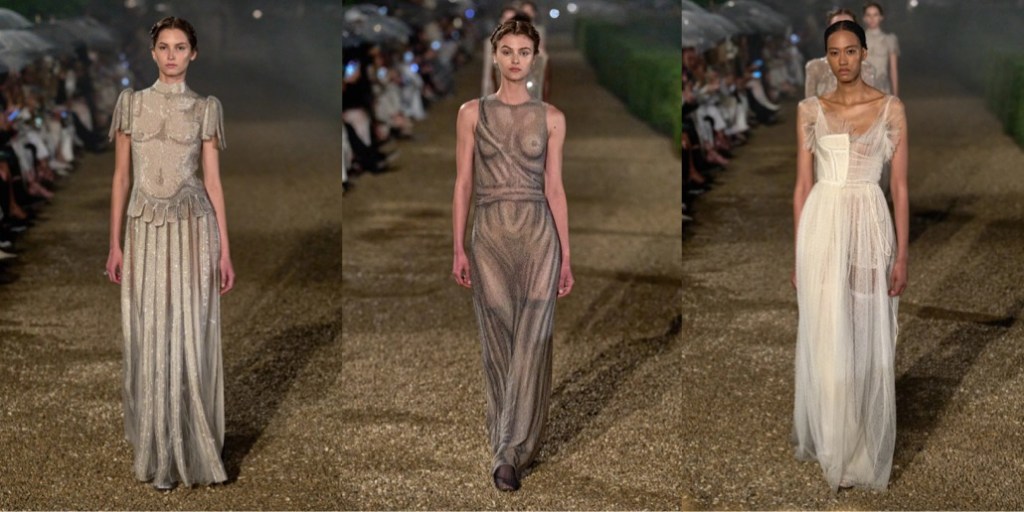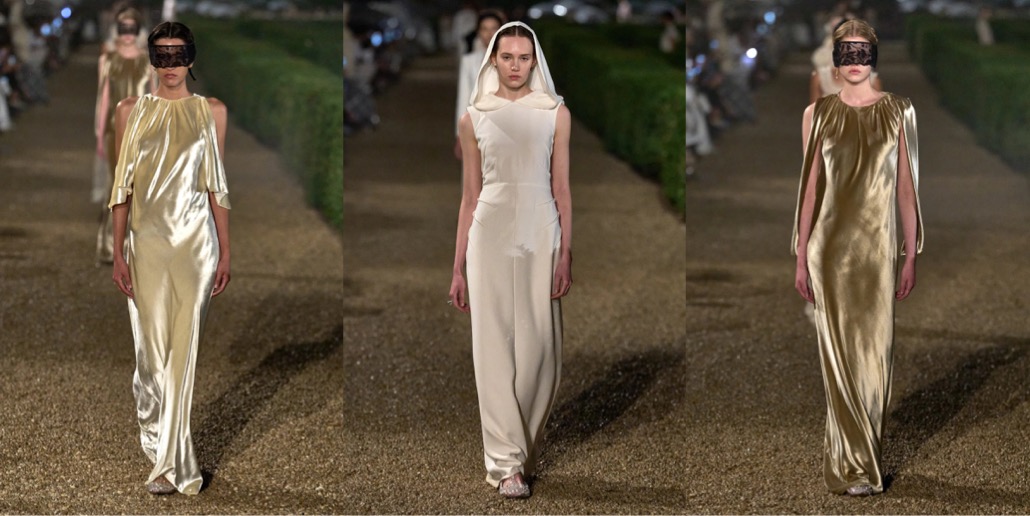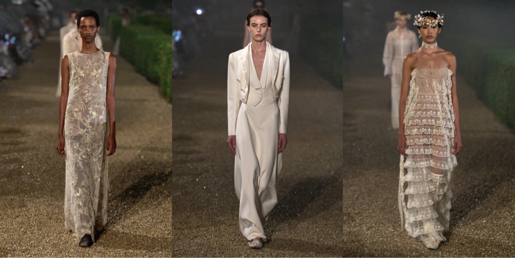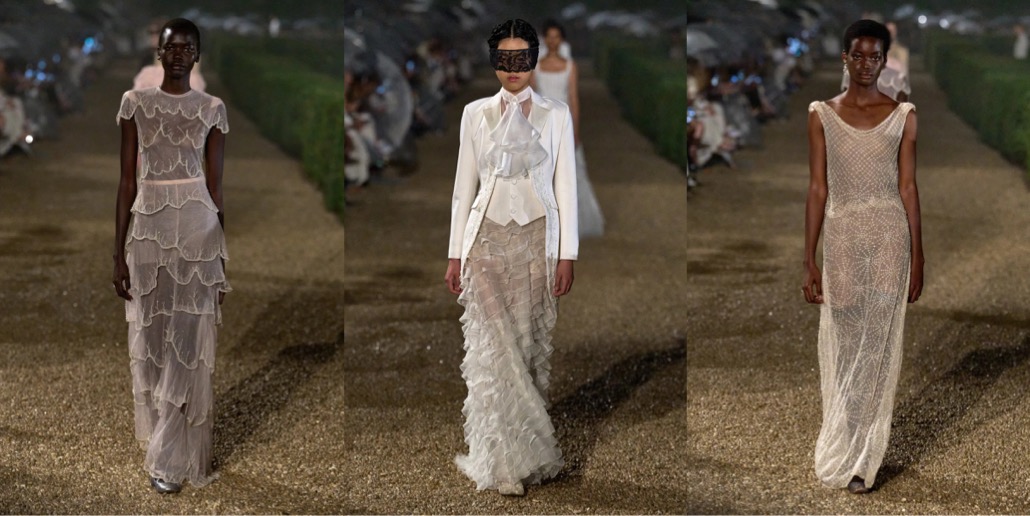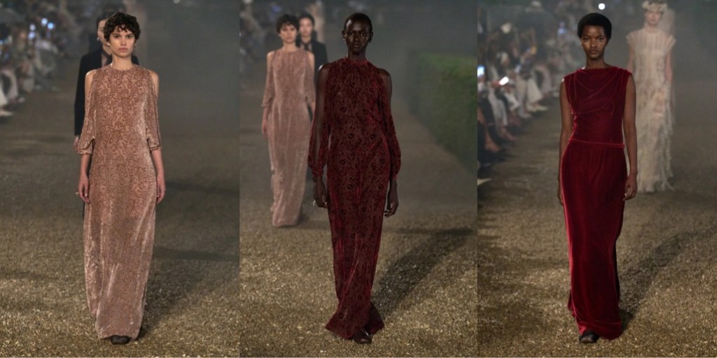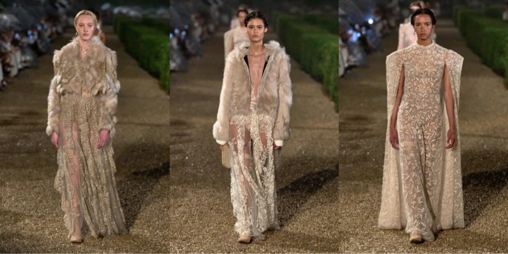 In a way, it seems to me that Maria Grazia Chiuri truly refound herself at the very end of her tenure at Dior. Her pre-fall 2025 show in Tokyo had a spark. Her swan song outing, for resort 2026, presented in the enchanting garden of Villa Albani Torlonia in Rome, was powerful in its grace. Those velvet column gowns are pure delights, just as the remarkable fur coats that are actually made from plume. The collection’s opening look, a masculine white tailcoat worn with a maxi-length, matching skirt, is the absolute essence of Maria Grazia Chiuri’s contribution to fashion, in past misguided by unfortunate styling or simply obscured under all the gimmicks of fashion show spectacles. This ideal, minimalist yet sumptuous simplicity was followed by many variations on the theme of the long, slim, semi-sheer dress. The lace effects were almost countless – 3D florals, rivulets of ruffles, leafy cut-outs, wavy art deco frills, gilded latticework covered with silken fringe. Underwear visible, shoes flat. A statement.