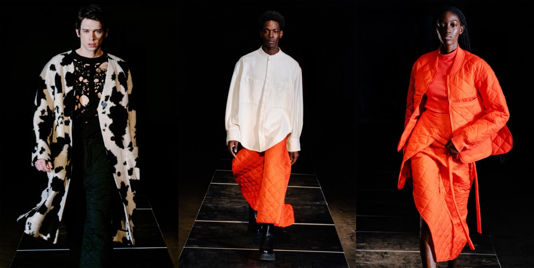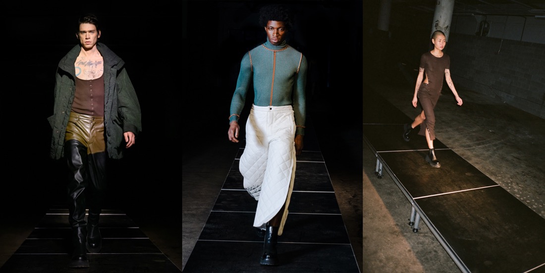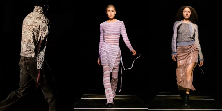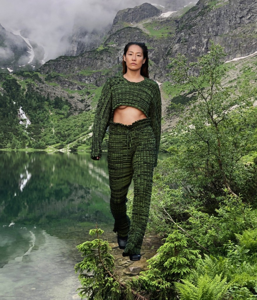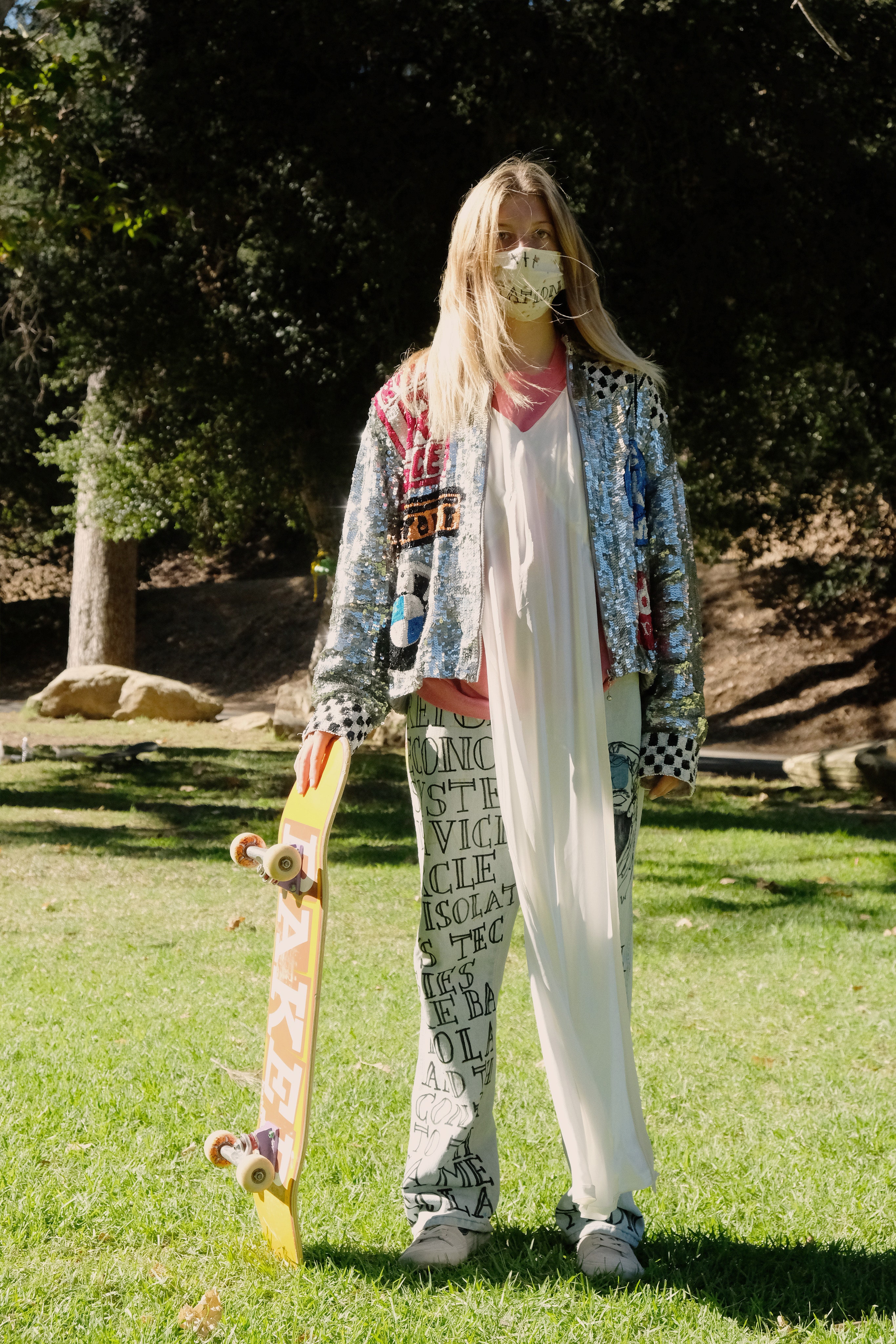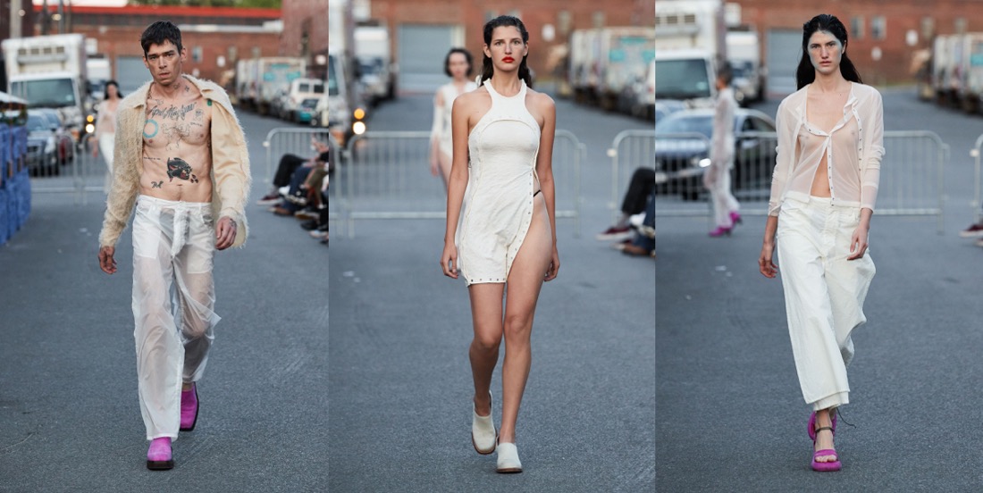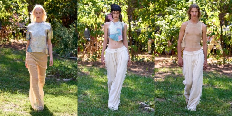 The vibrant Eckhaus Latta spring-summer 2023 show took place in one of those lush and beautiful gardens that you can’t believe actually exist in the middle of the city. As models walked out in geometric metallic knit tops that glistened in the sun like tinsel, their faces shiny like doughnuts (turns out it was a peel-off face mask), it was clear the buoyant mood felt before the presentation wasn’t just on account of people running into each other after not seeing them for a while, but it was what Mike Eckhaus and Zoe Latta actually wanted everyone to feel. “I think this season we felt rather optimistic and wanted that to be expressed within the clothing,” Eckhaus said backstage after the show. “I feel like there’s been this general sense of apathy that we, our community, or just our friends have been feeling,” Latta added, picking up the beat immediately. “This is kind of an attempt to be like, ‘It is still chaos. The world still feels a little fucked, but let’s have fun.’” There was joy in Hari Nef’s cream slip dress, adorned with embroidered threads covered in beads that click-clacked this way and that as she walked through the grass. Musician Ethel Cain, wearing a proper ecru cropped bouclé jacket (and matching wrap-around skort) with a “Fear no plague” tattoo right in the middle of her sternum, was cheeky. No, wait, actually cheeky was Jacob Bixenman’s burgundy bubble polo shirt, worn with what looked to be a one-leg pant that exposed exactly half of the model’s buttocks. Silhouettes were slightly oversized and gave the illusion of being askew; attention was paid to the back of the garments as much as the front with image placement, interesting pockets, and other details. “It’s a sense of wanting that fullness,” Eckhaus said. “I feel like we’re so accustomed to images now – the front image – but clothing is 360, and we wanted to have that juxtaposition of what you’re experiencing on the front of the body versus the back, having it feel more rounded or having different types of energy that move back and forth.” Every look appealed to the senses, with textures that were begging to be touched and played with, like cool netting turned into a long dress with a straight neck and ruched detail on the front, or floral-embroidered trousers with what looked to be a built-in skirt on top and tassels running down the sides. “We wanted a lot of tactility in the collection with the textiles that we’re using across the board,” Eckhaus said. “Whether it was how images were placed on clothing, how materials transformed, like in the knotted pieces and the bubble fabrics, but not getting too – as we always joke – ‘project-y,’” he said, laughing, before adding, “But then I feel like, if it does get project-y, whatever. We’ve been doing this for a while, and we feel really confident in the times when we do have those gestures.”