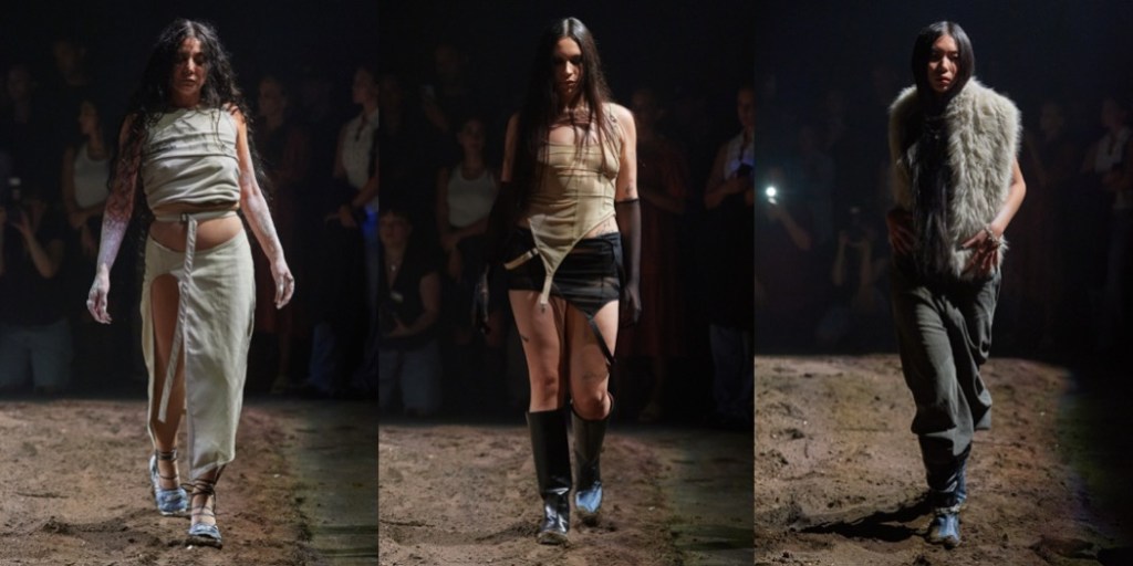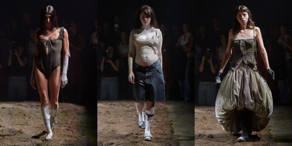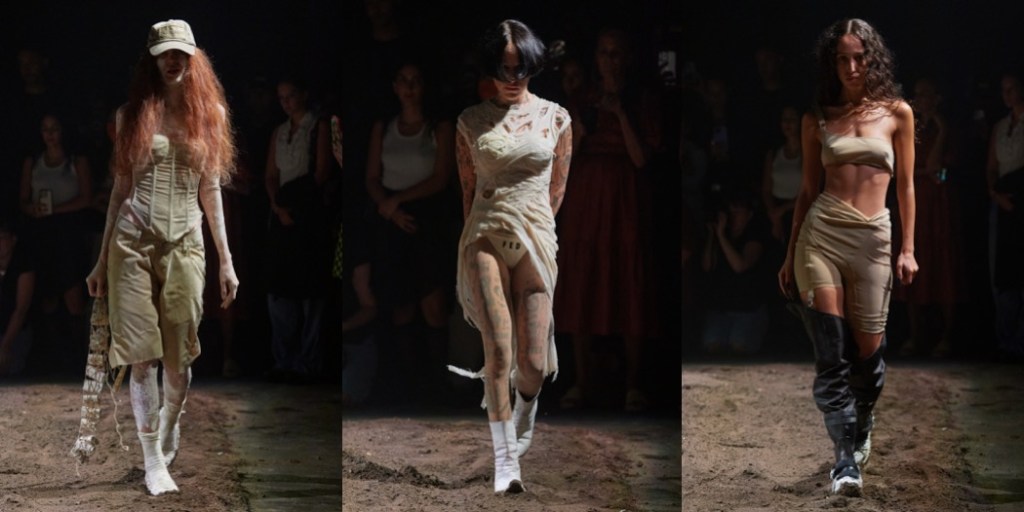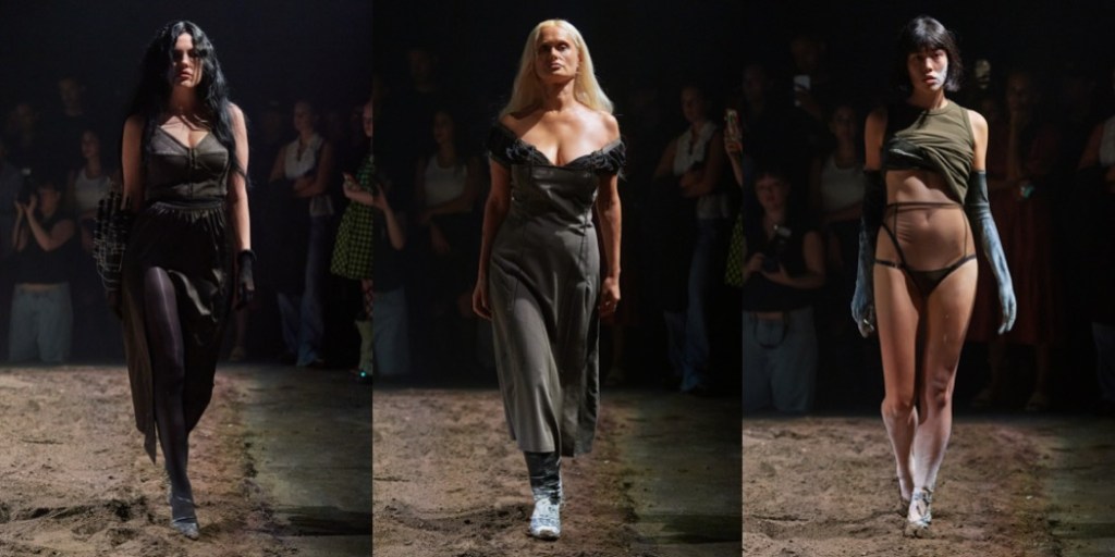 In the sea of New York Fashion Week’s collections that deliver mediocrity mixed with business, Elena Velez is an outlier. She is here to disturb the peace. And the system. The spring-summer 2024 fashion show took place at a warehouse in Bushwick. After the finale walk, a handful of the models started a mud fight. Some guests got splattered. Velez enjoys creating such discomfort. The designer gave no interviews after the show. She wanted the spectacle to speak for itself. Instead she let her press notes do the talking. “Where are our antiheroines?” she asked, adding that the collection, titled The Longhouse, was a “ritualistic catharsis to the coddling, histrionic, and moralistic ills of oversocialization.” Maybe the mud fight was a visual representation of our online interactions, which often lack nuance and have little care for context. Velez went on to state that the show was a “creative interpretation of the reorganization of contemporary society around feminine expressions of control and behavioral modeling” and a reaction to a “climate of post-progressivism where resistance to a monolithic cultural paradigm is intensifying.” It’s hard to unpack these ideas. What was clear was Velez’s commentary on contemporary womanhood. “It feels to me like the sanitization and unilateralization of womanhood in popular culture today leaves no room for the nuance and multiplicity we deserve as architects of labyrinthine interior lives,” she wrote. In short, and in plain English, her point is that women can be good and evil, kind and angry, soft and rugged, and passive and aggressive. Velez offers them eveningwear that remains as compelling and striking as ever; a standout was an askew and elongated corset that melted onto the body with a draped skirt covered in silicone latex. But most fascinating were her commercial propositions: waffle-knit tights, zip-up bustiers, canvas jackets and shirting constructed with seams and darts inside out, layered T-shirts, and a terrific cropped bomber jacket with its bust cups slashed in half. You want to meet the woman who wears Velez’s clothes; you might fear her, but you also want to befriend her.