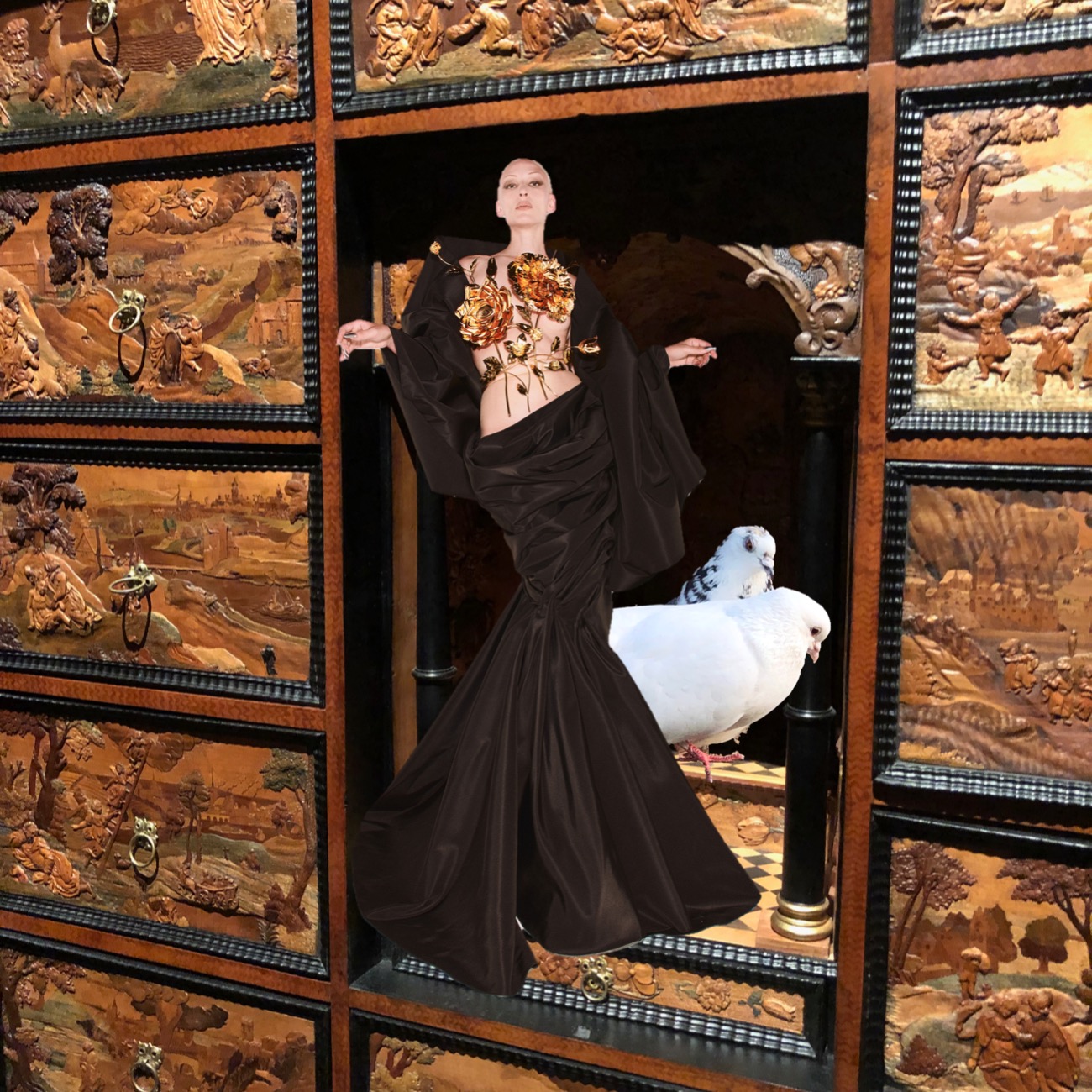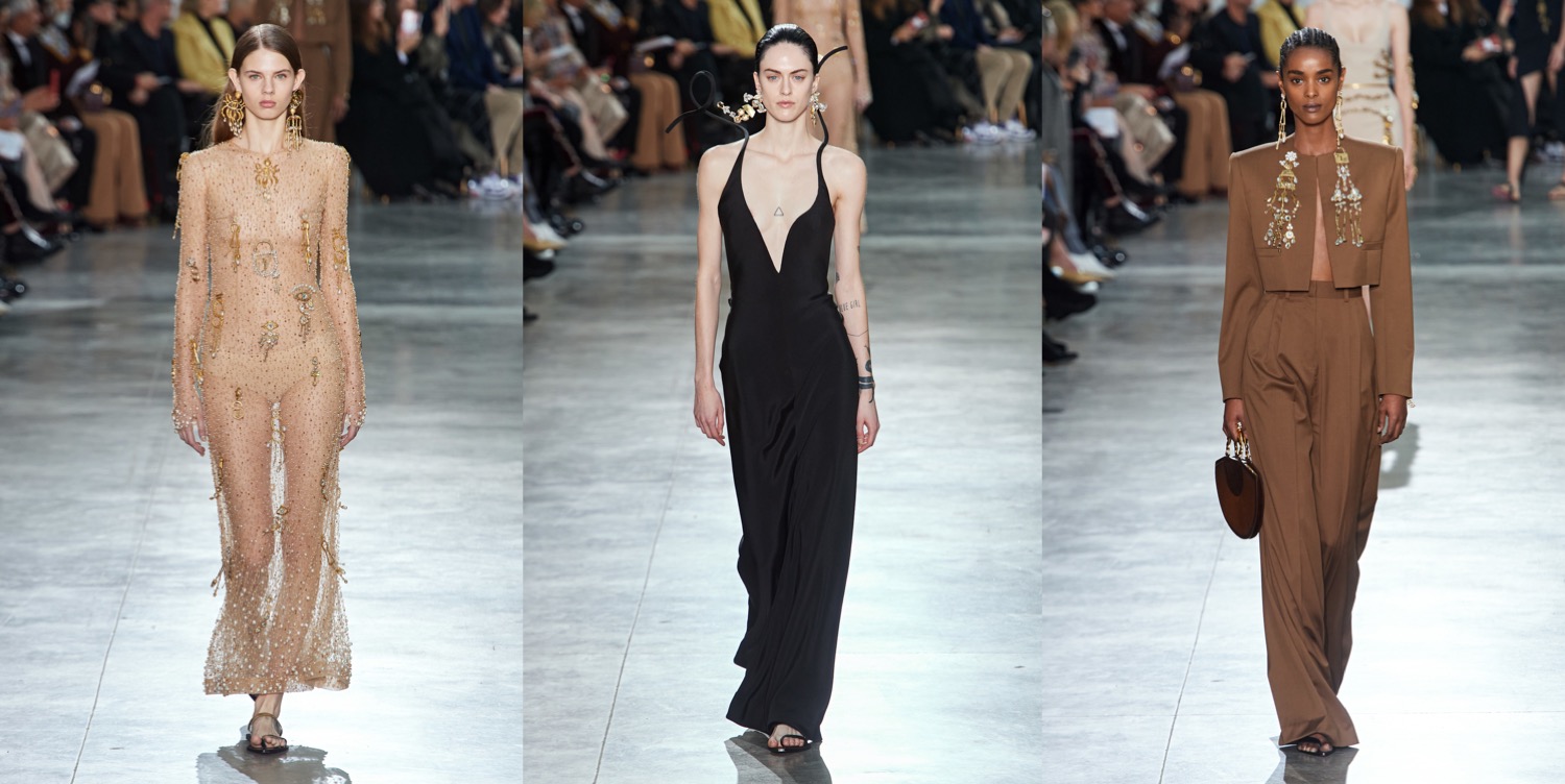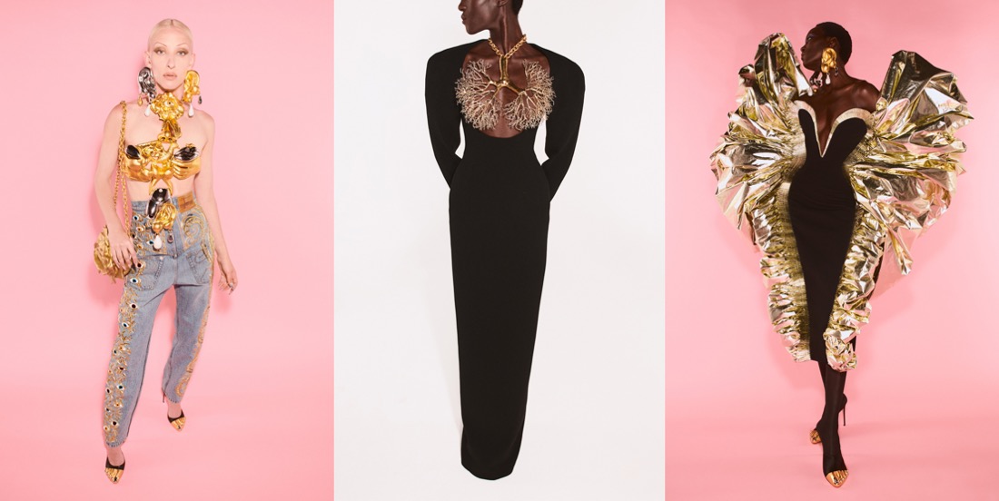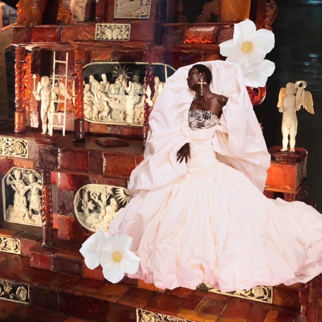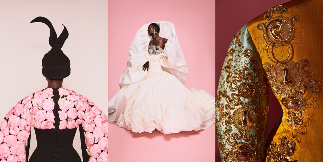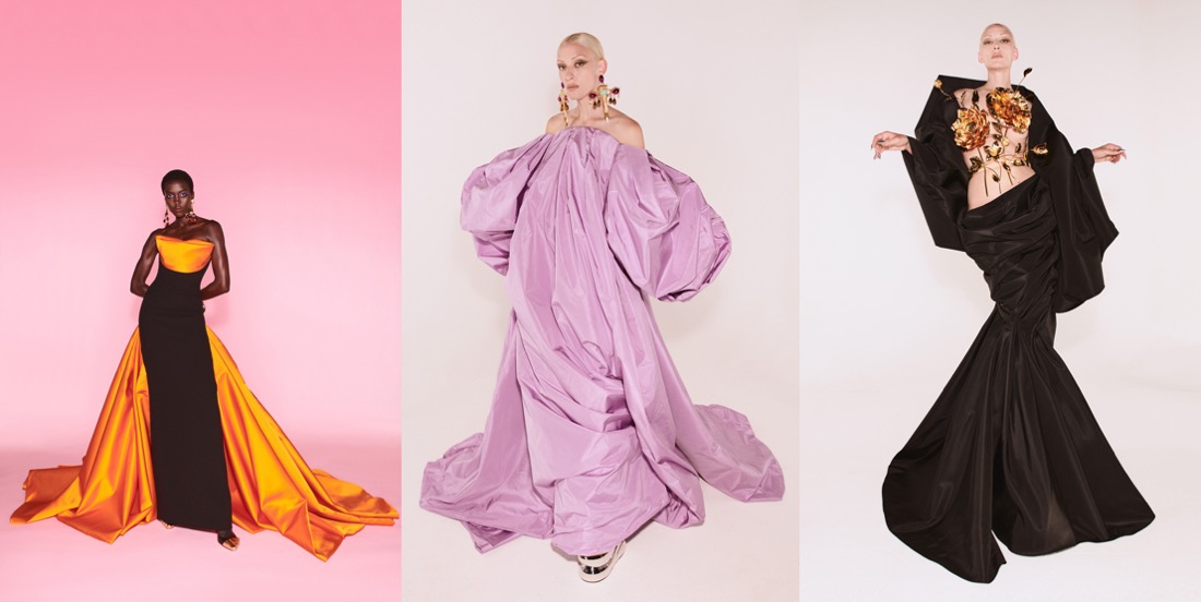 “In difficult times fashion is always outrageous“, Elsa Schiaparelli once said. Daniel Roseberry believes so as well – his latest, fabulously dramatic haute couture collection for Schiaparelli is the best proof for that. Visitors at the brand’s Place Vendôme salons are greeted by a lavish wedding gown. Typically, couture shows end with the bride, but Daniel Roseberry gave pride of place to the dress constructed from 70 meters of white cartridge pleated taffeta. “We’ve had so many requests from clients who come looking for this irreverent grandeur that we’ve been doing,” he said. Roseberry’s bride is not the shy, retiring type, but she is representative of what the designer described as the “new kind of prettiness” he was after this season. If this collection is as intense as his past outings, it’s a shade or two less irreverent. There are none of the molded leather six-pack abs corsets that were the defining looks of his last couture, for example. He came at prettiness in several different ways. Following on from that entrance-making bride is a salon devoted to embroidered jackets. These borrow as much from Lacroix and Jean Paul Gaultier as they do from Schiaparelli, with their curvaceous shapes, Versailles colors, and cone bra references. One black jacket blooms with pink silk roses, an ode to a collaboration between Schiap and Jean Cocteau circa 1937. Others are embellished with decades-old gold Schiaparelli threads that the embroiderer Lesage had saved in its stockpiles. All of them are trophies, perhaps especially the denim jacket that’s patch-worked from 11 pairs of used Levi’s sourced at a local vintage store – the very essence of haute friperie. Where this season’s jackets have a delicious propriety, a sculpted gold flower corset worn with a skirt barely clinging to the hips, and a scoop-front dress with a breastplate made of gold-dipped bronchi – the lungs being a locus of our attention in the pandemic – are more provocative. A silver bustier is accessorized by a fringed stole made from shredded black garbage bags, of all things. That’s couture heresy – and fabulously so. For the dessert, a cocktail dress punctuated by a shocking pink rose, a strapless black gown featuring a bust-line shaped like fiery orange lips with a matching train, and a voluminous infanta gown in a shade of lavender Roseberry said that he’s never used before. In his two years at Schiaparelli, he’s only doubled-down on the surreal glamour this historic house is known for. Turns out, he’s very good at pretty, too.