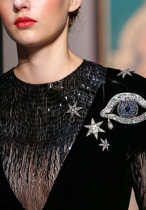 Bertrand Guyon has his second season at Schiaparelli finished, but it still seems that he needs time to show his audience who he is. The signatures of Elsa Schiaparelli are so characteristic that it’s surely hard to make your personal style the first privilege – even though Marco Zanini, the predecessor of Guyon at the brand, was nearly there. The idea behind the haute couture spring-summer 2016 collection, or rather a thematic find from Elsa’s archives, was celebration of food and the family meal. The topic of food was significant for the legendary designer – in her autobiography “Shocking Life“, she stated “eating well gives a spectacular joy to life and contributes immensely to goodwill and happy companionship. It is of great importance to the morale.” Indeed, the nearly minuscule details and bejewelled embroideries, created in collaboration with Maripol, looked joyous. The adorable cherry was hooked over one nipple, while an evolution of a “breakfast egg” had been humoristically presented in form of jacket buttons. Bertrand and his team proved that craftsmanship is the maison‘s specialty – the blazer above was ornamented with a wheat plaiting technique, known to the best Parisian ateliers only.